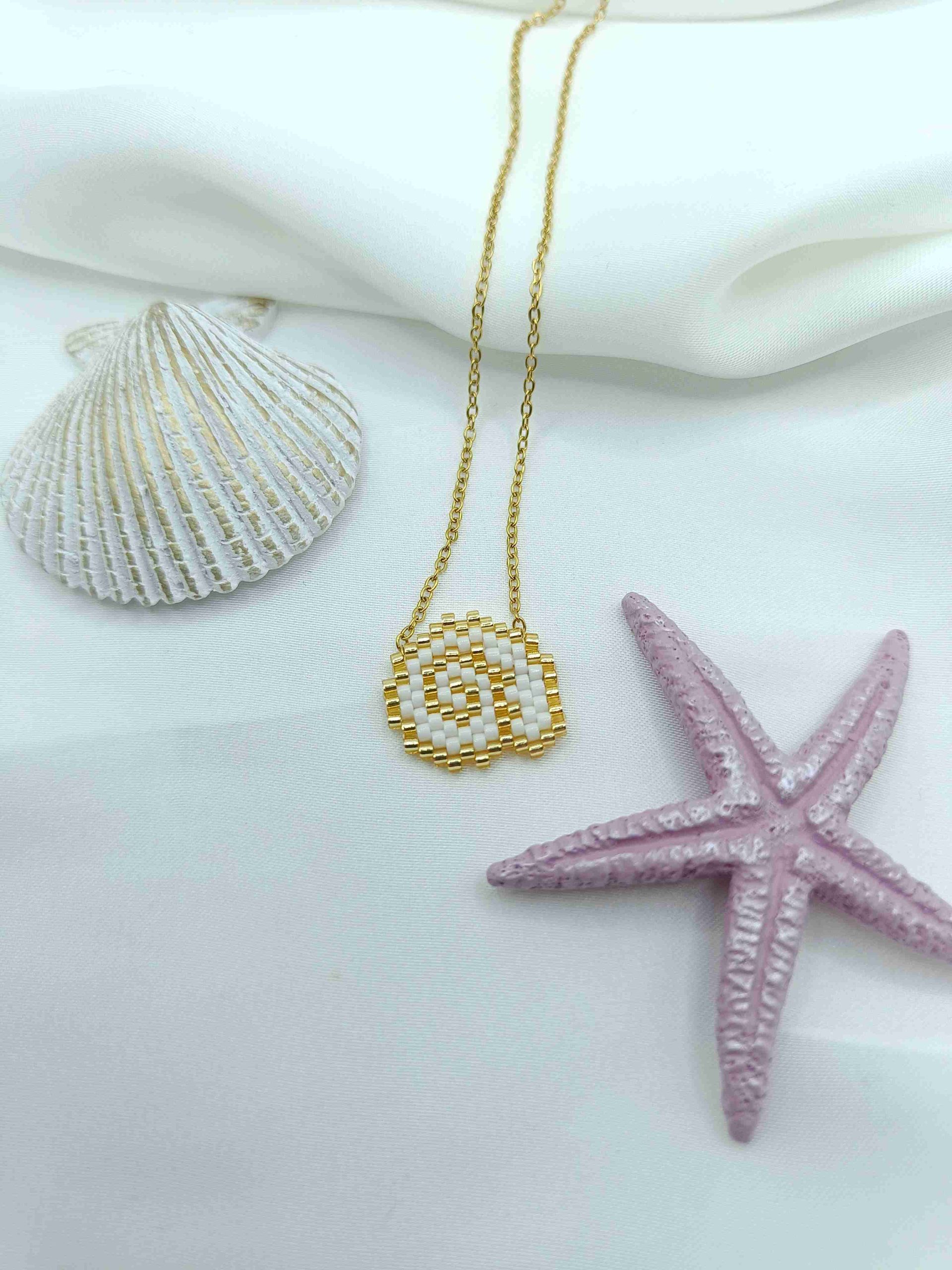 Λευκές, χρυσές και κομψά δεμένες χάντρες συνθέτουν το μενταγιόν του κολιέ Aelini, σχηματίζοντας ένα ιδιαίτερο κοχύλι σε σπείρα – που θυμίζει μικρό θαλάσσιο σαλιγκάρι. Η χρυσή αλυσίδα αναδεικνύει το χειροποίητο στοιχείο, δημιουργώντας ένα κόσμημα που ισορροπεί ανάμεσα στο παιχνιδιάρικο και το διαχρονικά κομψό.