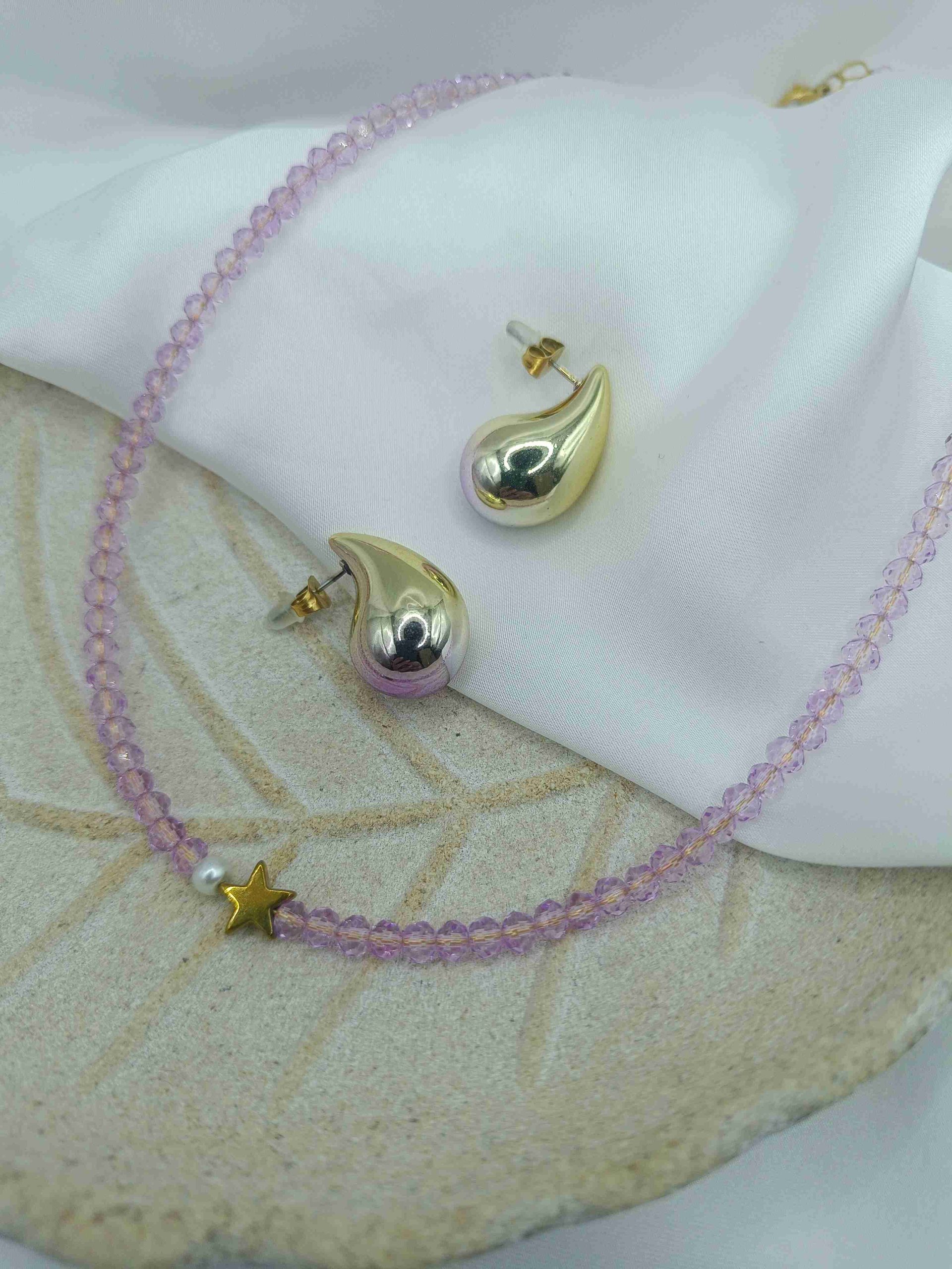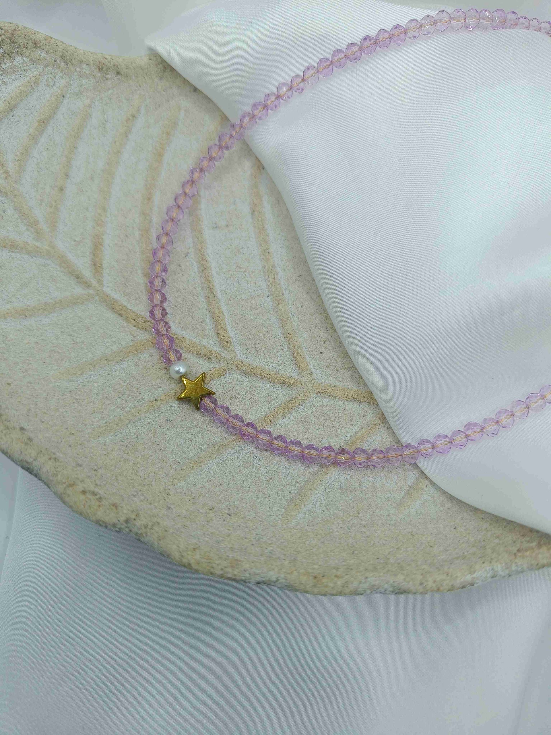 Το Aeris είναι ένα μοναδικό, χειροποίητο κολιέ που αποπνέει ρομαντισμό και κομψότητα. Οι λιλά χάντρες δημιουργούν μια απαλή, ονειρική αίσθηση, ενώ η λευκή πέρλα προσθέτει διαχρονική φινέτσα. Το χρυσό αστέρι από αιματίτη ολοκληρώνει το σχέδιο με μια διακριτική λάμψη, κάνοντας το ιδανικό για κάθε εμφάνιση.