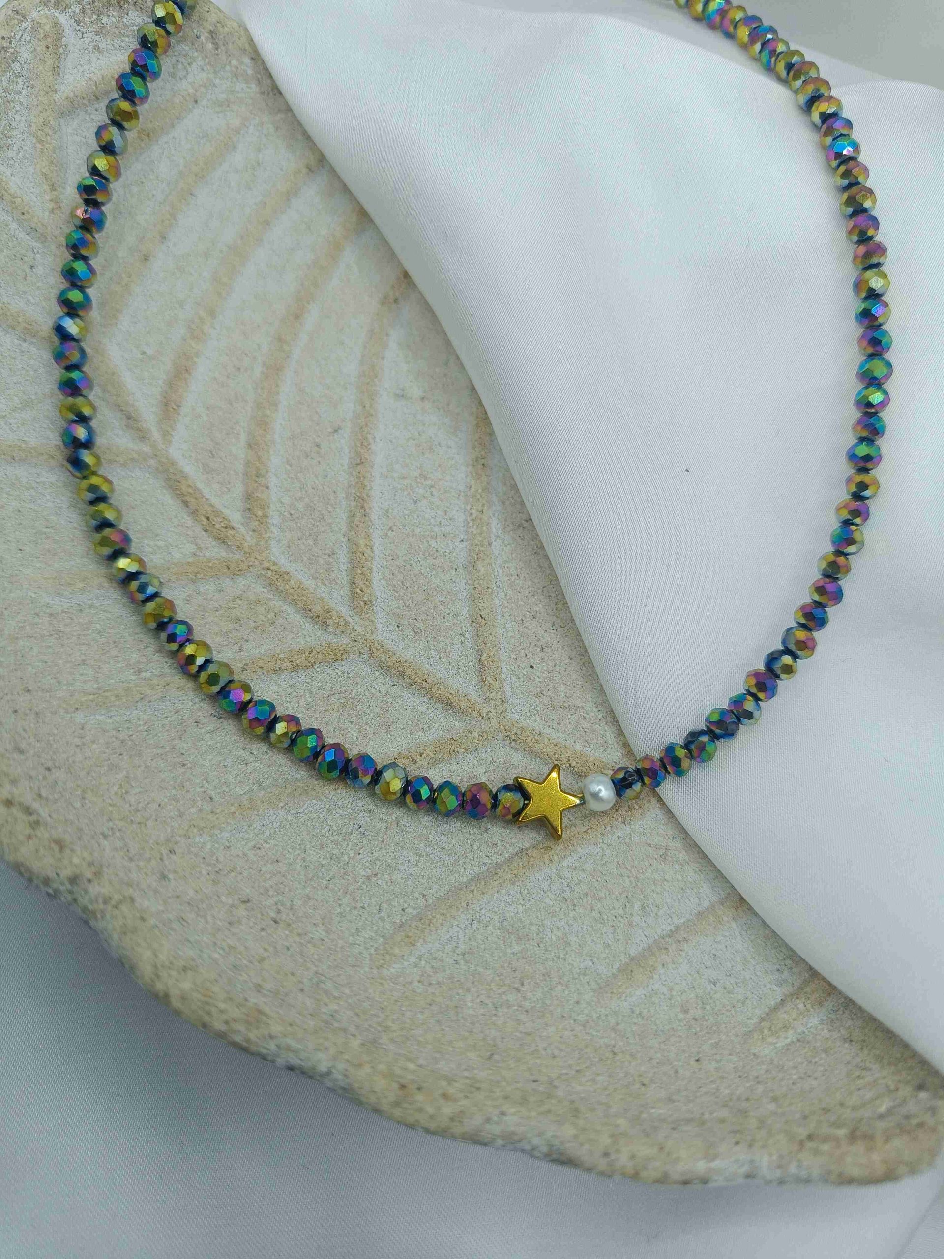 Το Aeris είναι ένα μοναδικό, χειροποίητο κολιέ που αποπνέει λάμψη και κομψότητα. Οι ιριδίζουσες χάντρες του αντανακλούν αποχρώσεις πράσινου, χρυσού, μπλε και μοβ, δημιουργώντας ένα εντυπωσιακό εφέ που αλλάζει με το φως. Η λευκή πέρλα προσθέτει διαχρονική φινέτσα, ενώ το χρυσό αστέρι από αιματίτη ολοκληρώνει το σχέδιο με μια διακριτική πινελιά λάμψης.