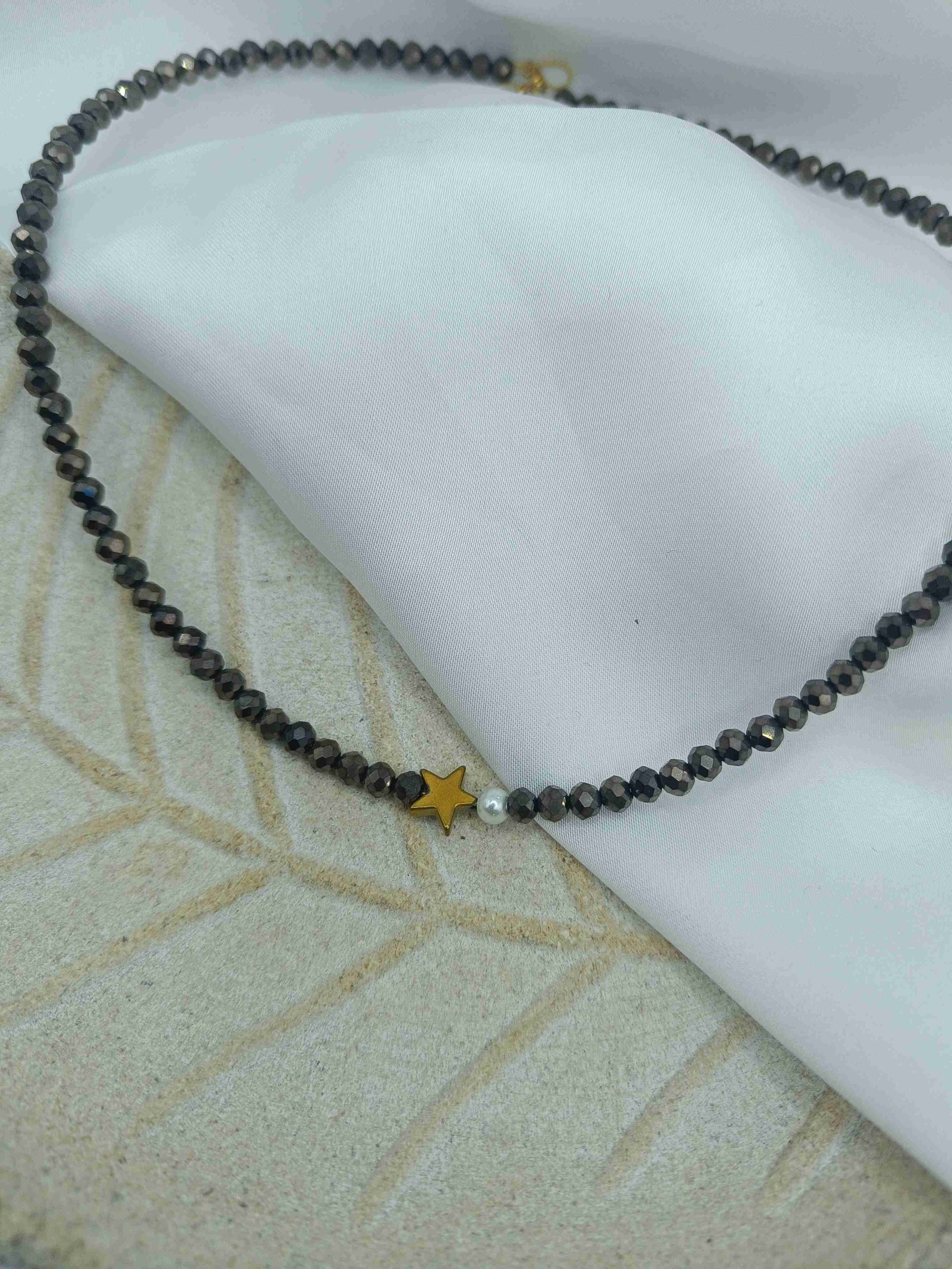 Το Aeris είναι ένα μοναδικό, χειροποίητο κολιέ που αποπνέει διακριτική κομψότητα και μοντέρνα αισθητική. Οι γκρι – καφέ χάντρες του χαρίζουν μια διαχρονική γοητεία, ενώ η λευκή πέρλα προσθέτει μια νότα κομψότητας. Το χρυσό αστέρι από αιματίτη ολοκληρώνει το σχέδιο με μια εκλεπτυσμένη πινελιά λάμψης.