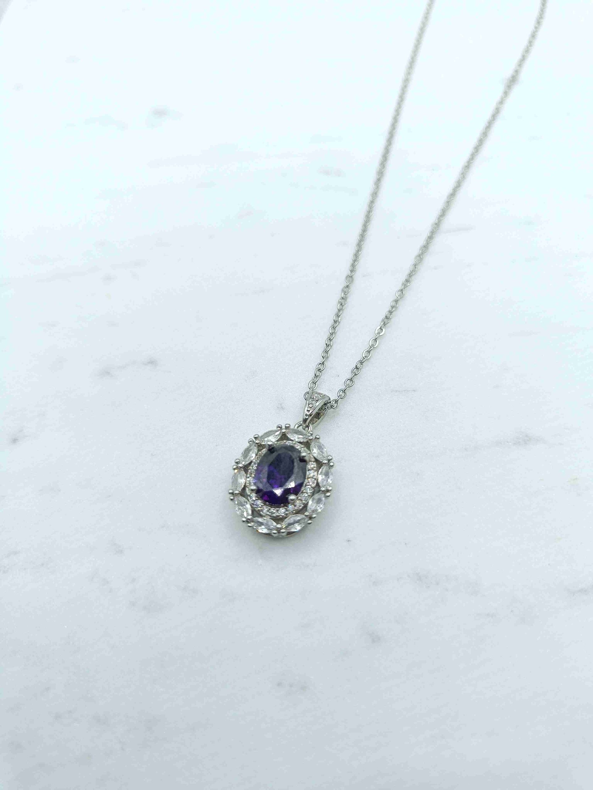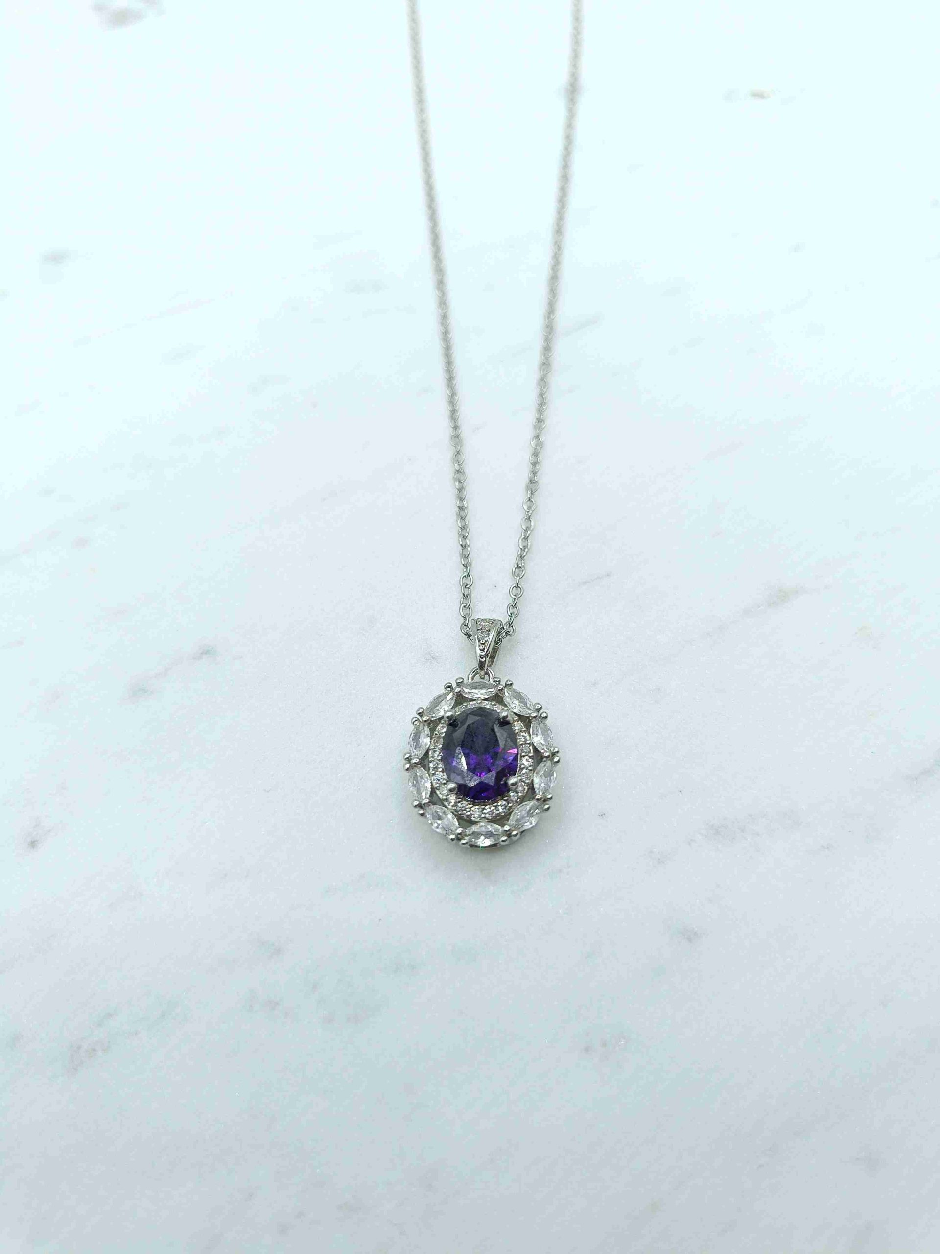 Ένα κομψό και εντυπωσιακό κολιέ που συνδυάζει φινέτσα και χρώμα. Το οβαλ σχέδιο με λευκά ζιργκόν δημιουργεί διακριτική λάμψη, ενώ το μεγάλο μωβ οβαλ ζιργκόν στο κέντρο τραβάει το βλέμμα και προσδίδει μια μοναδική πινελιά πολυτέλειας. Ιδανικό για κάθε ιδιαίτερη στιγμή ή για να δώσει χρώμα και λάμψη σε καθημερινές εμφανίσεις.