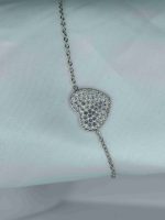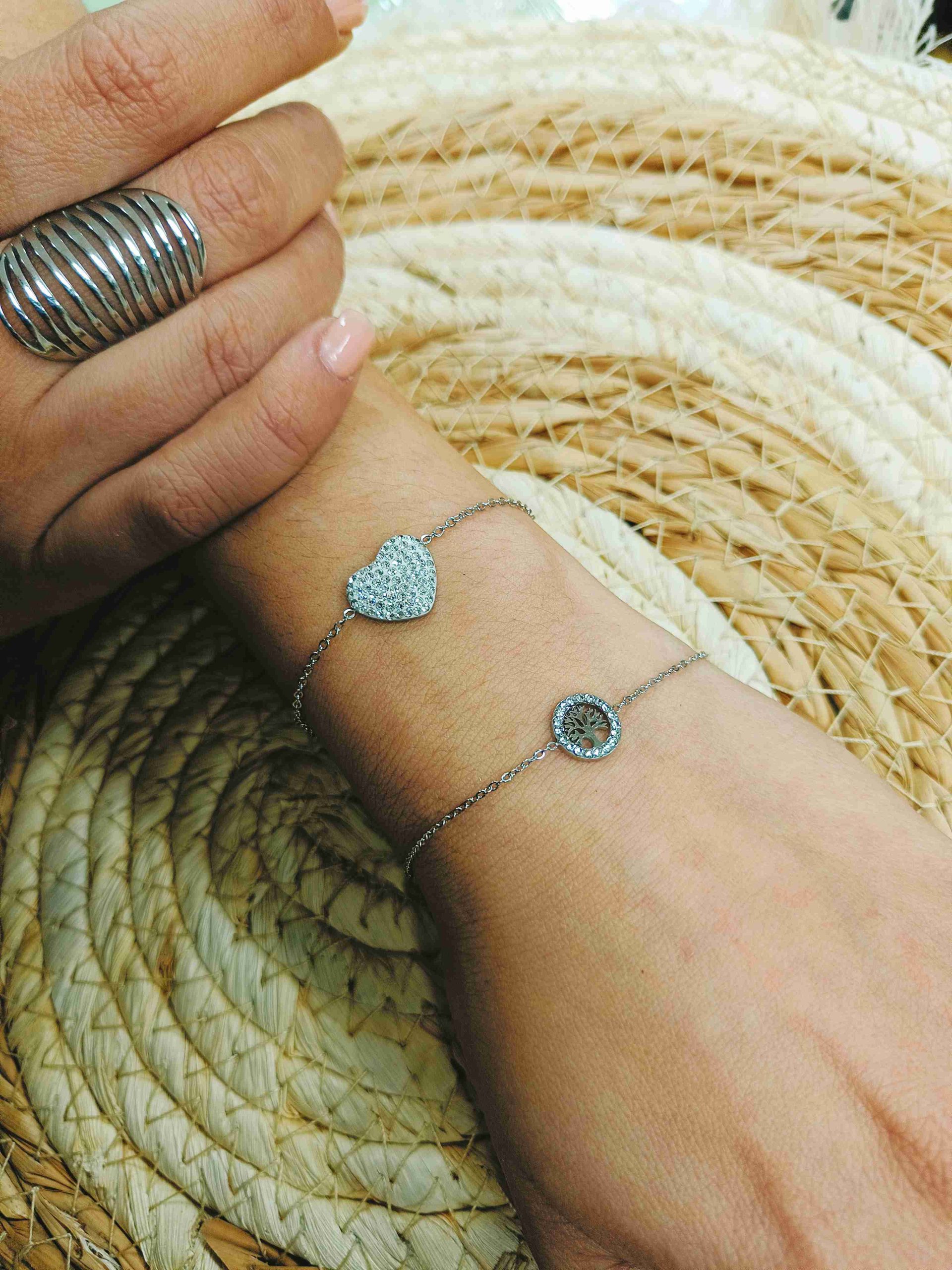 Ένα ρομαντικό και κομψό βραχιόλι από ανοξείδωτο ατσάλι, διακοσμημένο με μια λαμπερή καρδιά στο κέντρο και διακριτικά στρας που προσθέτουν λάμψη και φινέτσα.