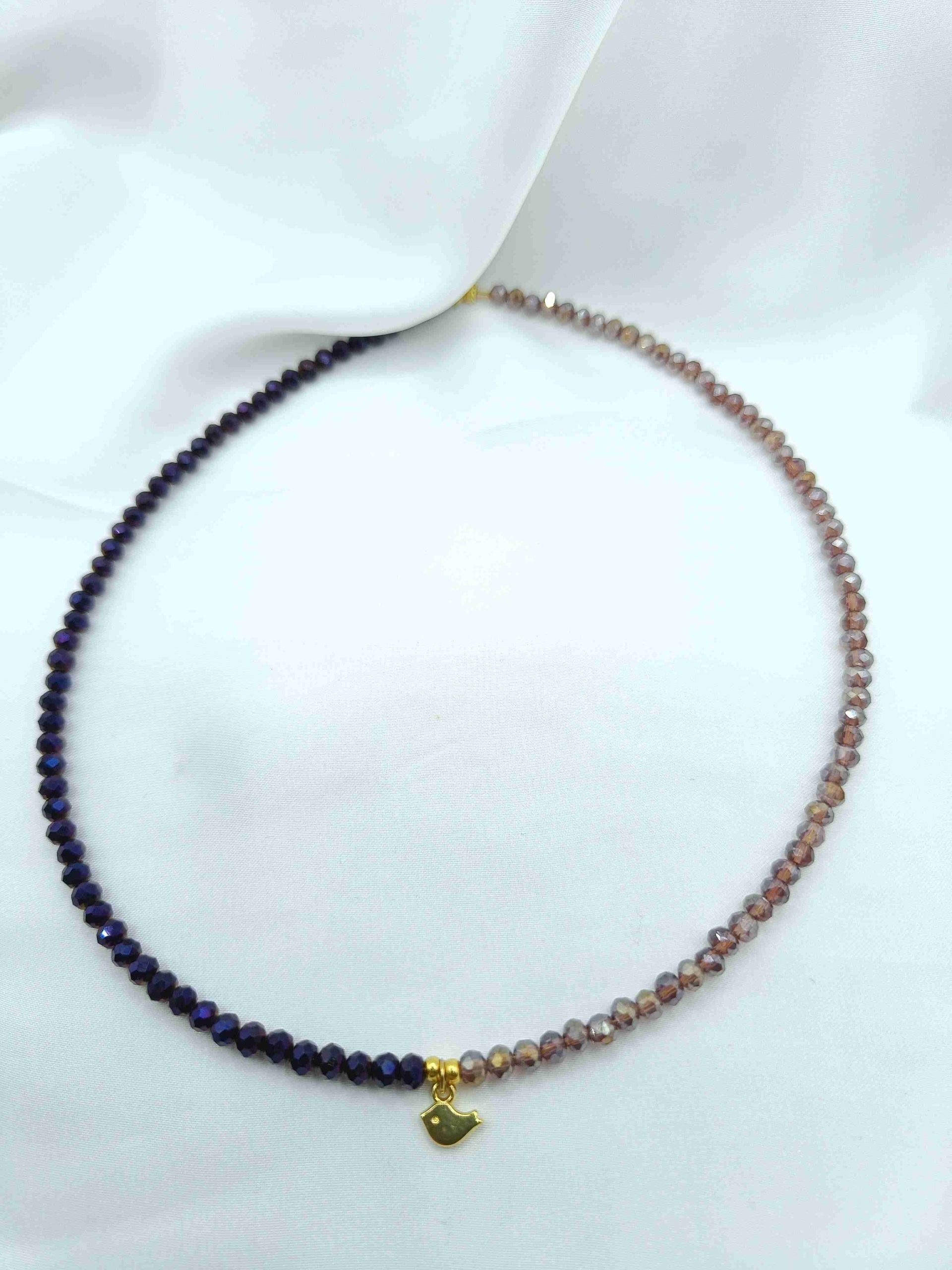 Το Anerel Améthys είναι χειροποίητο με μωβ χάντρες σε δύο αποχρώσεις και επιχρυσωμένες λεπτομέρειες που φωτίζουν τη σύνθεση. Το πουλάκι στο κέντρο αντιπροσωπεύει τη γαλήνη και την πνευματική ελευθερία — μια υπενθύμιση να πετάς ψηλά, αλλά με γείωση στην ουσία σου.