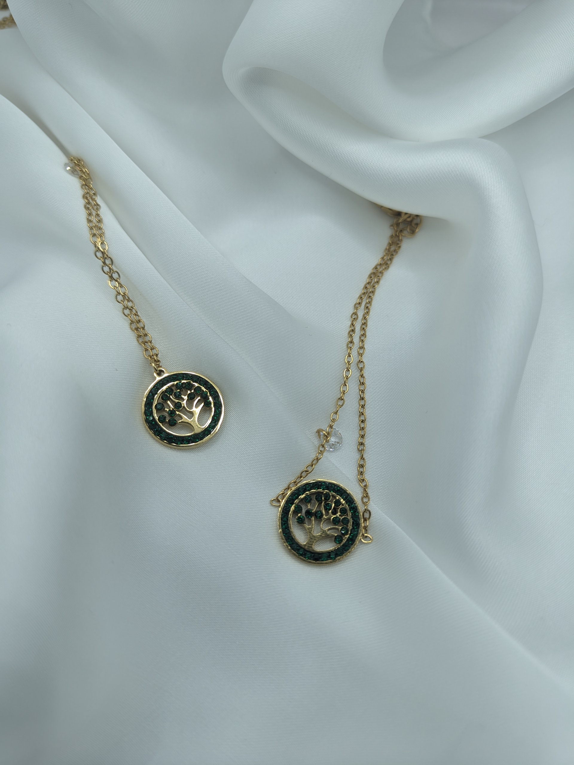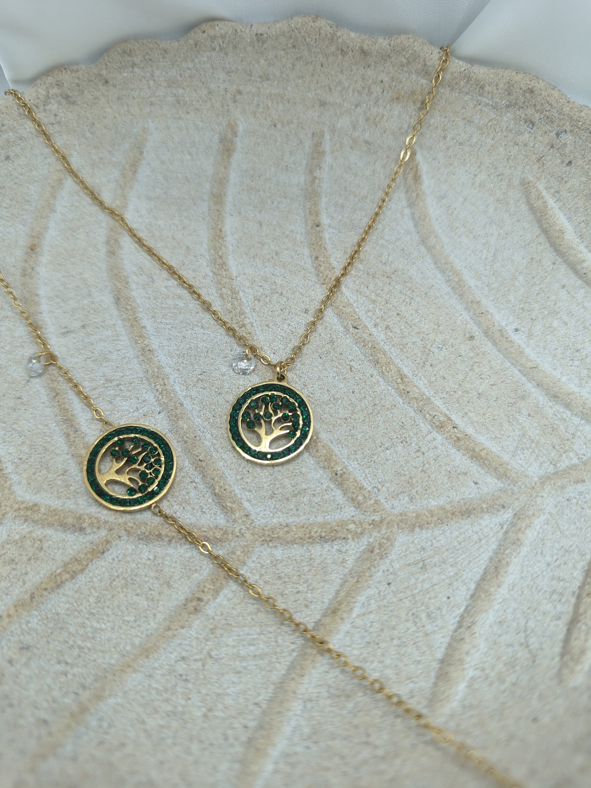 Σετ κολιέ και βραχιόλι με δέντρο της ζωής και πράσινα στρας