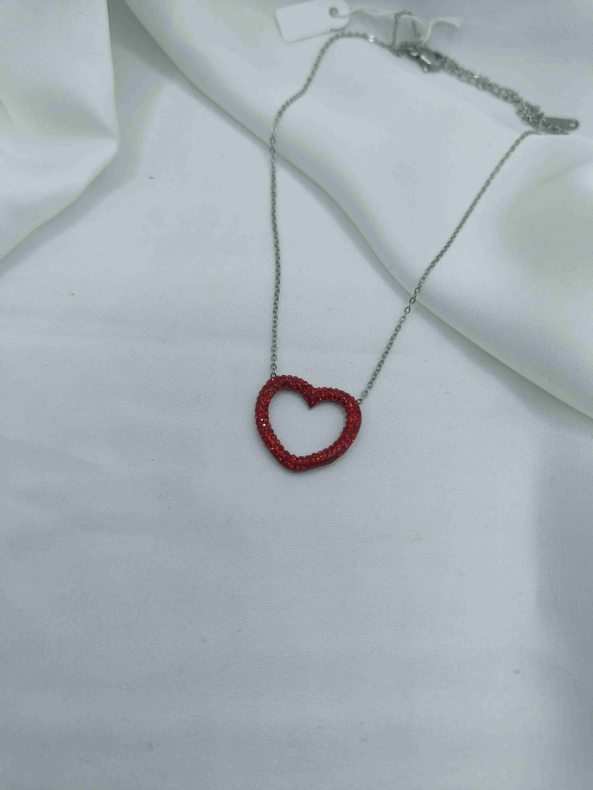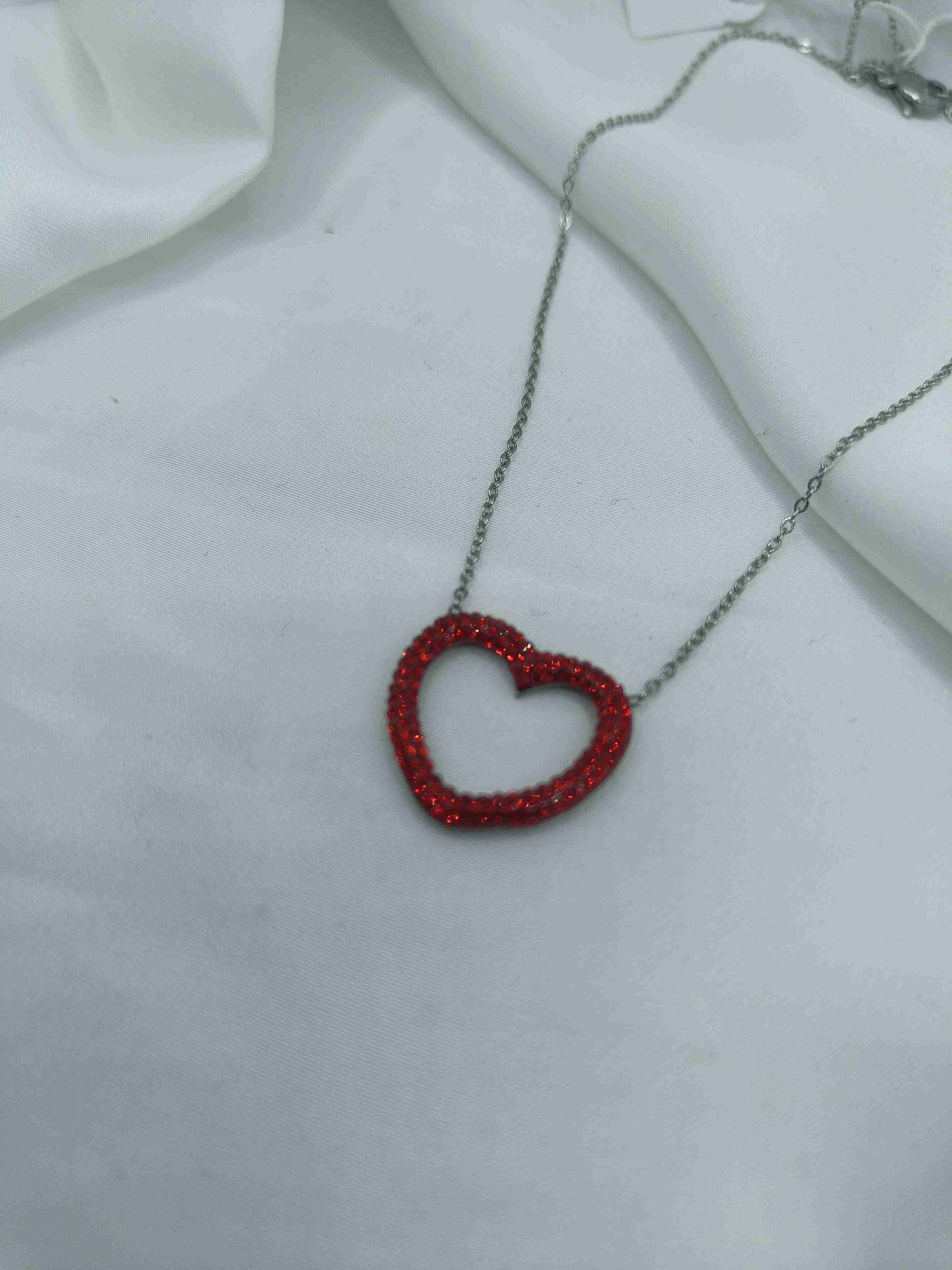 Κολιέ με αλυσίδα που καταλήγει σε μια εκθαμβωτική καρδιά διακοσμημένη με κόκκινα στρας. Το κενό στο κέντρο της καρδιάς δημιουργεί ένα εντυπωσιακό παιχνίδι φωτός και έντασης, σαν μια φλόγα που δεν σβήνει ποτέ. Ένα κόσμημα που αποπνέει πάθος, τόλμη και αυτοπεποίθηση.
