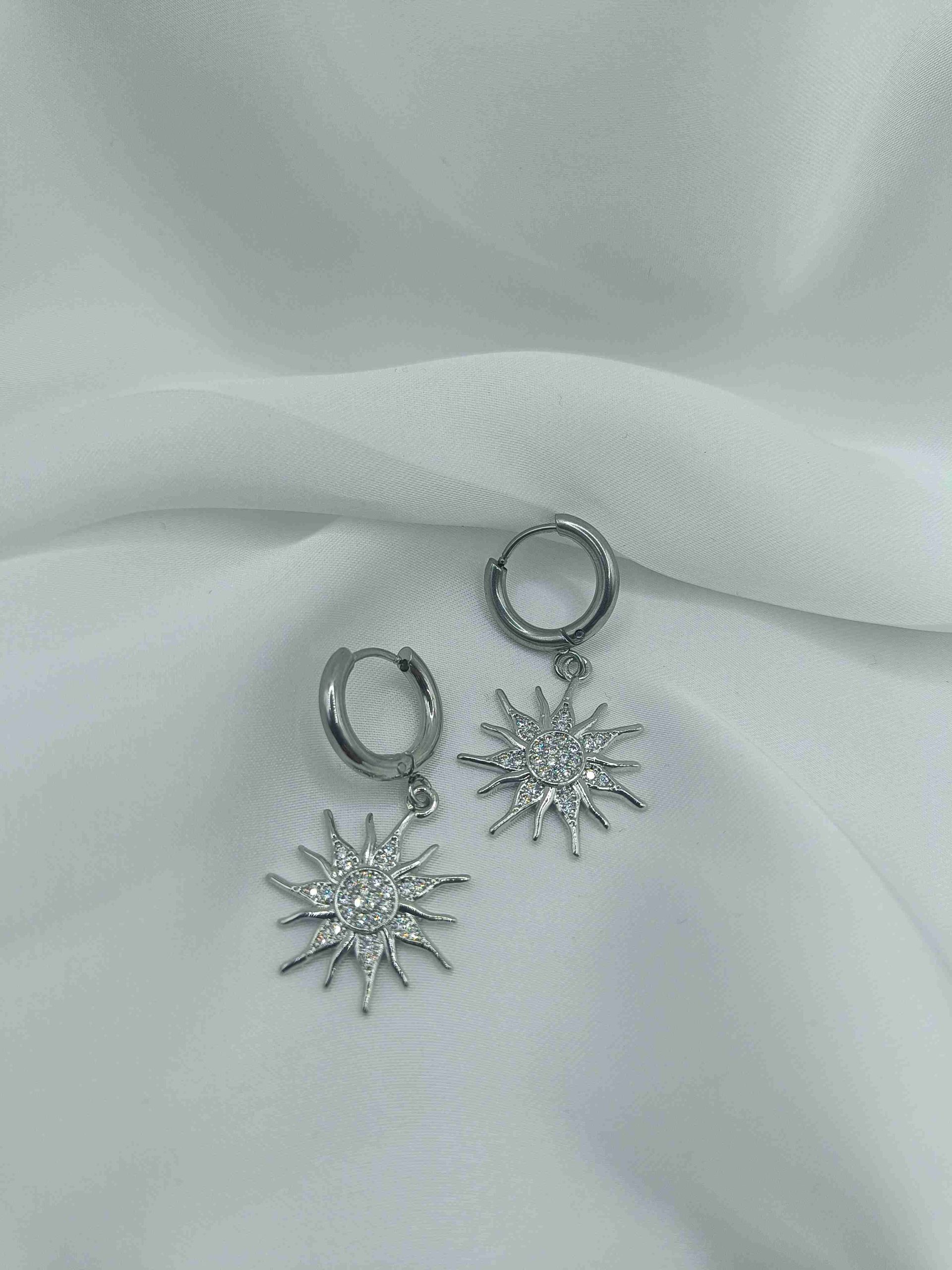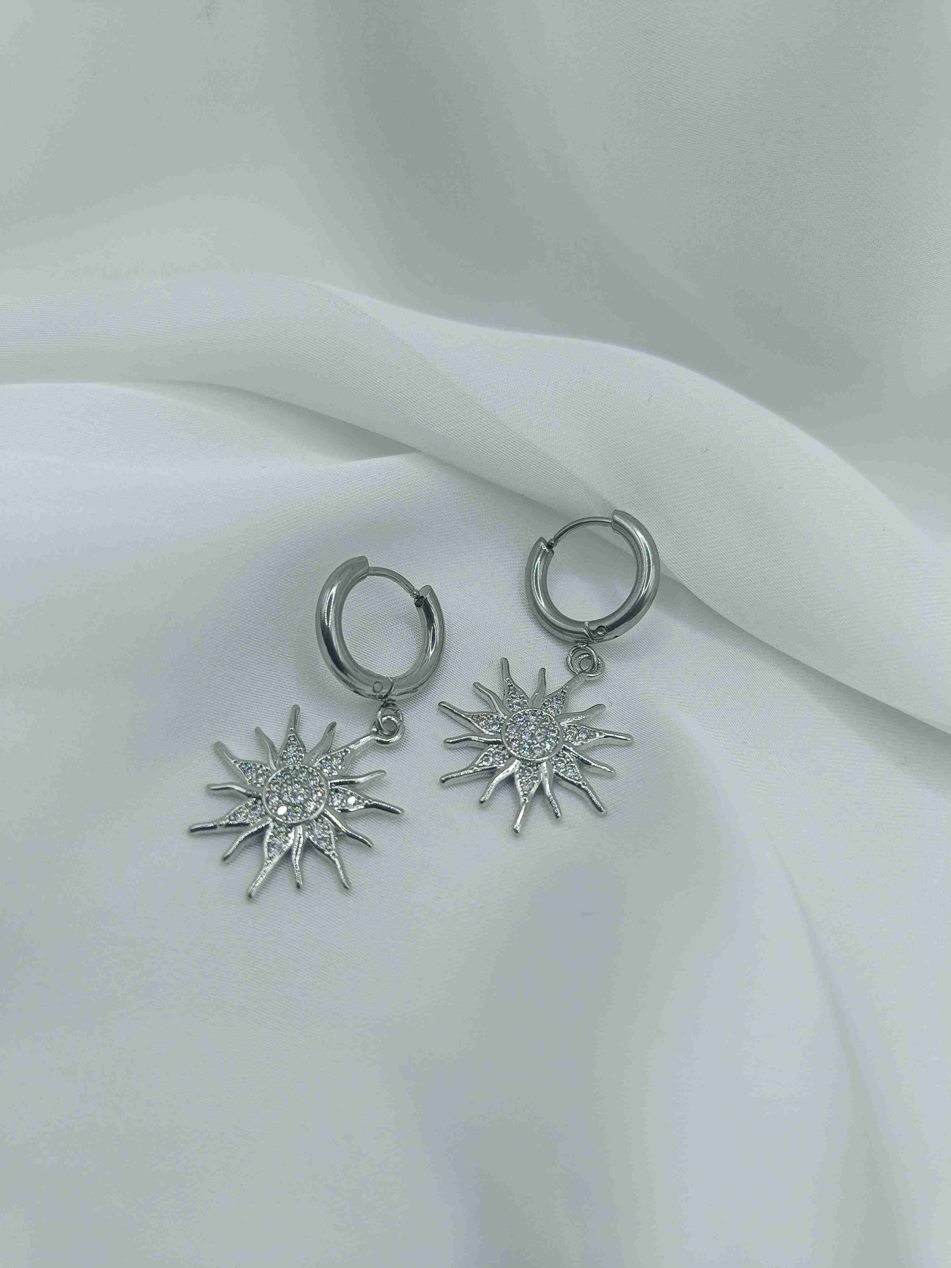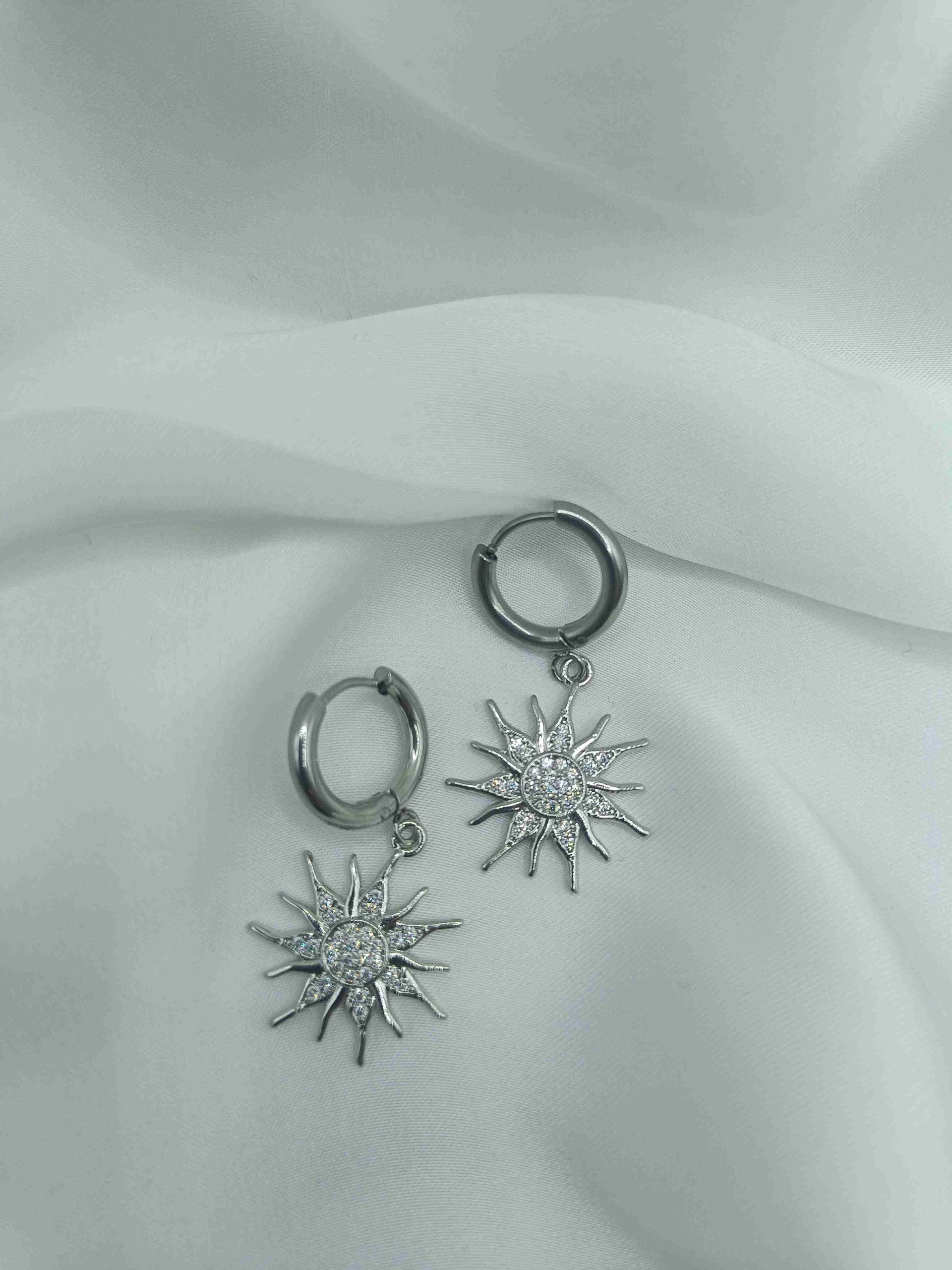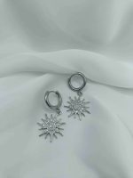 Ένα εντυπωσιακό σκουλαρίκι με κρικάκι από ανοξείδωτο ατσάλι, που συνδυάζει τη διαχρονική κομψότητα με μια πινελιά λαμπερής φαντασίας. Από τον κρίκο κρέμεται ένας ήλιος με λευκά αστραφτερά ζιργκόν που αιχμαλωτίζουν το φως σε κάθε σου κίνηση, προσθέτοντας μια ζεστή, φωτεινή λάμψη στο στυλ σου.