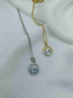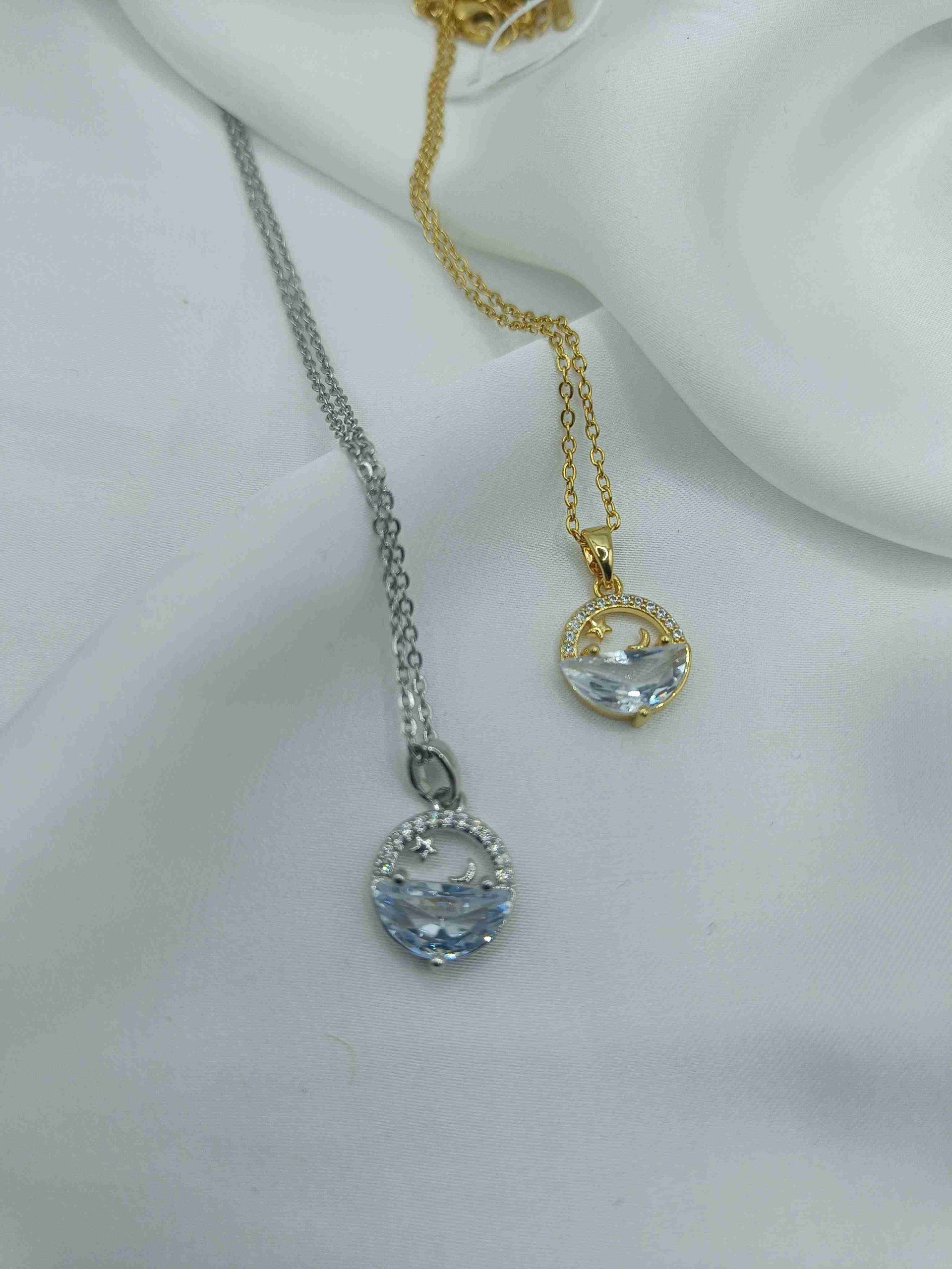 Ένα μοναδικό κολιέ με στρογγυλό μοτίφ που ενώνει γη και ουρανό σε ένα κομψό σύμβολο. Το κάτω μισό λάμπει μέσα από ένα λευκό κρύσταλλο, που θυμίζει ήρεμα νερά. Το πάνω μισό είναι ένα ανοιχτό περίγραμμα με λαμπερά στρας, που αγκαλιάζει έναν μισοφέγγαρο και ένα αστέρι – μια μικρή απεικόνιση του νυχτερινού ουρανού. Αέρινο και μαγνητικό, φέρνει μαζί του μια αίσθηση ησυχίας και μαγείας.