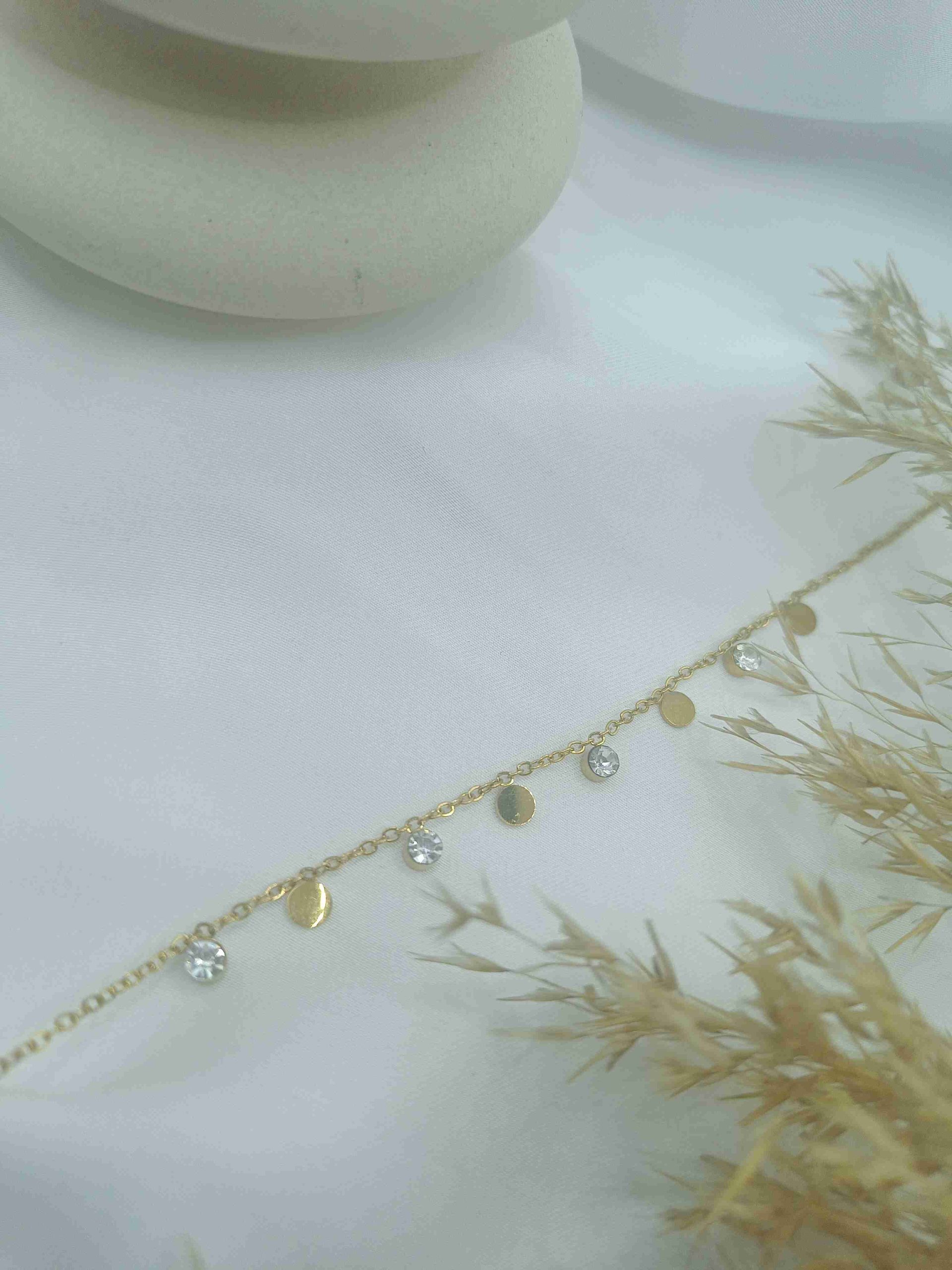 Σε χρυσό τόνο, αυτό το βραχιόλι από ανοξείδωτο ατσάλι εντυπωσιάζει με την ισορροπία του. Οι λευκές πέτρες ζιργκόν λάμπουν ανάμεσα στα τέσσερα κυκλικά μεταλλικά στοιχεία, αποπνέοντας αίσθηση πληρότητας και κομψότητας.