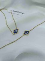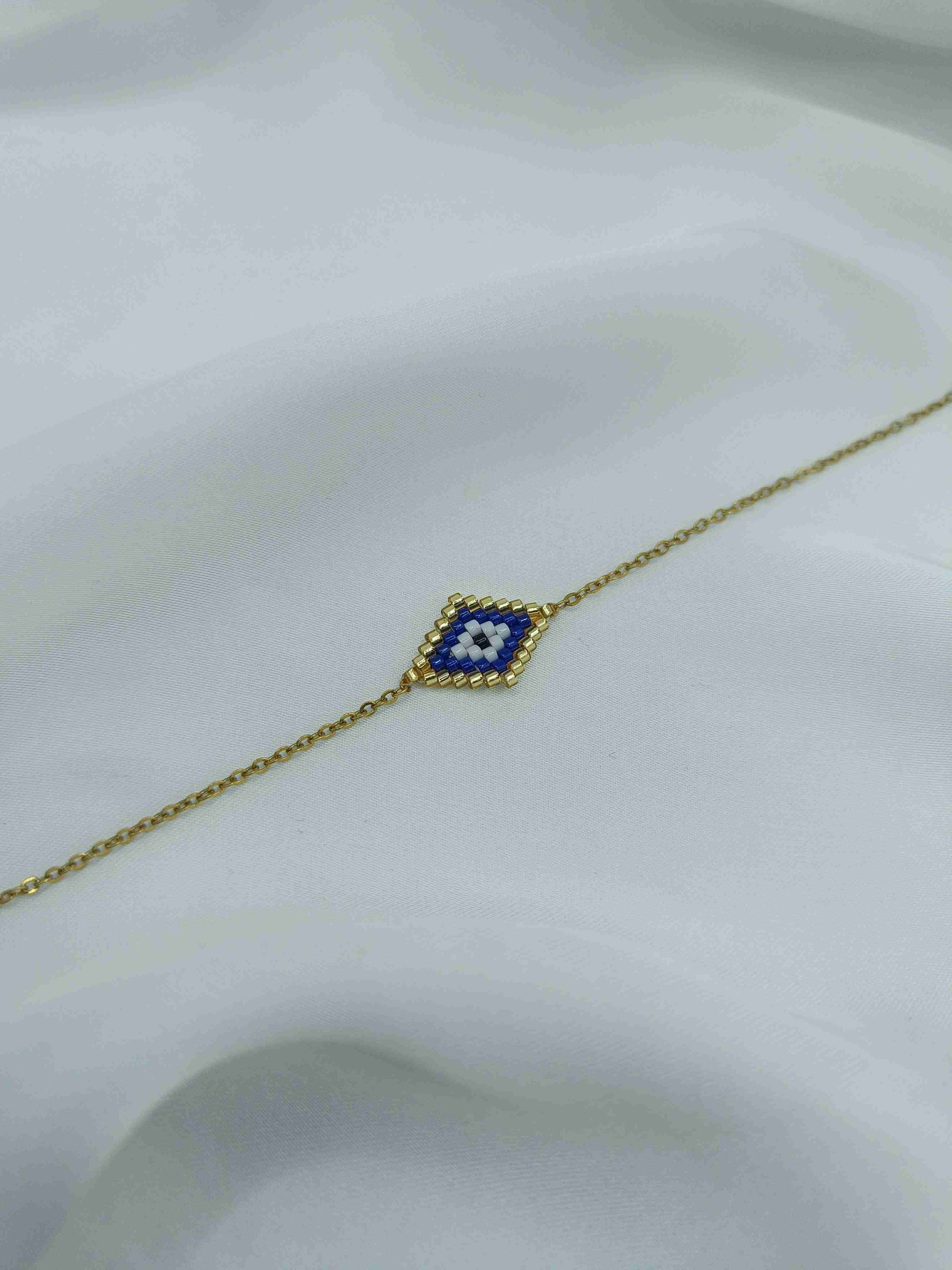 Το Azra είναι ένα φίνο βραχιόλι με ματάκι σε σχήμα ρόμβου, φτιαγμένο από μπλε, λευκές και χρυσές χάντρες. Η διακριτική του λάμψη και η γεωμετρική του ισορροπία το κάνουν ιδανικό για να το φοράς καθημερινά, είτε μόνο του είτε σε layered looks.