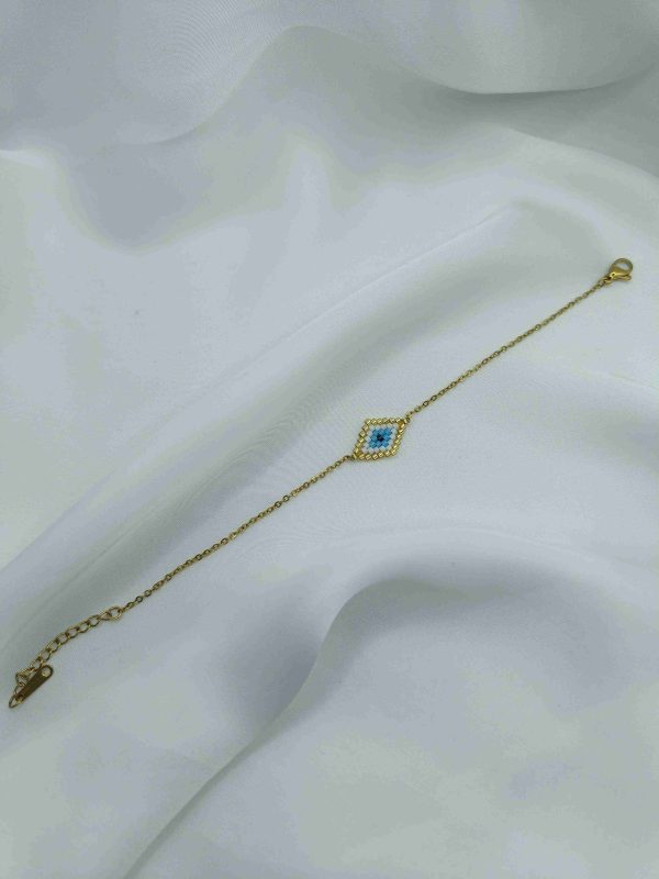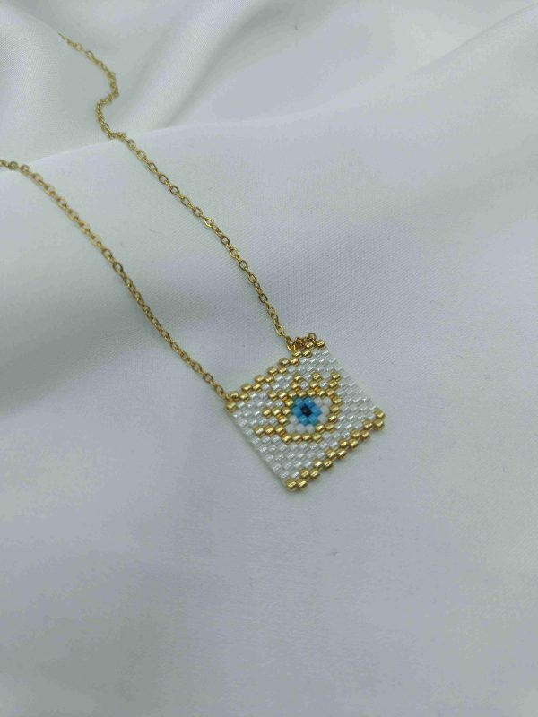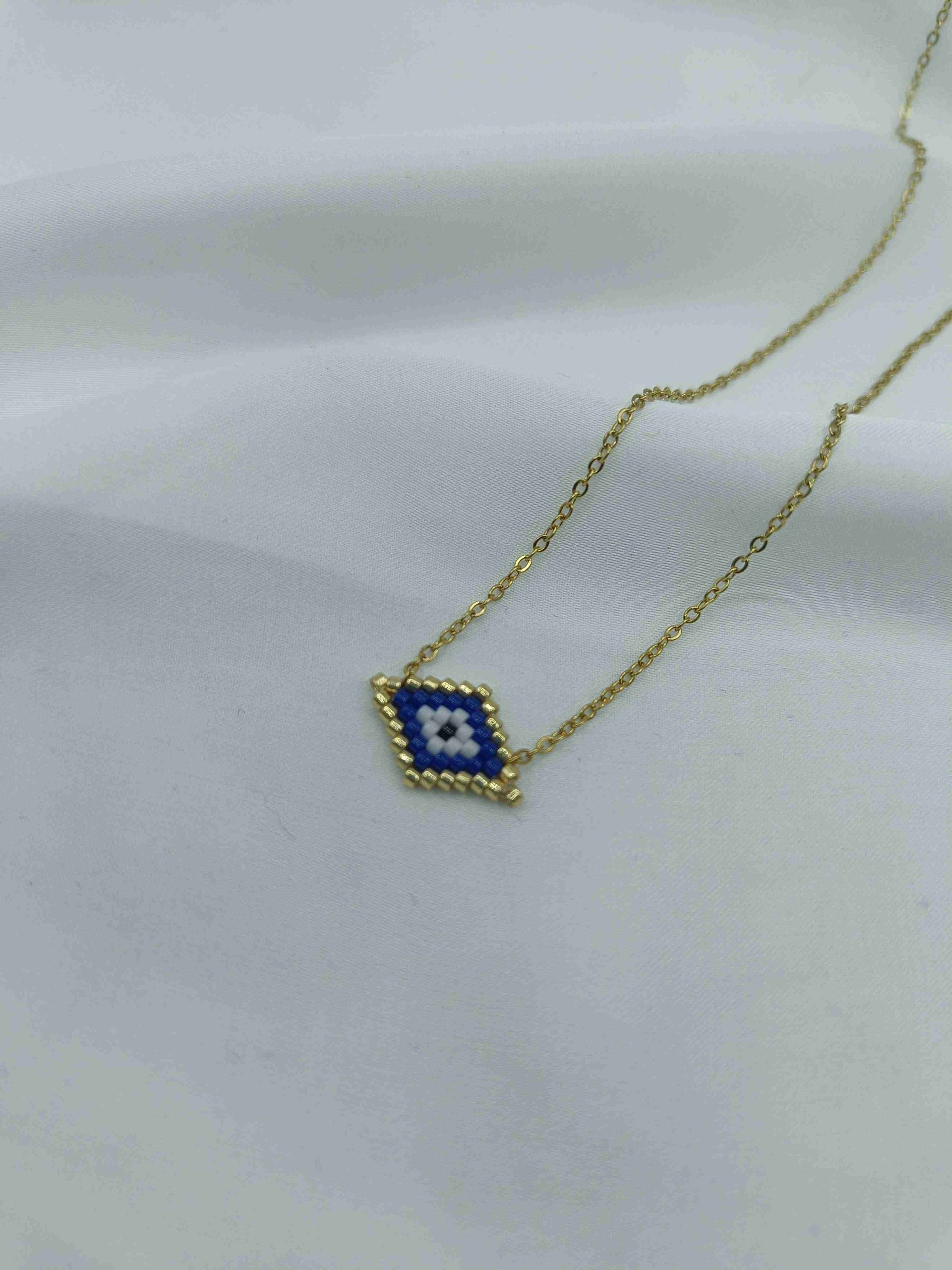 Το Azra είναι ένα εκλεπτυσμένο κολιέ με ματάκι σε σχήμα ρόμβου, φτιαγμένο από χάντρες σε αποχρώσεις του χρυσού, λευκού και μπλε. Το γεωμετρικό του σχήμα φέρνει στο νου ισορροπία και κεντράρισμα, ενώ το μάτι στο κέντρο λειτουργεί σαν σύμβολο προστασίας και διαύγειας. Η χρυσή αλυσίδα ολοκληρώνει την αίσθηση πολυτέλειας, χωρίς υπερβολές.