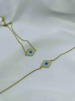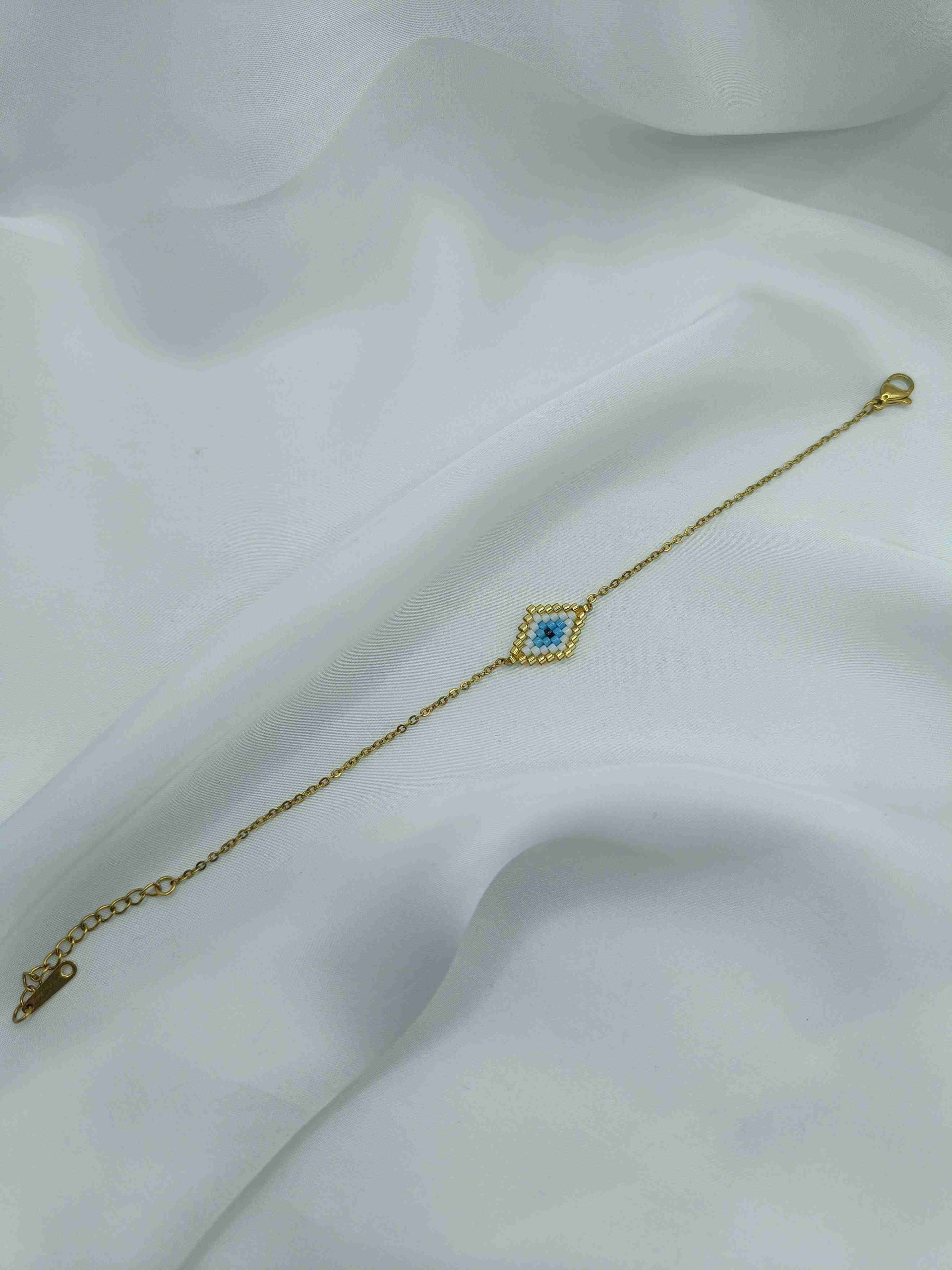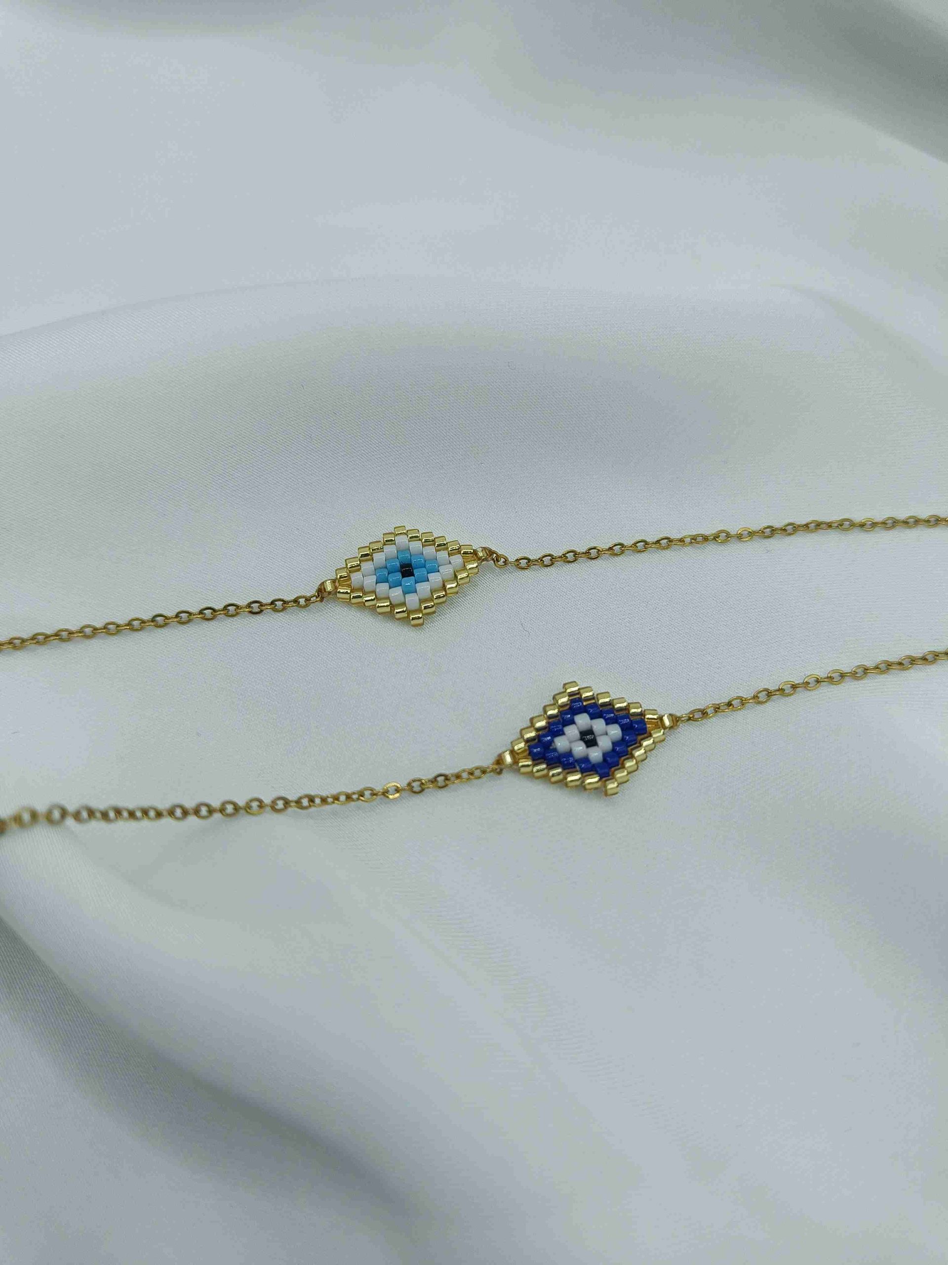 Το Azra είναι ένα φίνο βραχιόλι με ματάκι σε σχήμα ρόμβου, φτιαγμένο από γαλάζιες, λευκές και χρυσές χάντρες. Η διακριτική του λάμψη και η γεωμετρική του ισορροπία το κάνουν ιδανικό για να το φοράς καθημερινά, είτε μόνο του είτε σε layered looks.