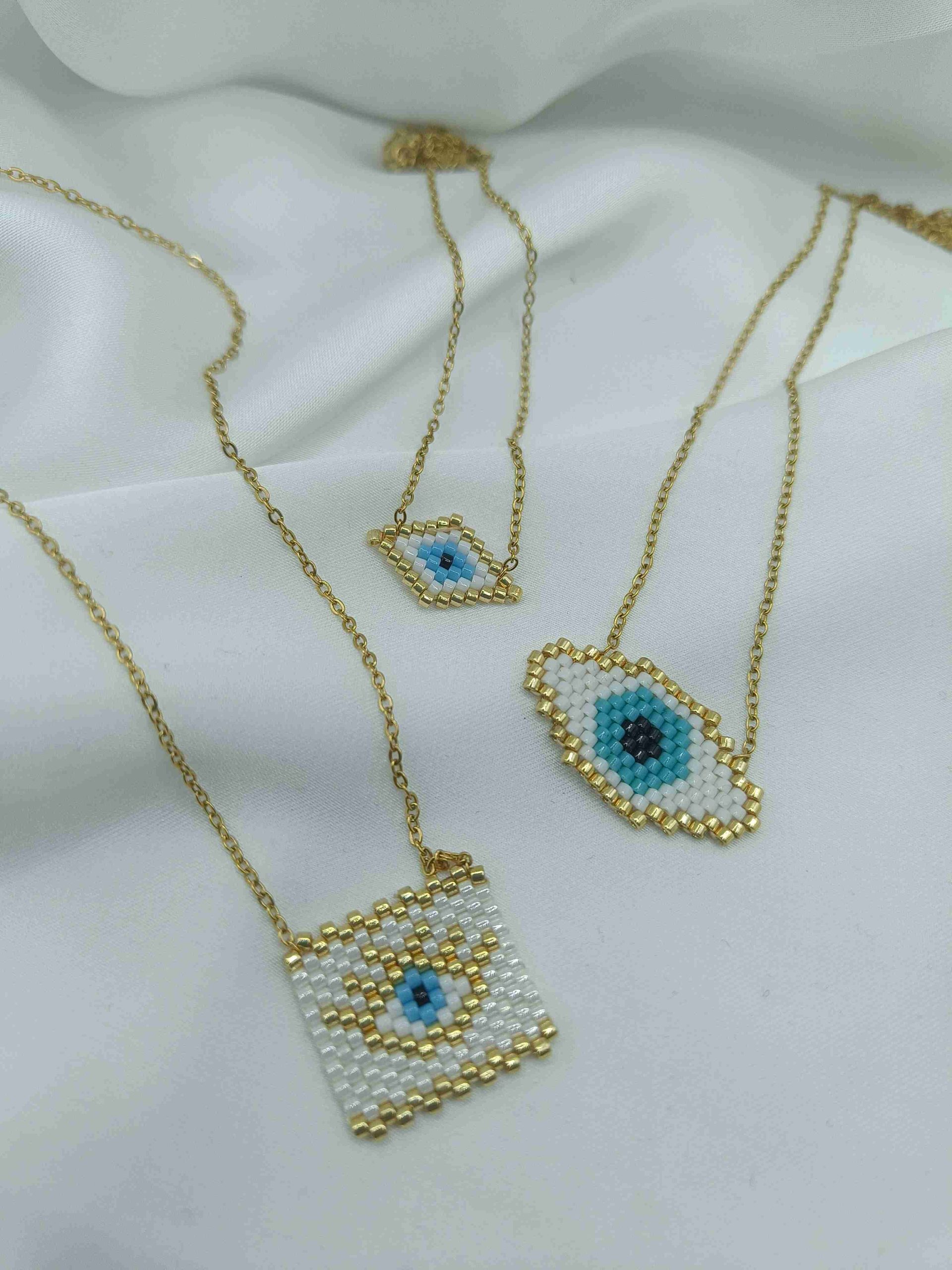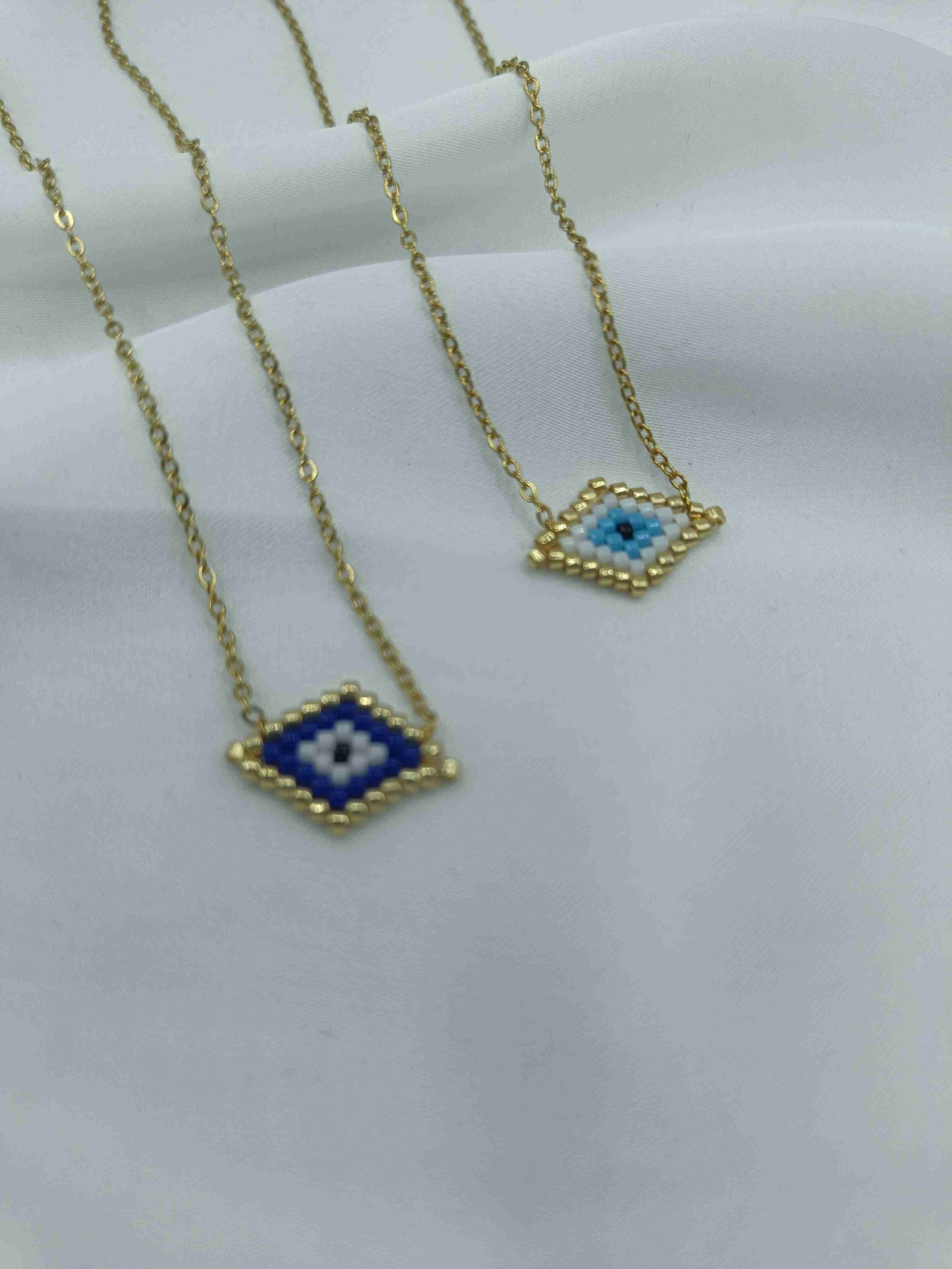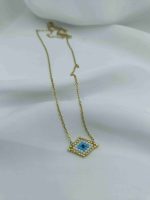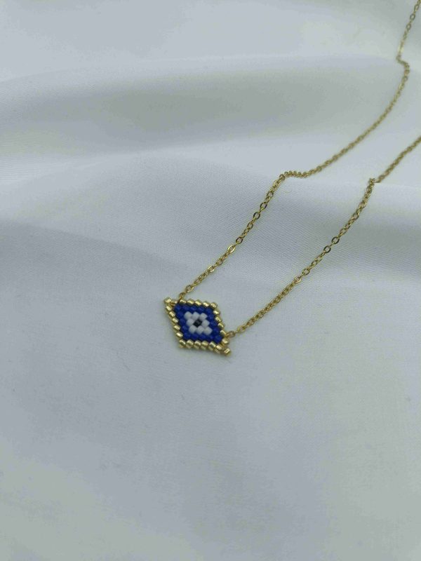 Το Azra είναι ένα εκλεπτυσμένο κολιέ με ματάκι σε σχήμα ρόμβου, φτιαγμένο από χάντρες σε αποχρώσεις του χρυσού, λευκού και γαλάζιου. Το γεωμετρικό του σχήμα φέρνει στο νου ισορροπία και κεντράρισμα, ενώ το μάτι στο κέντρο λειτουργεί σαν σύμβολο προστασίας και διαύγειας. Η χρυσή αλυσίδα ολοκληρώνει την αίσθηση πολυτέλειας, χωρίς υπερβολές.