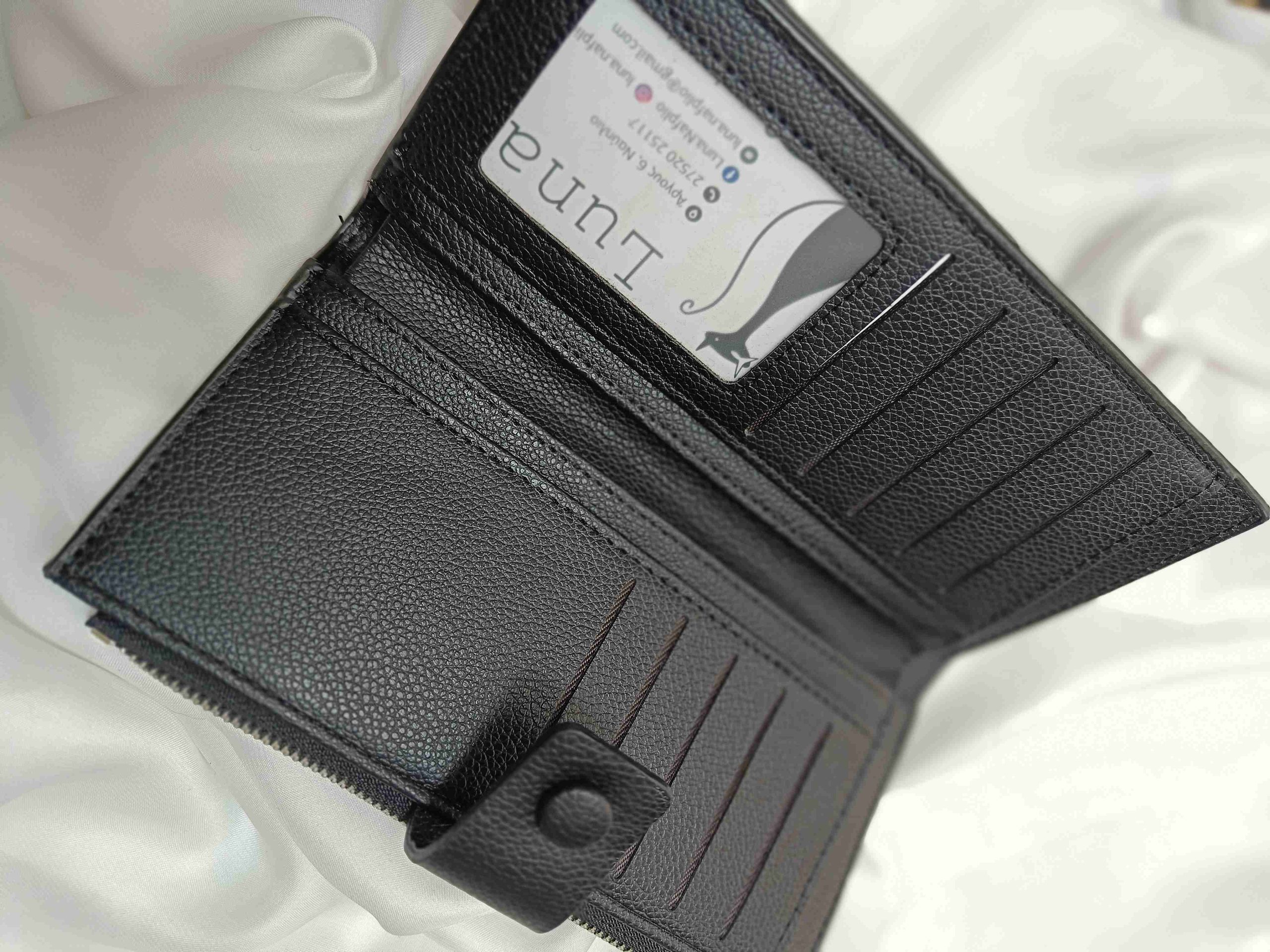 Διαθέτει θήκες για 19 κάρτες και 3 φωτογραφίες ή ταυτότητα, θήκη με φερμουάρ για κέρματα, 6 έξτρα θήκες πίσω από τις κάρτες και θήκη για χαρτονομίσματα.