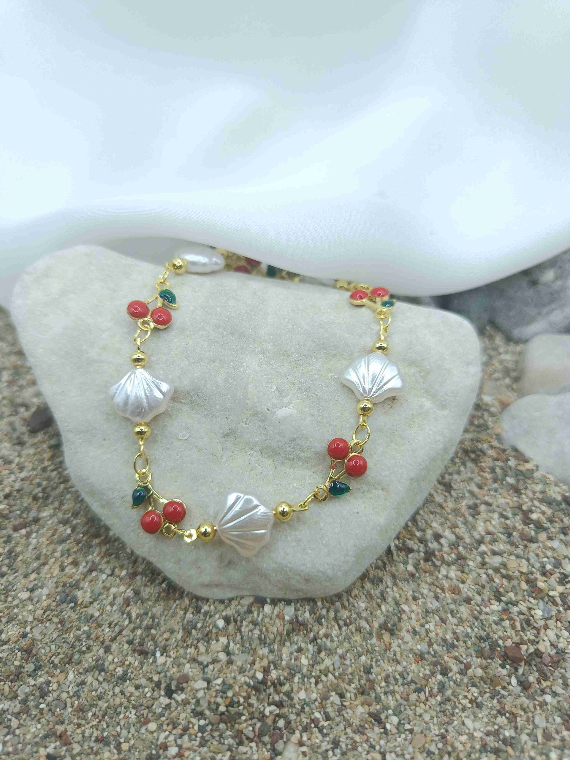 Ένα playful βραχιόλι ποδιού από ανοξείδωτο ατσάλι σε χρυσό χρώμα, με φρουτένια κερασάκια και λευκά κοχυλάκια-αχοιβάδες που εναλλάσσονται αρμονικά σε μια καλοκαιρινή παλέτα. Ο παιχνιδιάρικος σχεδιασμός του ισορροπεί ανάμεσα στο cute και το chic, δίνοντας μια δροσερή, διασκεδαστική πινελιά σε κάθε βήμα.