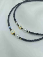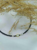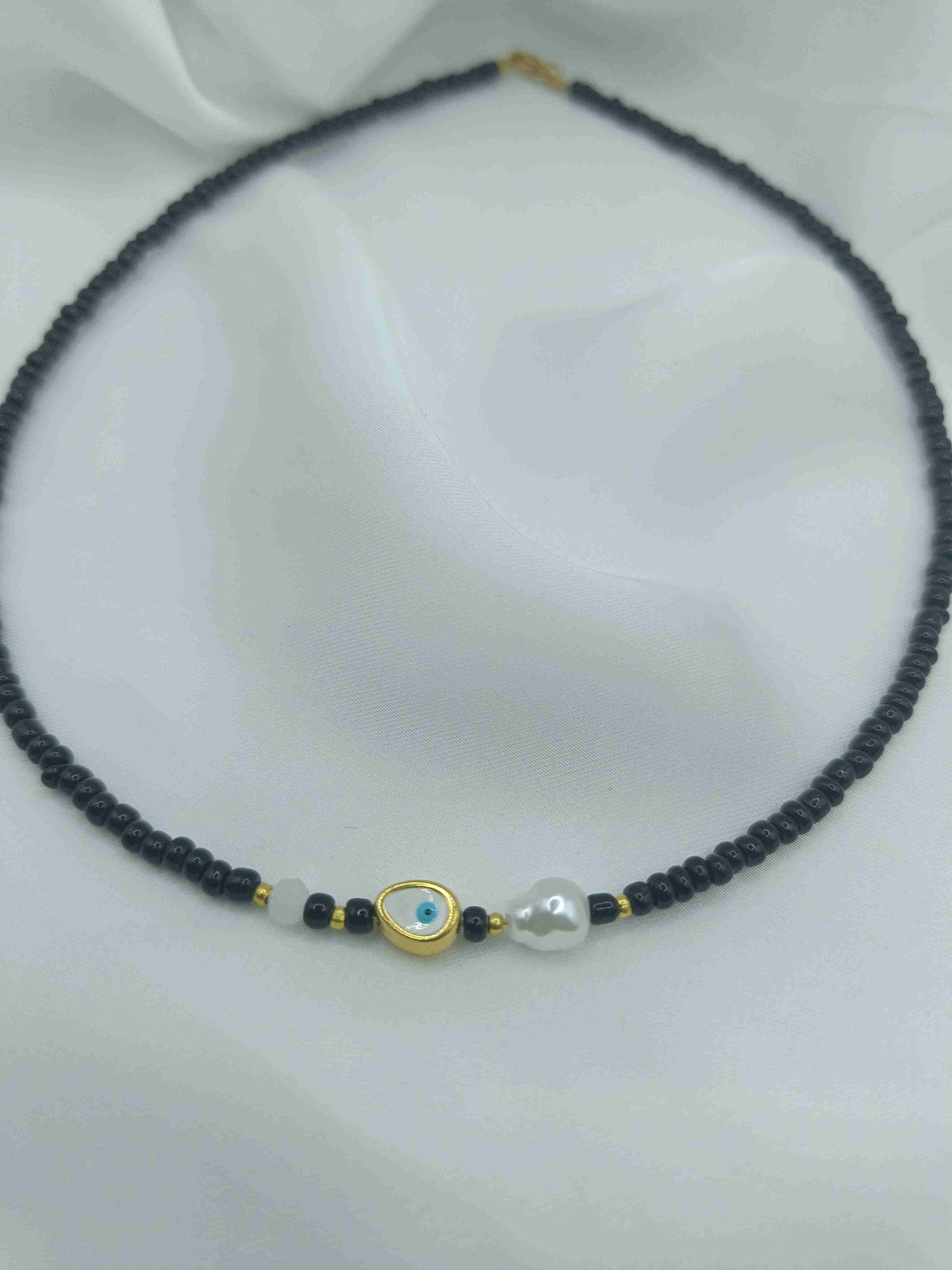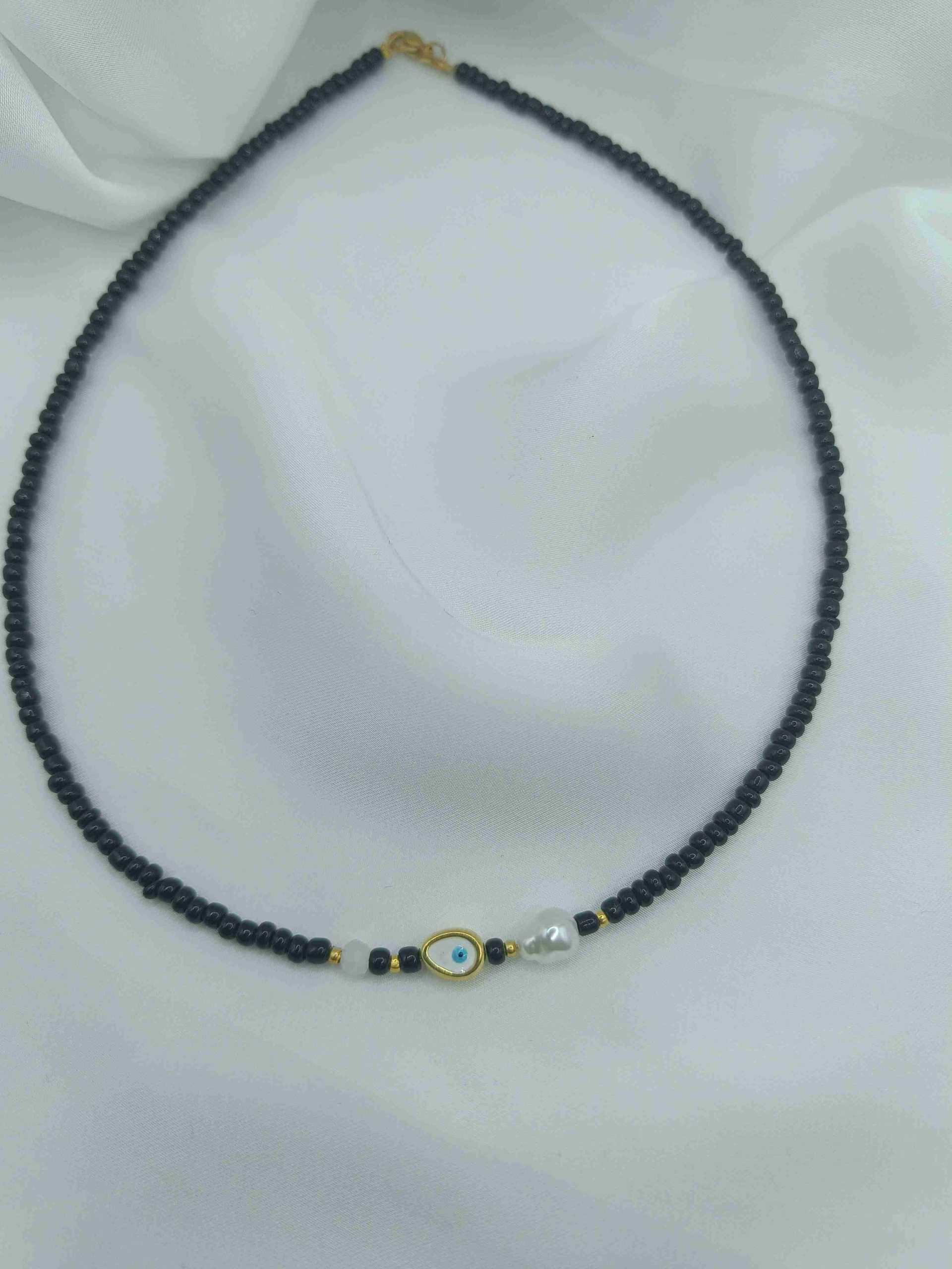 Το συγκεκριμένο κολιέ είναι φτιαγμένο με μαύρες χάντρες και μία μπλε χάντρα, πέρλα και ματάκι.
