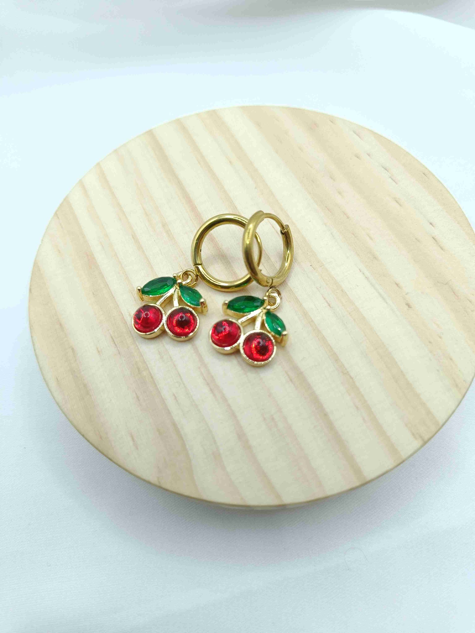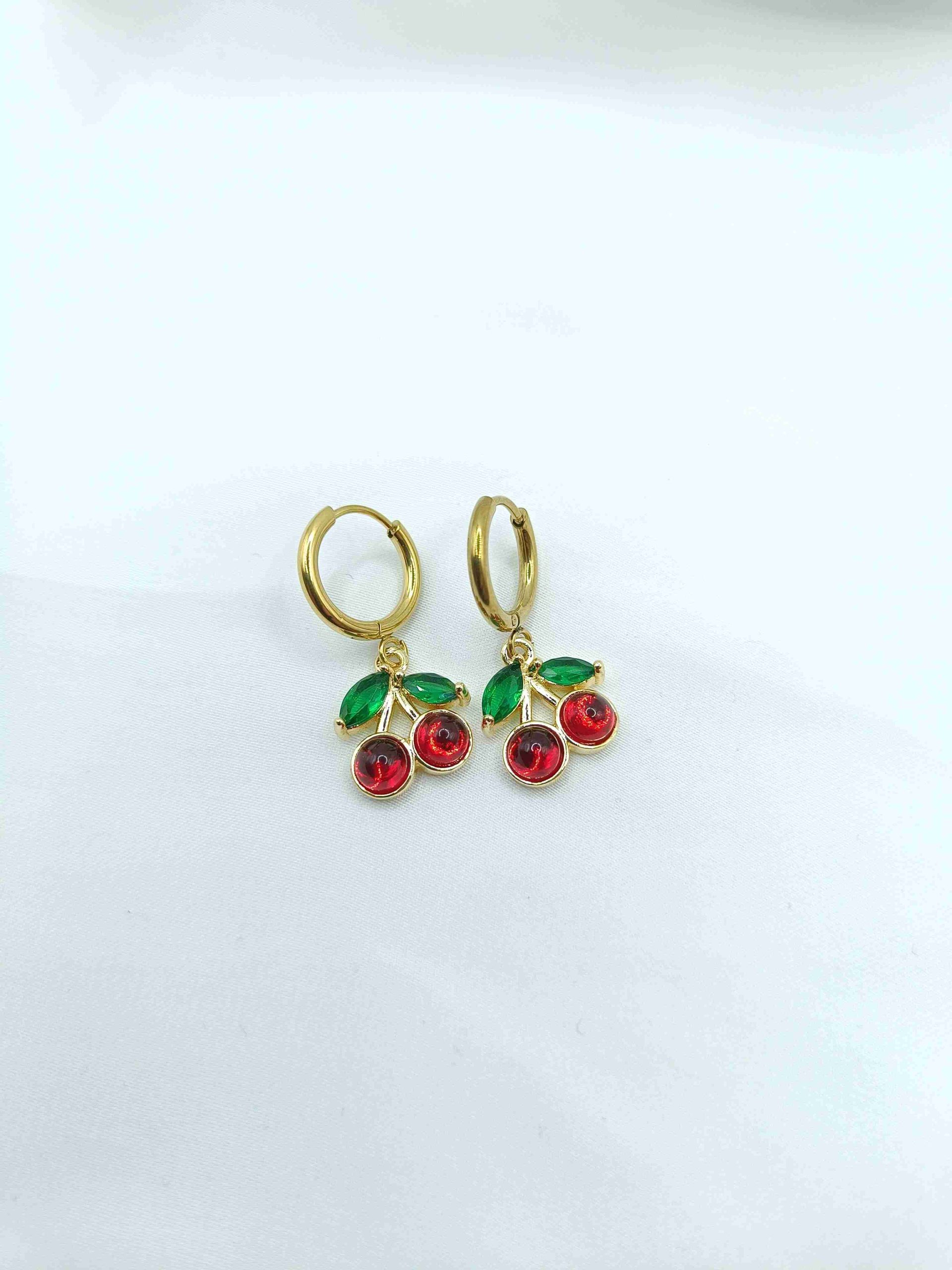 Μικρά και κομψά, τα σκουλαρίκια Cherry Bloom κλέβουν την καρδιά με τον διακριτικό τους σχεδιασμό. Τα κερασάκια από κόκκινη πετρούλα και τα πράσινα φυλλαράκια από στρας συνδυάζονται υπέροχα πάνω σε κρικάκι από ανοξείδωτο ατσάλι σε χρυσό χρώμα, προσφέροντας μια παιχνιδιάρικη αλλά και κομψή πινελιά σε κάθε look. Ιδανικά για καθημερινές εμφανίσεις αλλά και για να δώσουν μια γλυκιά, καλοκαιρινή νότα στις βραδινές σας εξόδους.