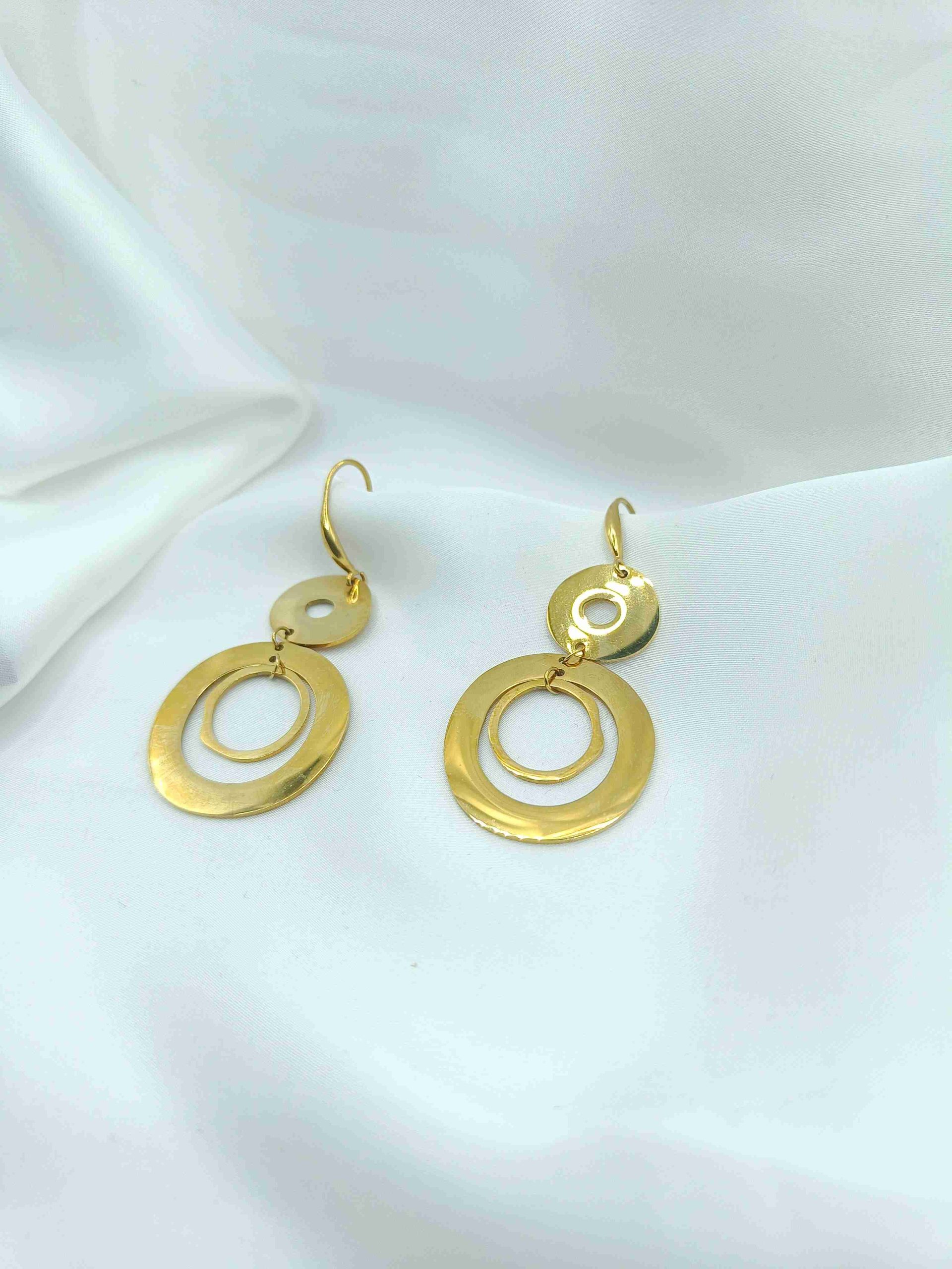 Τα Circula είναι σκουλαρίκια από ανοξείδωτο ατσάλι σε χρυσό χρώμα, με κρεμαστά κυκλικά μοτίβα που δίνουν μια αίσθηση κίνησης και κομψότητας. Το διαχρονικό τους σχέδιο τα καθιστά ιδανικά για να συνοδεύσουν τόσο καθημερινές όσο και πιο ιδιαίτερες εμφανίσεις.