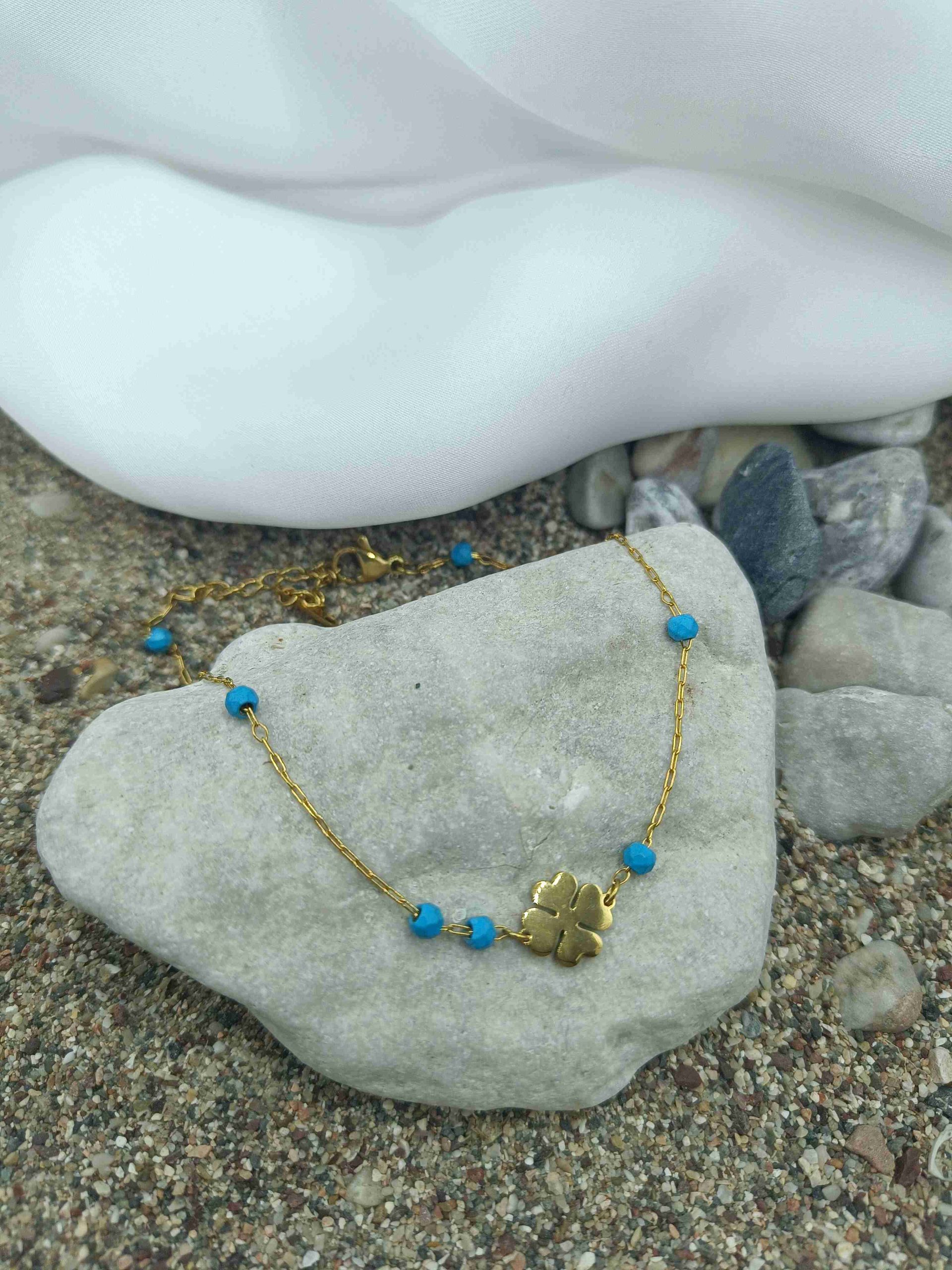Ένα λεπτεπίλεπτο βραχιόλι ποδιού με ζωντανές τιρκουάζ χάντρες και κεντρικό στοιχείο ένα γοητευτικό τετράφυλλο τριφύλλι. Ένας συνδυασμός τύχης και ηρεμίας, ιδανικός για να δώσει χρώμα και θετική ενέργεια στο καλοκαιρινό σου στυλ.