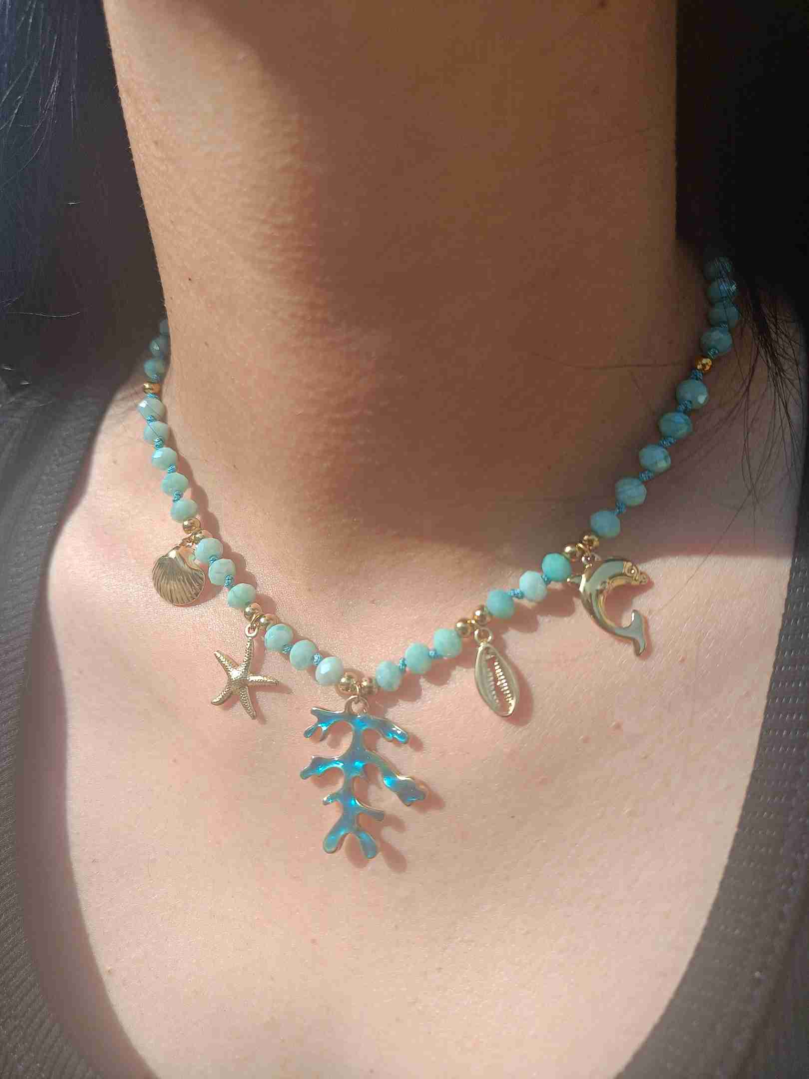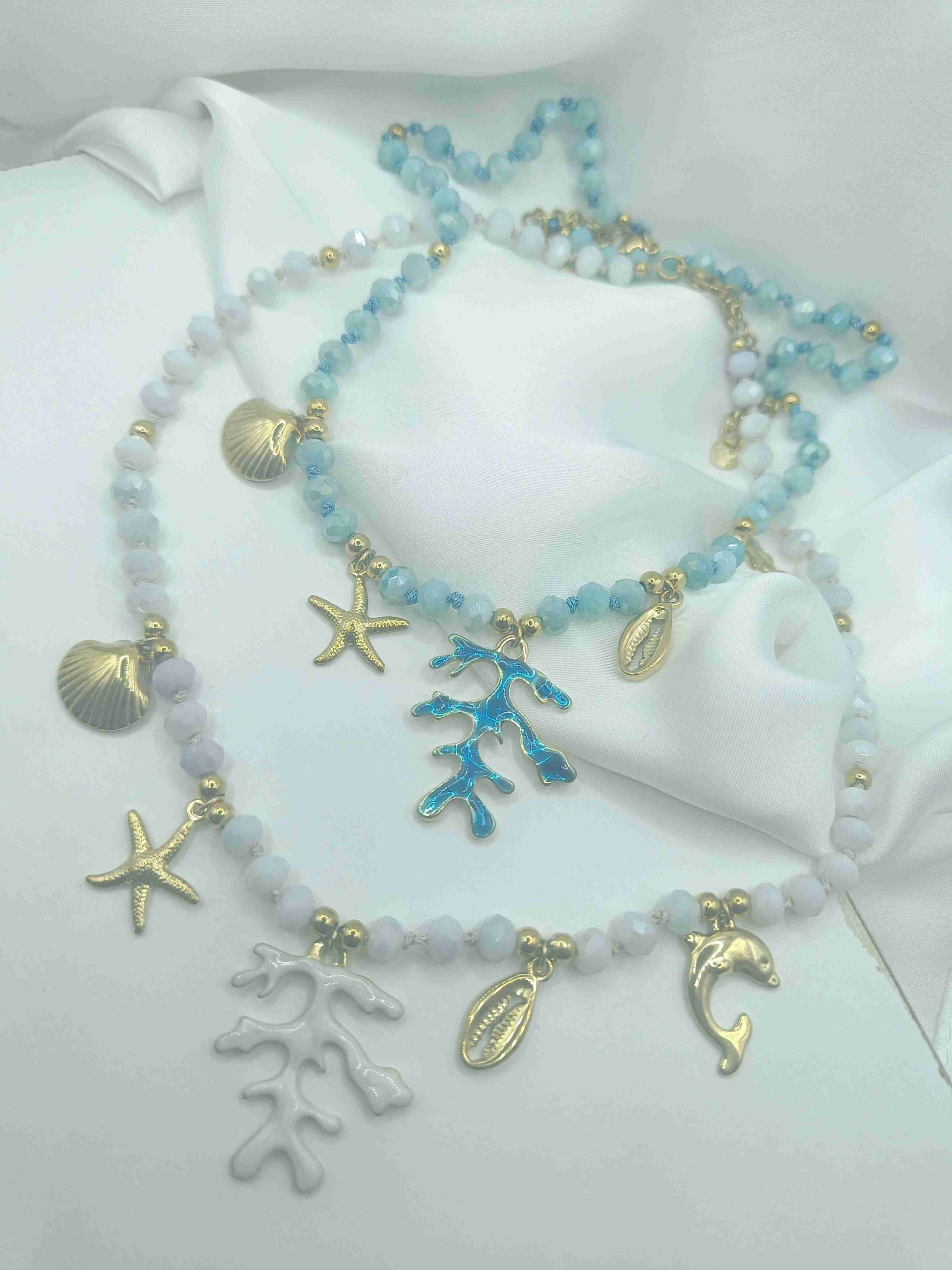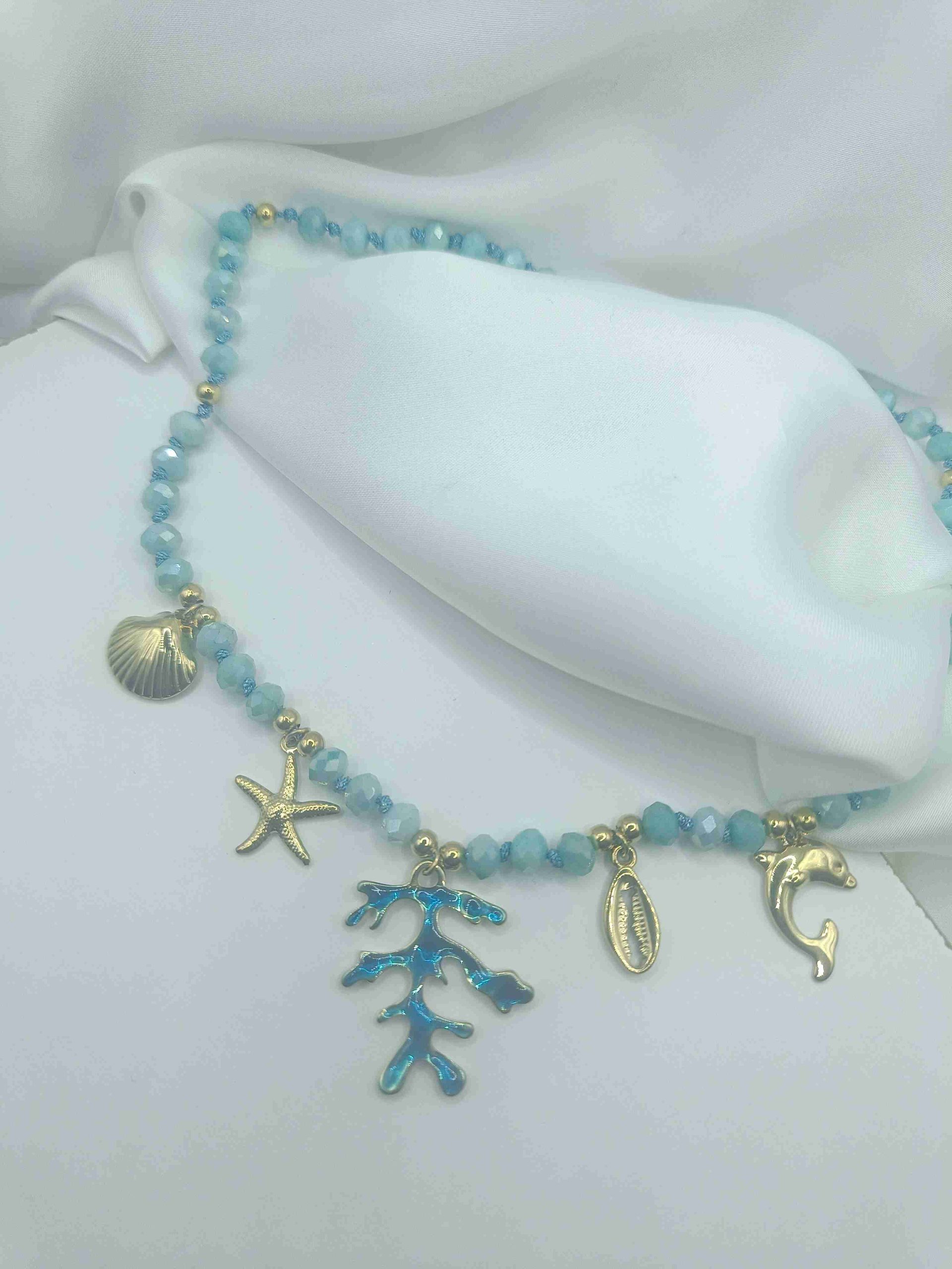 Ένα ταξίδι στο βυθό, φορεμένο στον λαιμό σου. Το Coralline είναι χειροποίητο κολιέ με χάντρες σε αποχρώσεις του γαλάζιου, στολισμένο με χρυσές λεπτομέρειες και πέντε μαγευτικά μενταγιόν: κοχύλι, αστερία, κοράλλι, cowrie shell και δελφίνι.