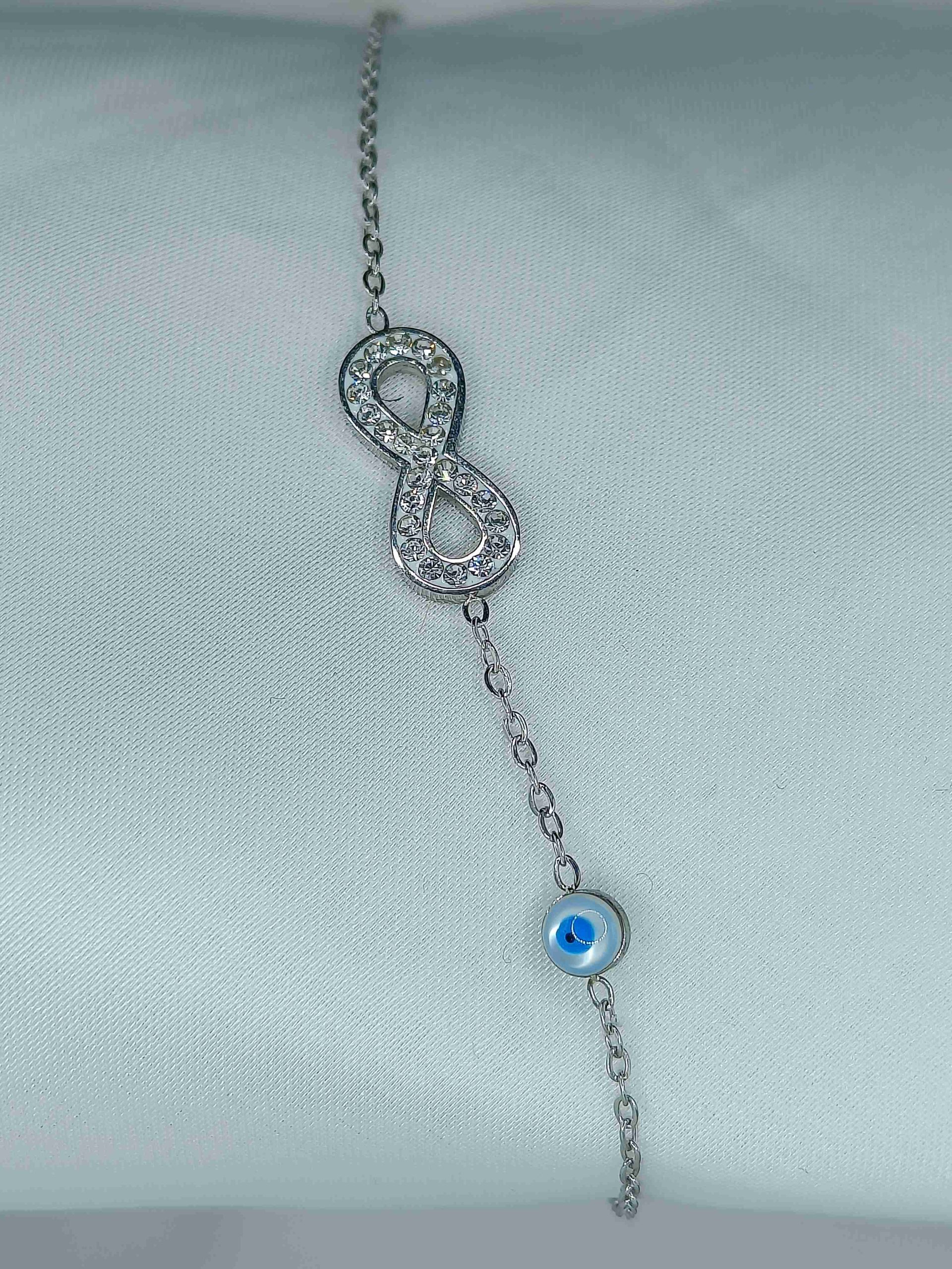Ένα κομψό και διαχρονικό βραχιόλι από ανοξείδωτο ατσάλι, διακοσμημένο με το σύμβολο του απείρου με λαμπερά στρας, που εκφράζει την αιώνια σύνδεση και την αρμονία.