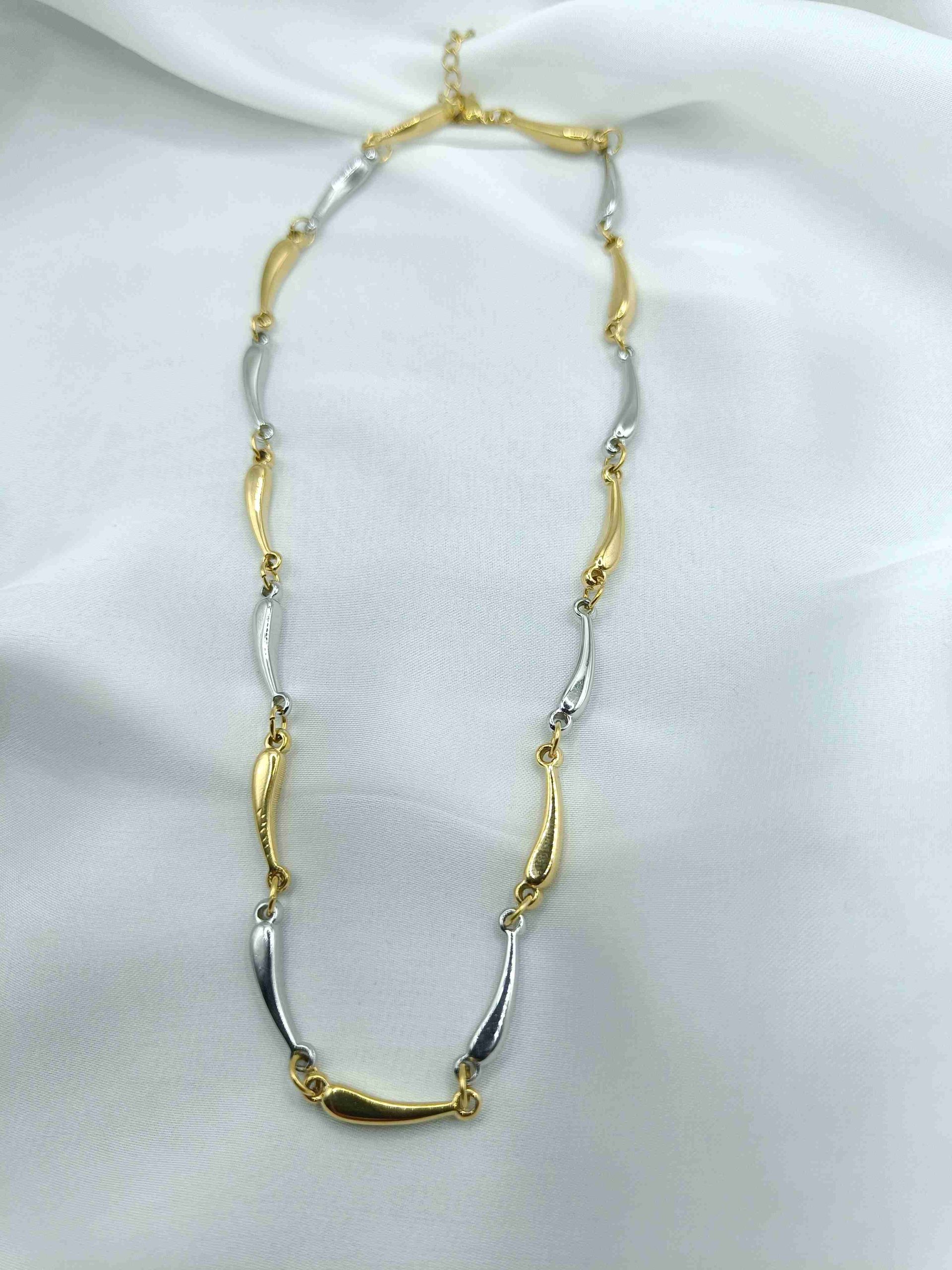 Το Dorlina είναι ένα κολιέ που παίζει με το φως και την κίνηση. Μικρά, σταθερά στοιχεία που θυμίζουν σταγόνες ενώνονται εναλλάξ σε χρυσό και ασημί, δημιουργώντας μια αρμονική ροή και έναν διακριτό ρυθμό πάνω στο δέρμα. Κομψό, σύγχρονο και μοναδικό, το Dorlina αναδεικνύει τη λεπτή πολυτέλεια μέσα από την αντίθεση και τη λεπτομέρεια. Ιδανικό για mix metal look.