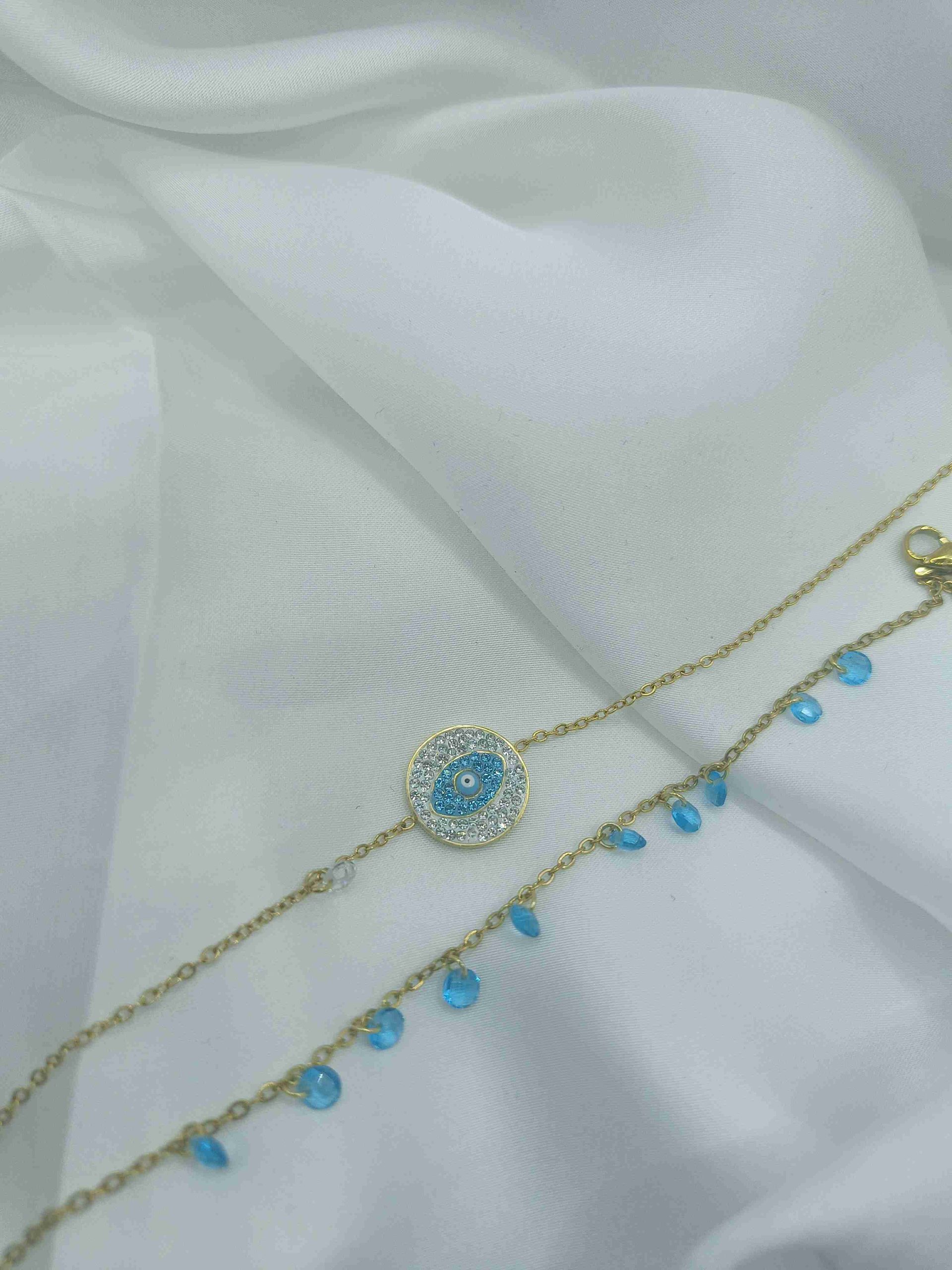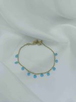 Ένα λεπτεπίλεπτο βραχιόλι από ανοξείδωτο ατσάλι σε χρυσό χρώμα, διακοσμημένο με δέκα διακριτικά στρογγυλά τιρκουάζ κρυσταλλάκια που αιωρούνται ανάλαφρα στην κίνηση. Μία φρέσκια, καλοκαιρινή πινελιά που προσδίδει χρώμα χωρίς υπερβολή, ιδανική για να συνοδεύσει κάθε εμφάνιση — από το πρωί μέχρι το ηλιοβασίλεμα.
