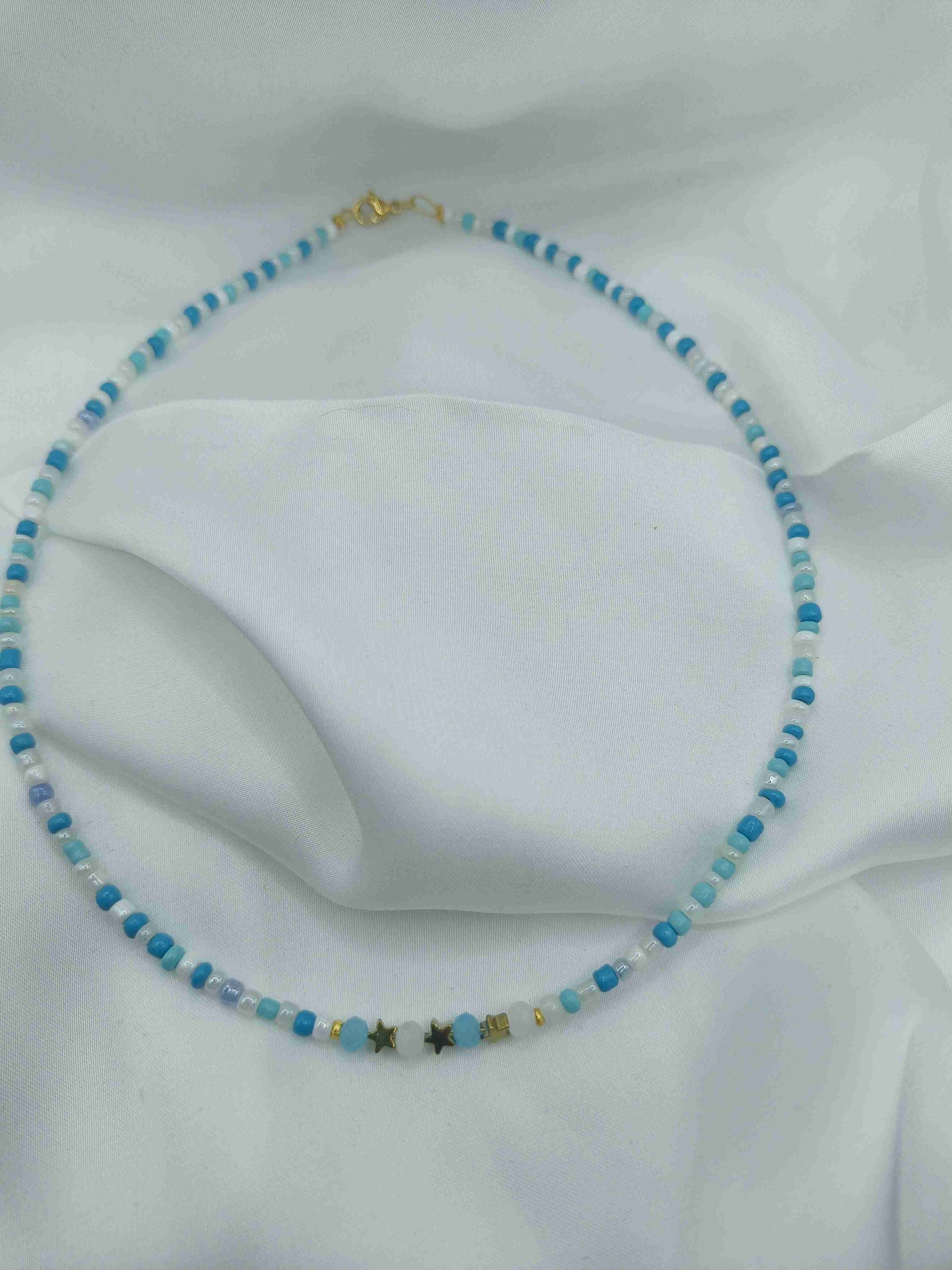 Το Estel Turquoise είναι ένα χειροποίητο κολιέ με χάντρες σε αποχρώσεις του τιρκουάζ και του λευκού, που αποπνέει φρεσκάδα, καλοκαιρινό φως και ανεμελιά.