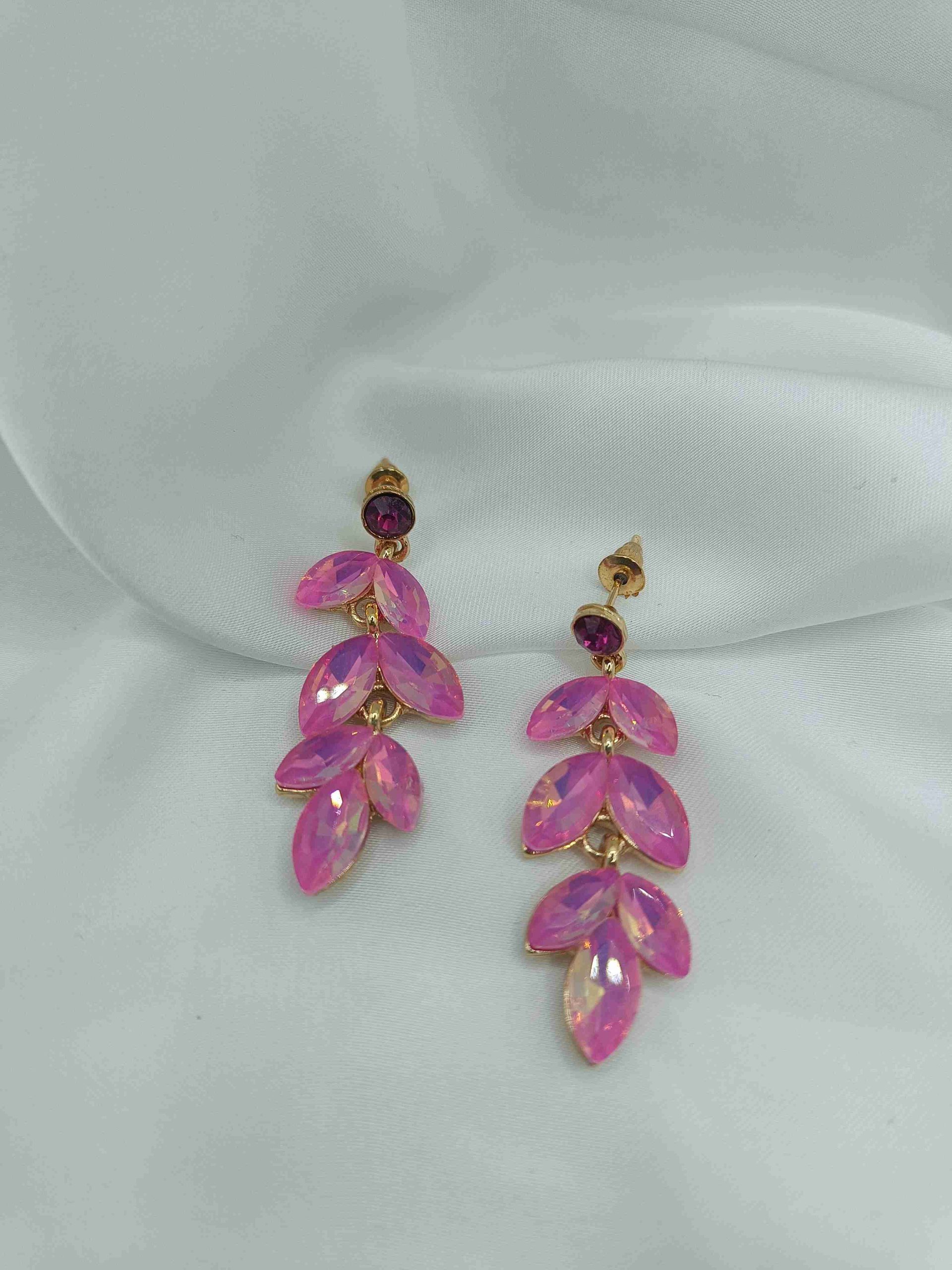 Ένα statement σκουλαρίκι που μαγνητίζει. Οι τρεις σειρές από φούξια κρυστάλλινα φύλλα δημιουργούν μια σύνθεση γεμάτη ένταση και δυναμισμό — ιδανικό για βραδινές εμφανίσεις που δεν περνούν απαρατήρητες.