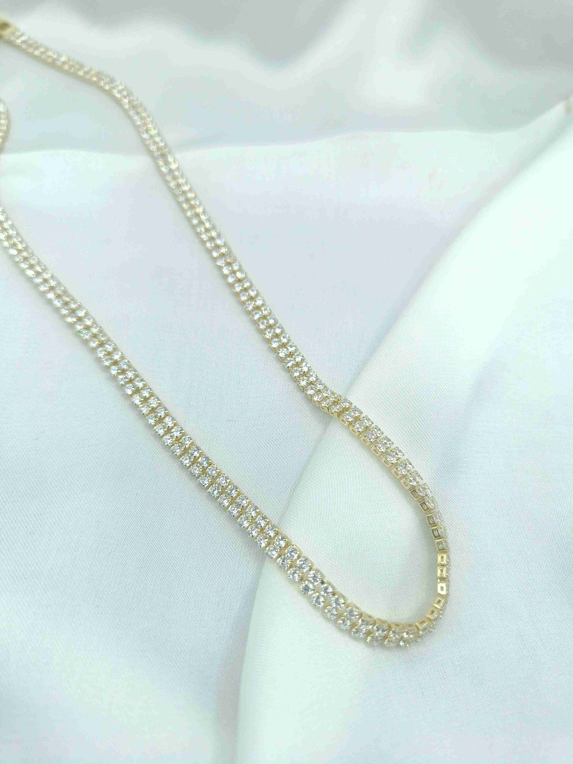 Το Gleam 2 είναι ένα εντυπωσιακό κολιέ ριβιέρα με δύο σειρές λευκών ζιργκόν, που δημιουργούν μια πλούσια και λαμπερή σύνθεση. Η συμμετρική διάταξη των λίθων εξασφαλίζει ισορροπημένη λάμψη, ενώ το διαχρονικό του σχέδιο το καθιστά ιδανικό για κάθε εμφάνιση — από καθημερινή κομψότητα μέχρι εντυπωσιακές βραδινές εμφανίσεις.