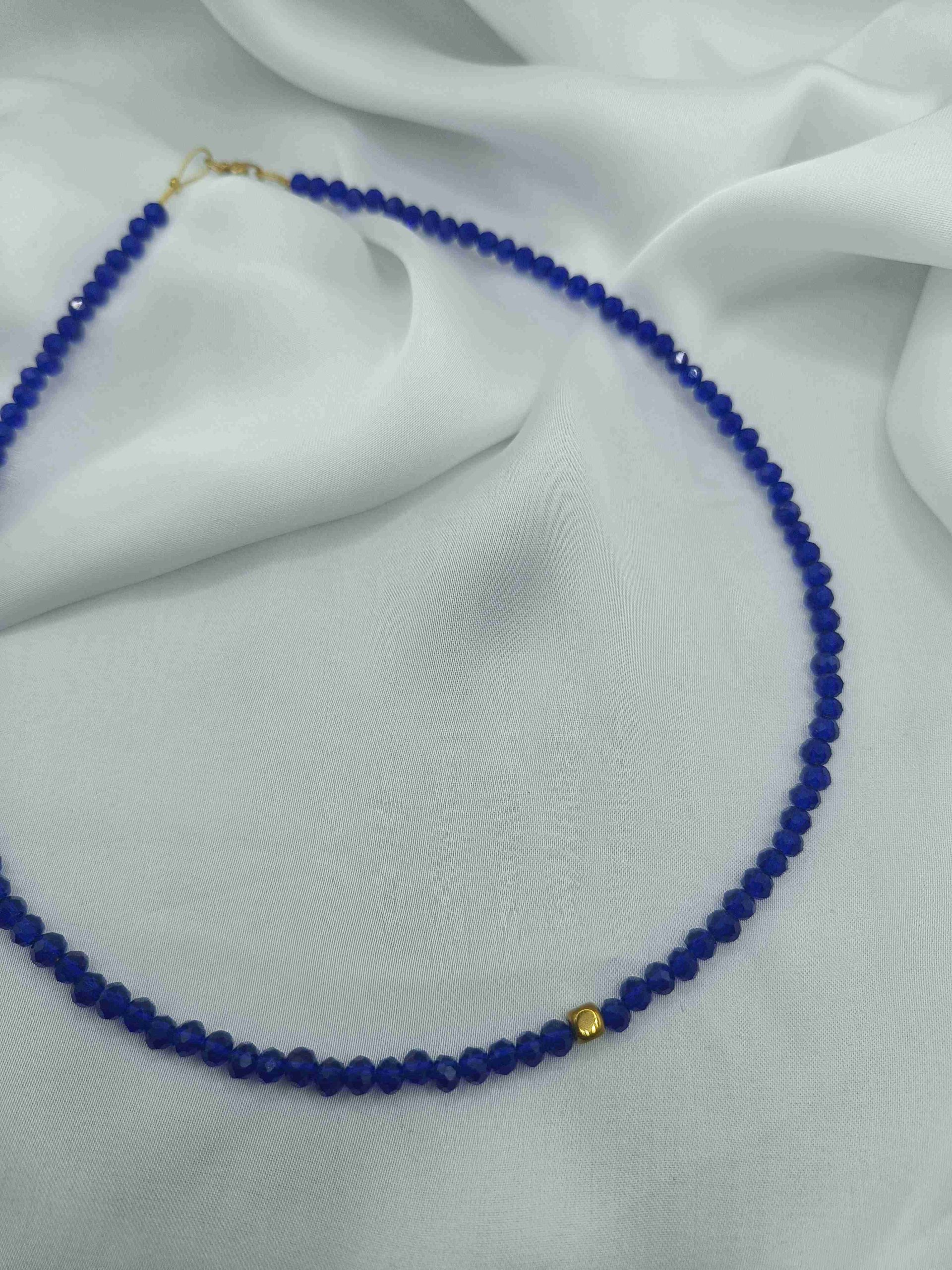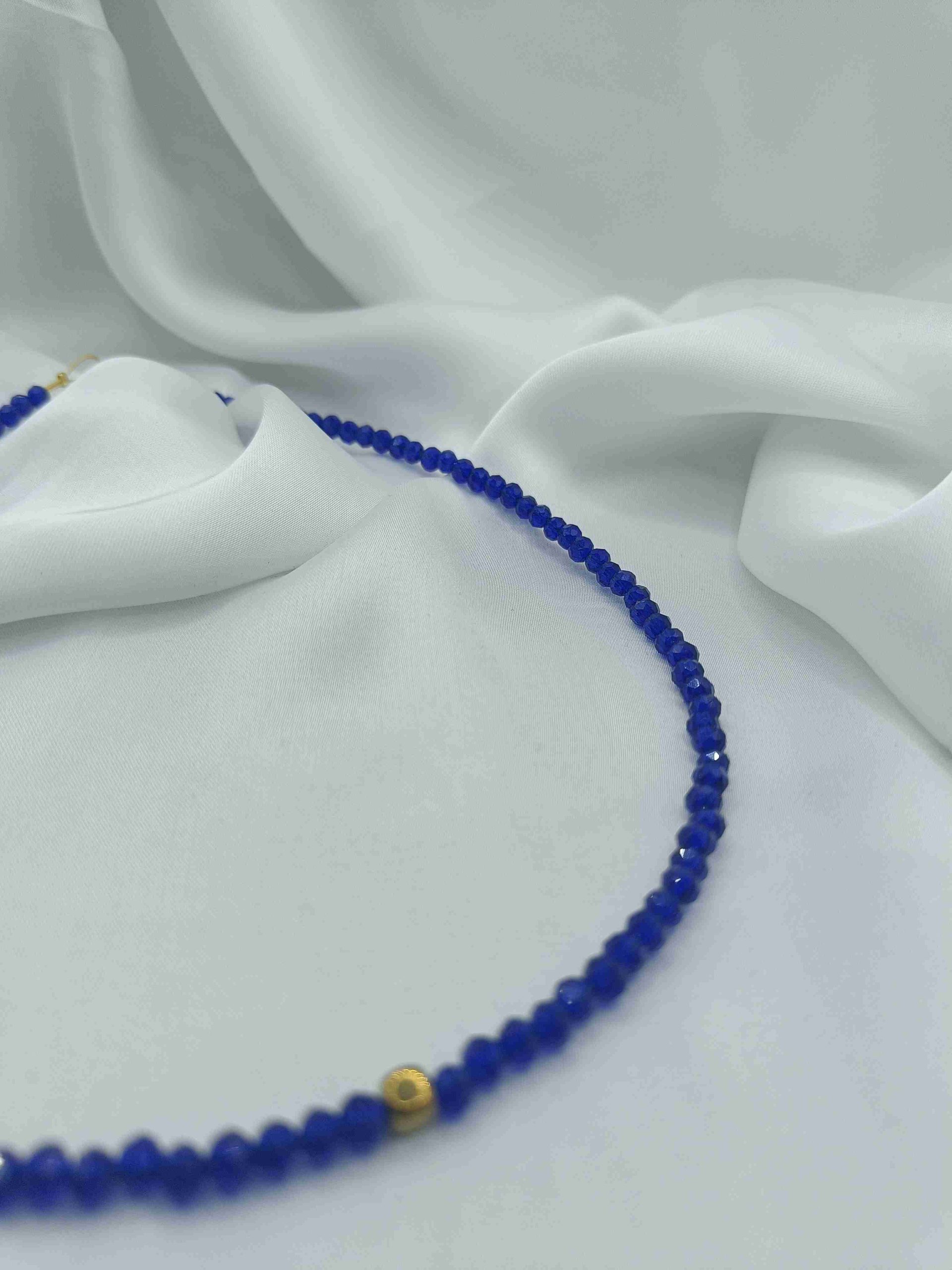 Το συγκεκριμένο κολιέ είναι φτιαγμένο με μπλε γυάλινες χάντρες και επιχρυσωμένο αιματίτη.