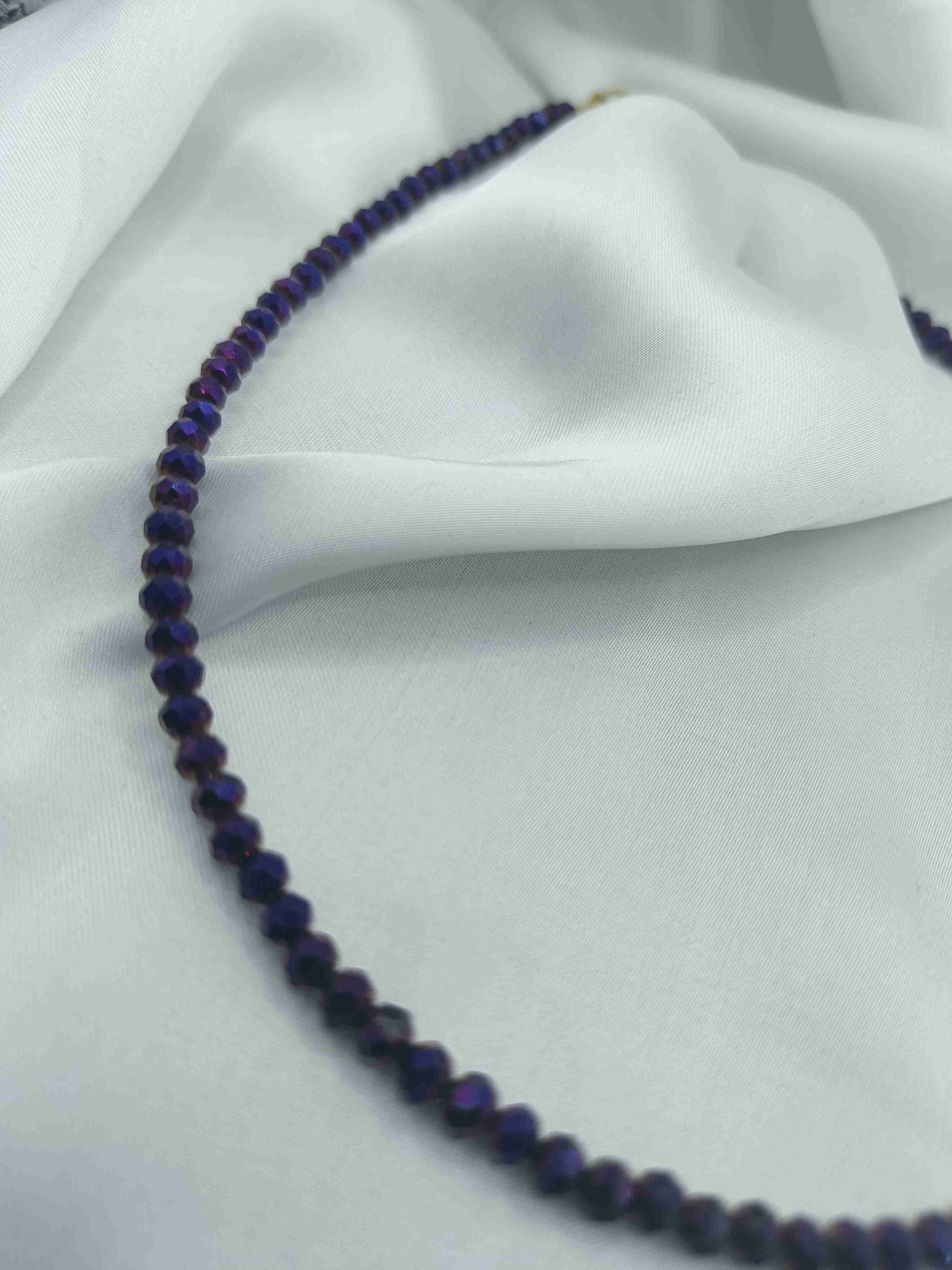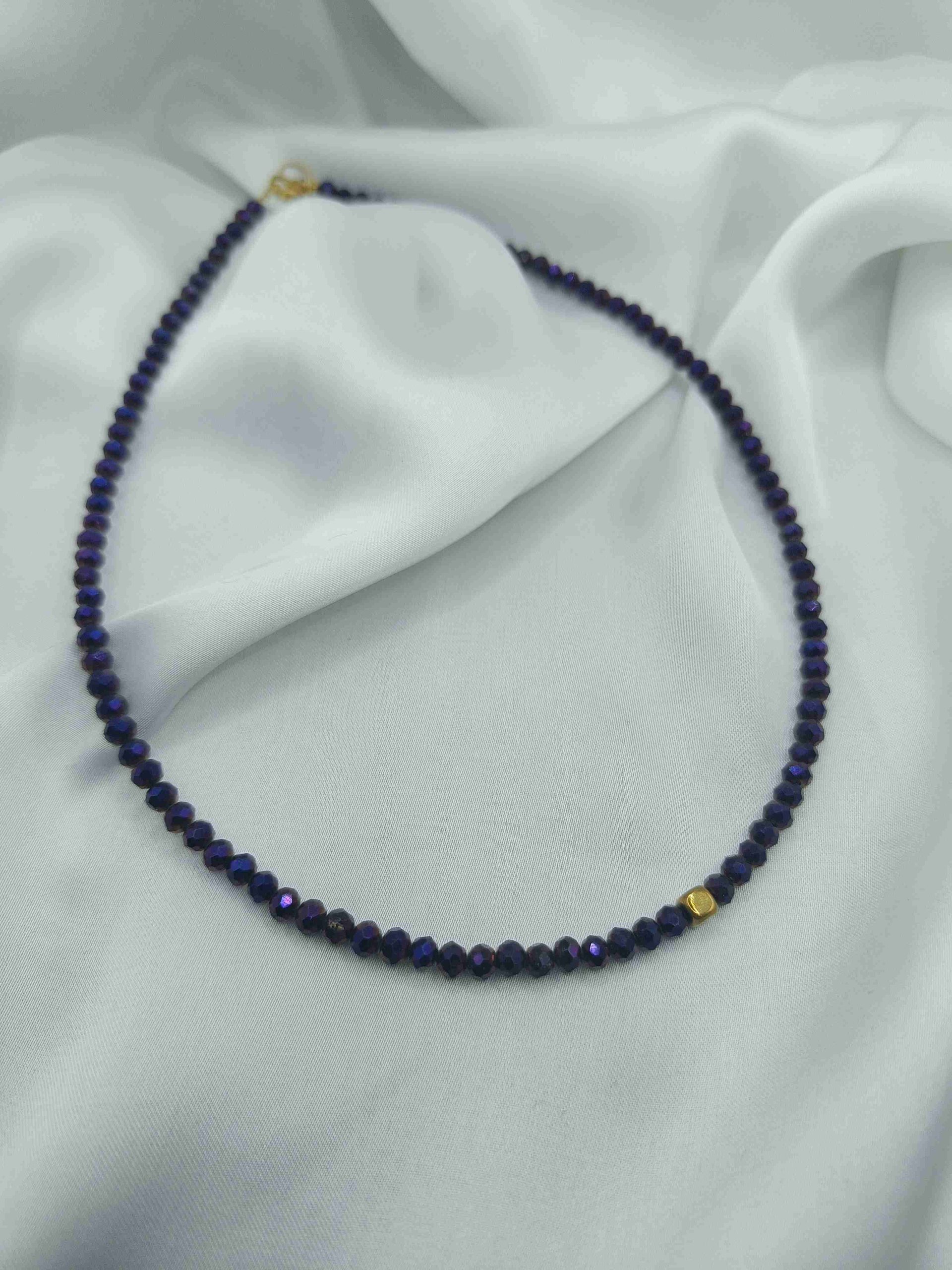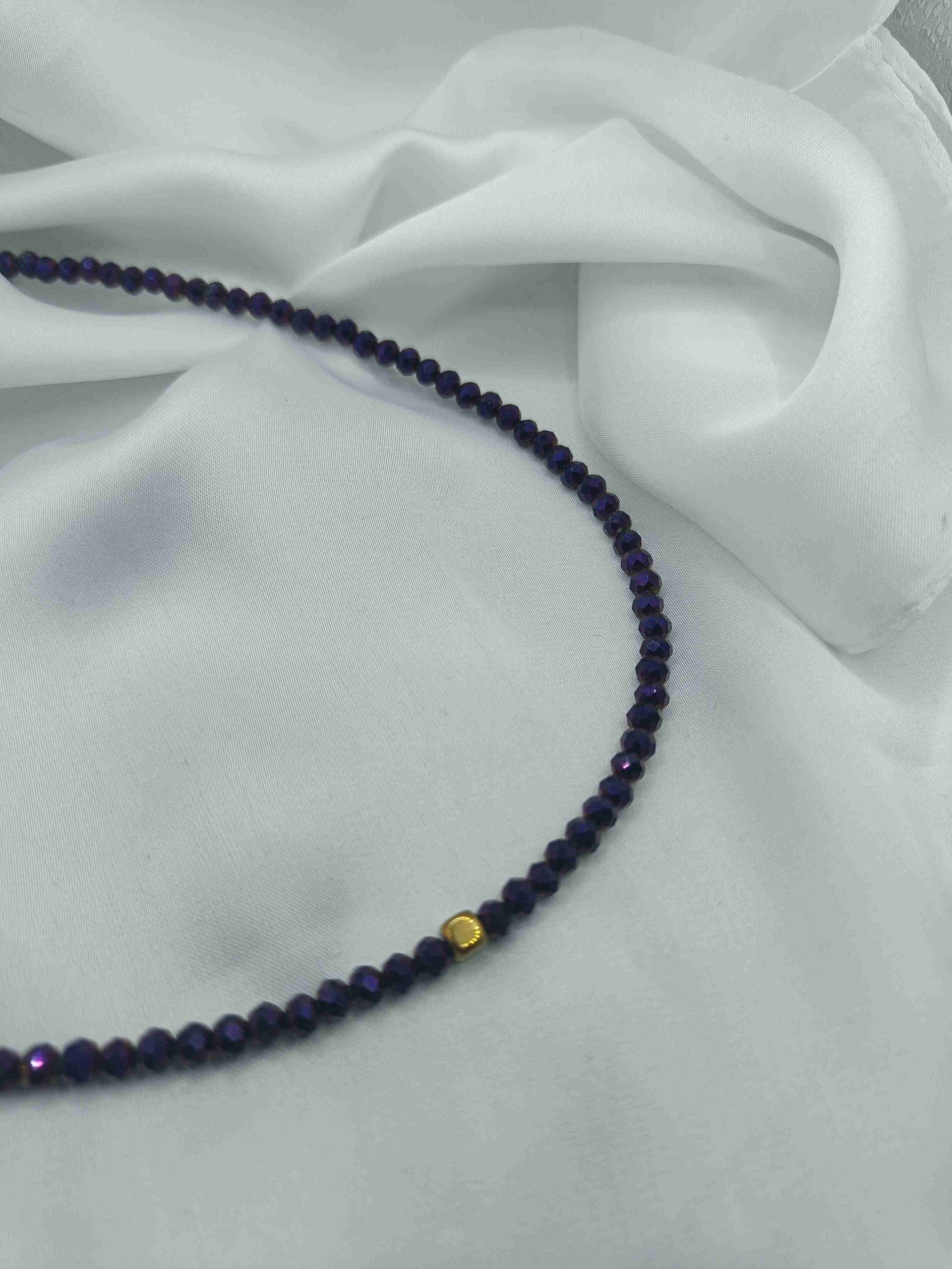 Το συγκεκριμένο κολιέ είναι φτιαγμένο με μωβ γυάλινες χάντρες και επιχρυσωμένο αιματίτη.