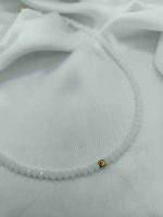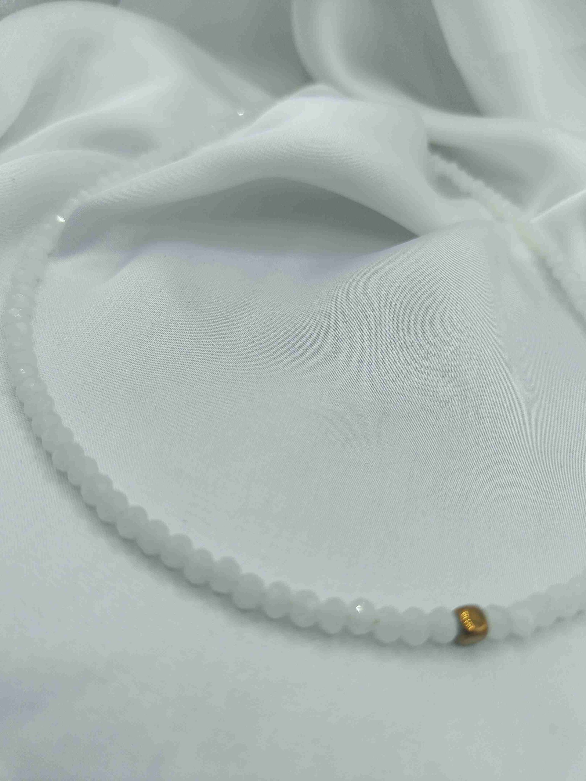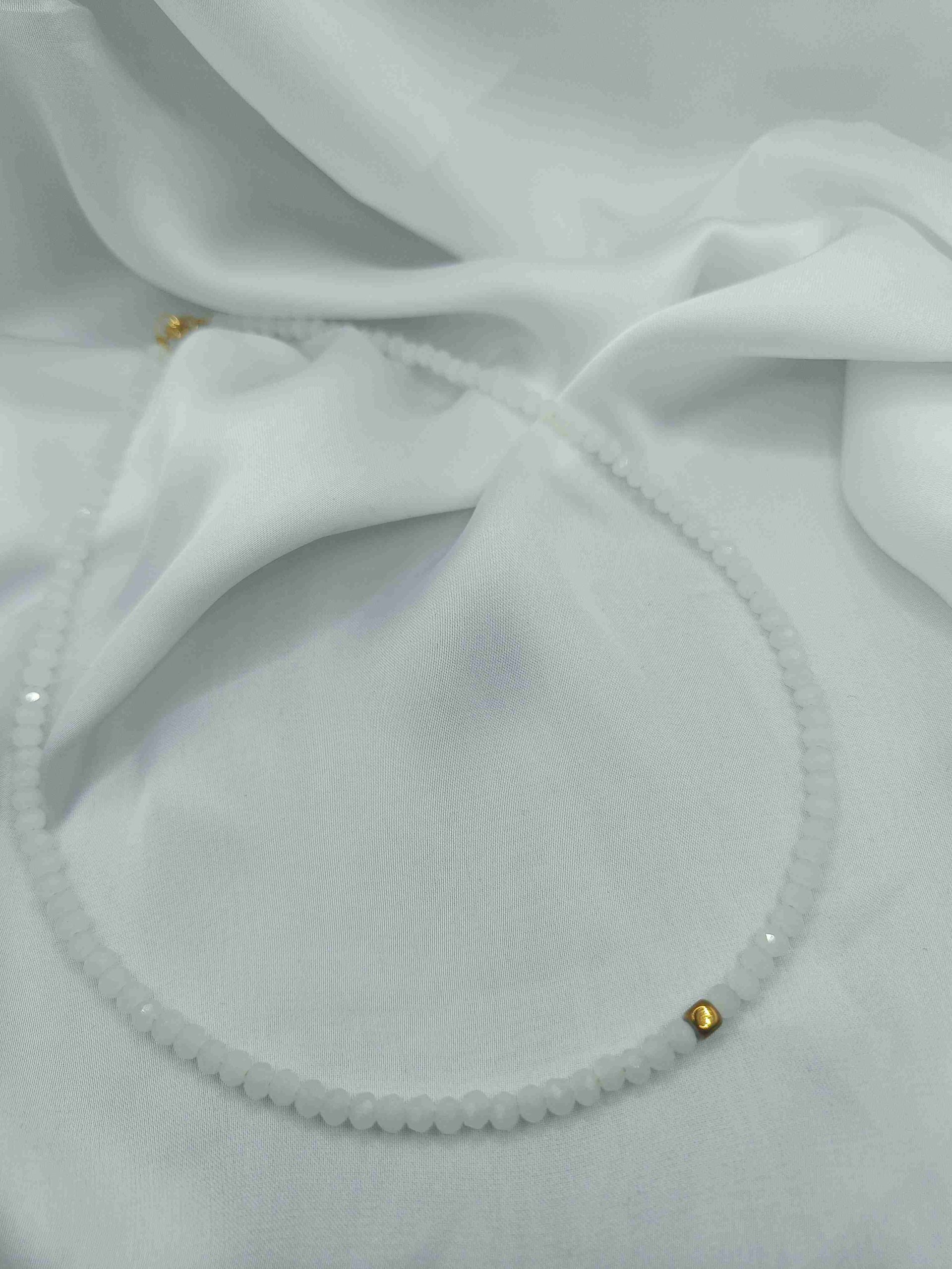 Το συγκεκριμένο κολιέ είναι φτιαγμένο με λευκές γυάλινες χάντρες και επιχρυσωμένο αιματίτη.