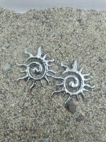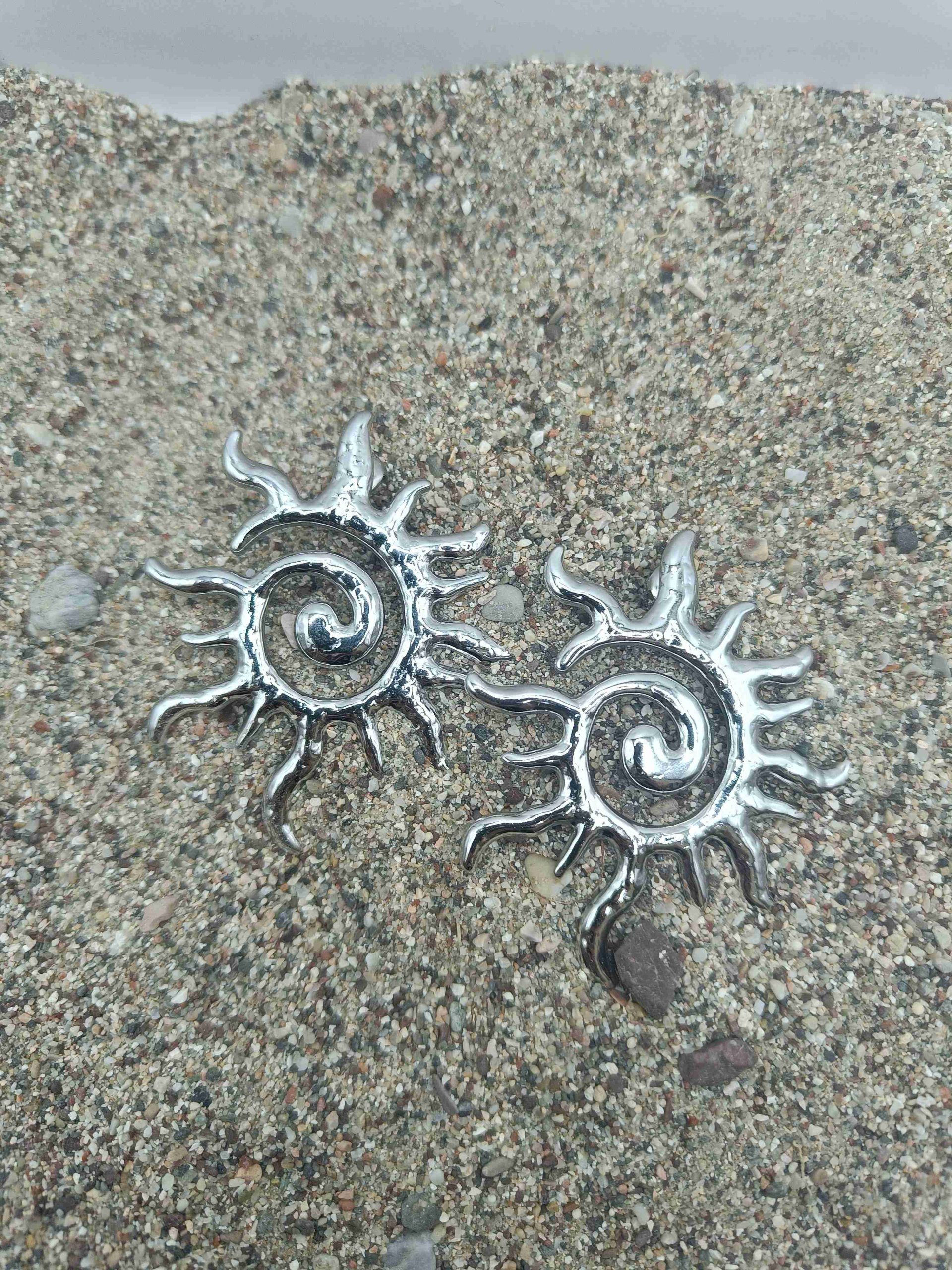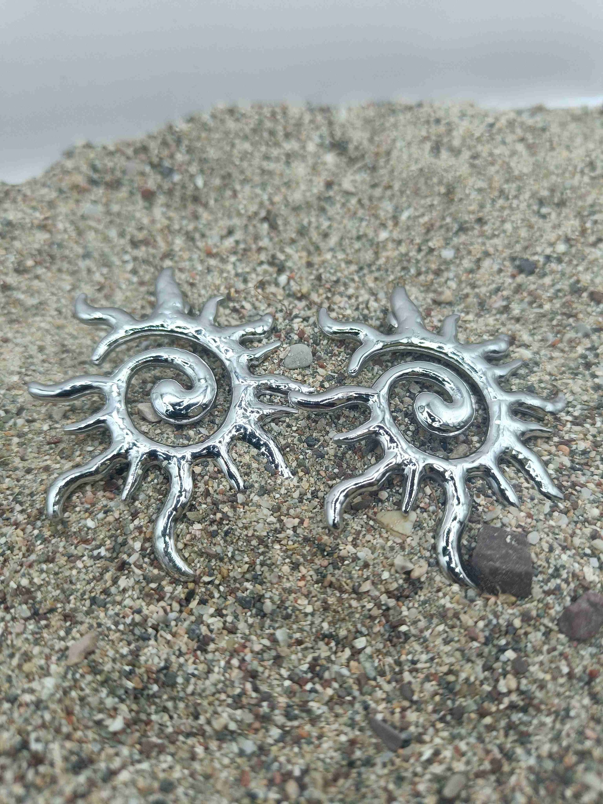 Statement σκουλαρίκια από ανοξείδωτο ατσάλι σε ασημί χρώμα, με εντυπωσιακό σχέδιο ήλιου και κυματιστή, σπειροειδή λεπτομέρεια στο κέντρο. Ένα σύμβολο δύναμης και ελευθερίας, εμπνευσμένο από τη λαμπρότητα του καλοκαιρινού ήλιου.