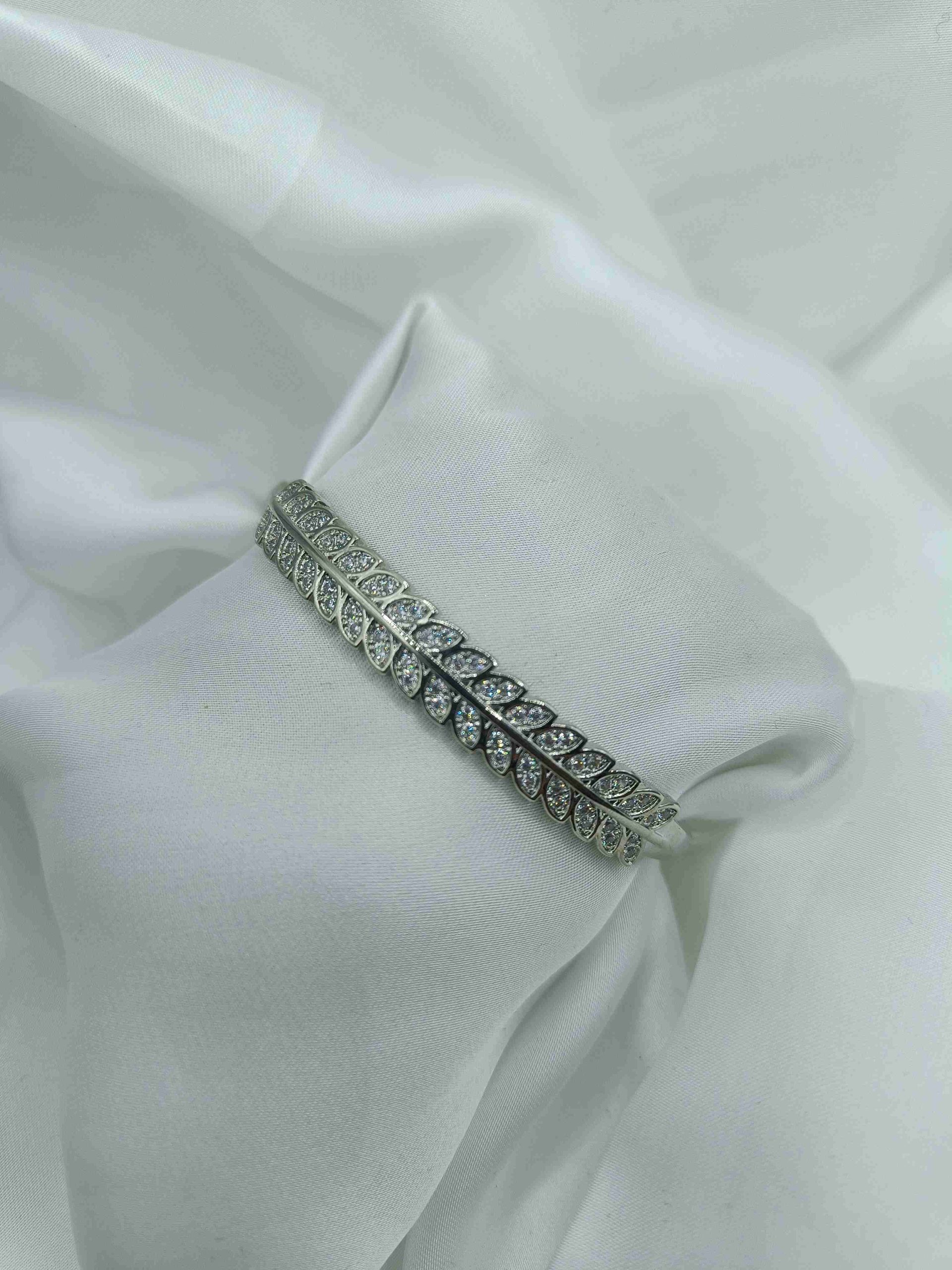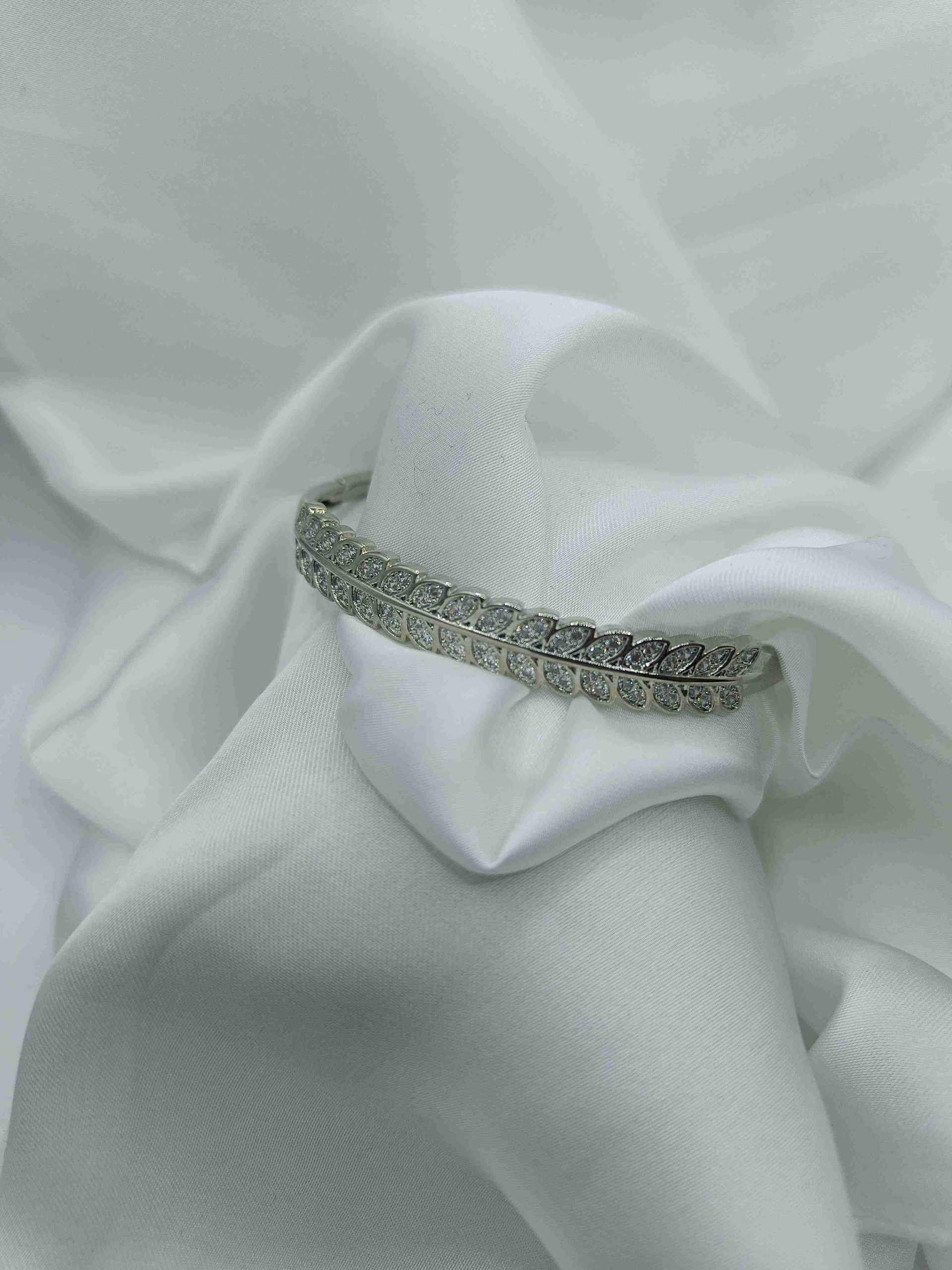 Ένα κομψό βραχιόλι από ανοξείδωτο ατσάλι, διακοσμημένο με λεπτεπίλεπτα φυλλαράκια και λαμπερά στρας. Ο διαχρονικός του σχεδιασμός αποπνέει ρομαντισμό και φινέτσα, κάνοντας το ιδανικό για κάθε εμφάνιση.
