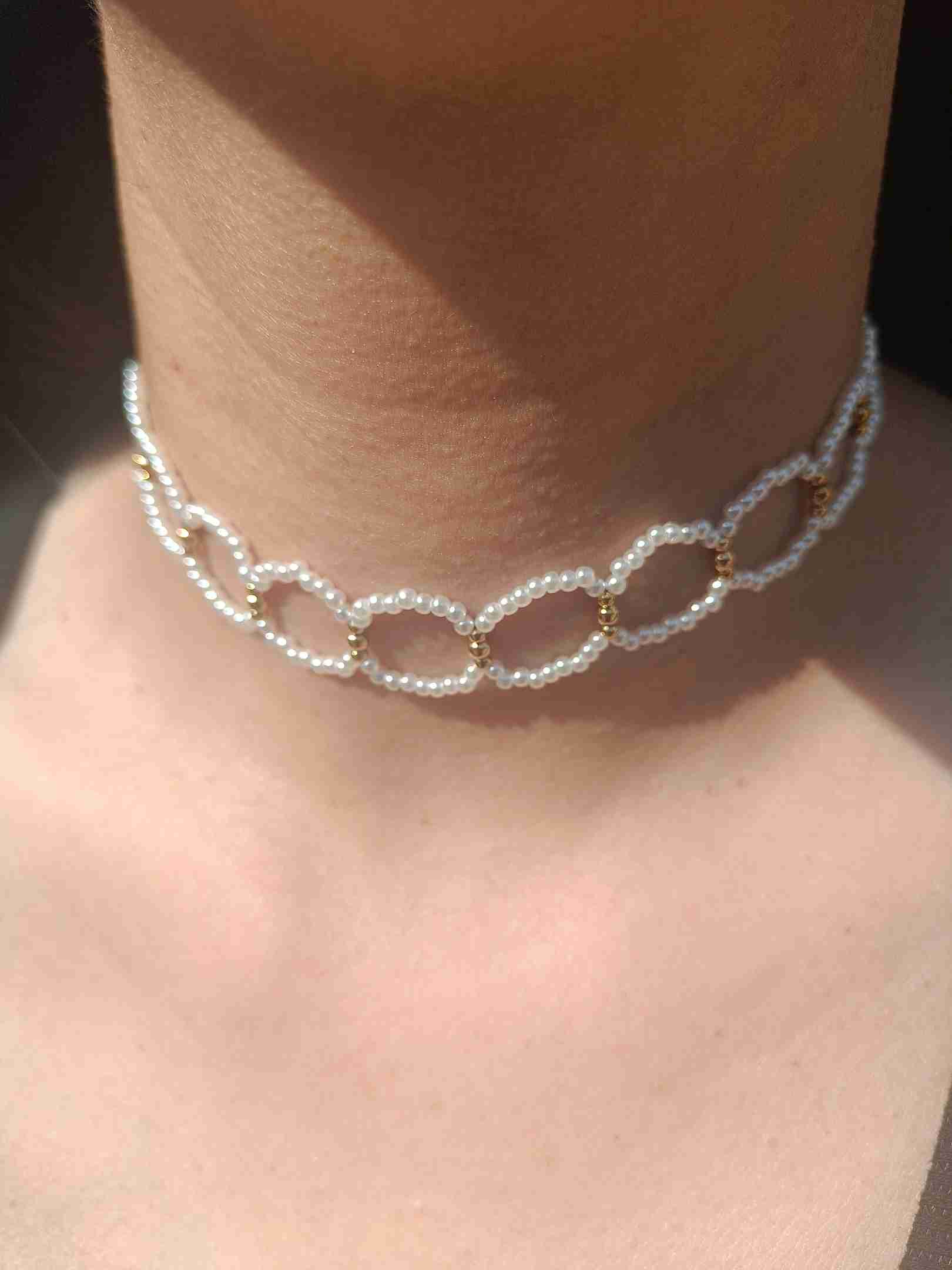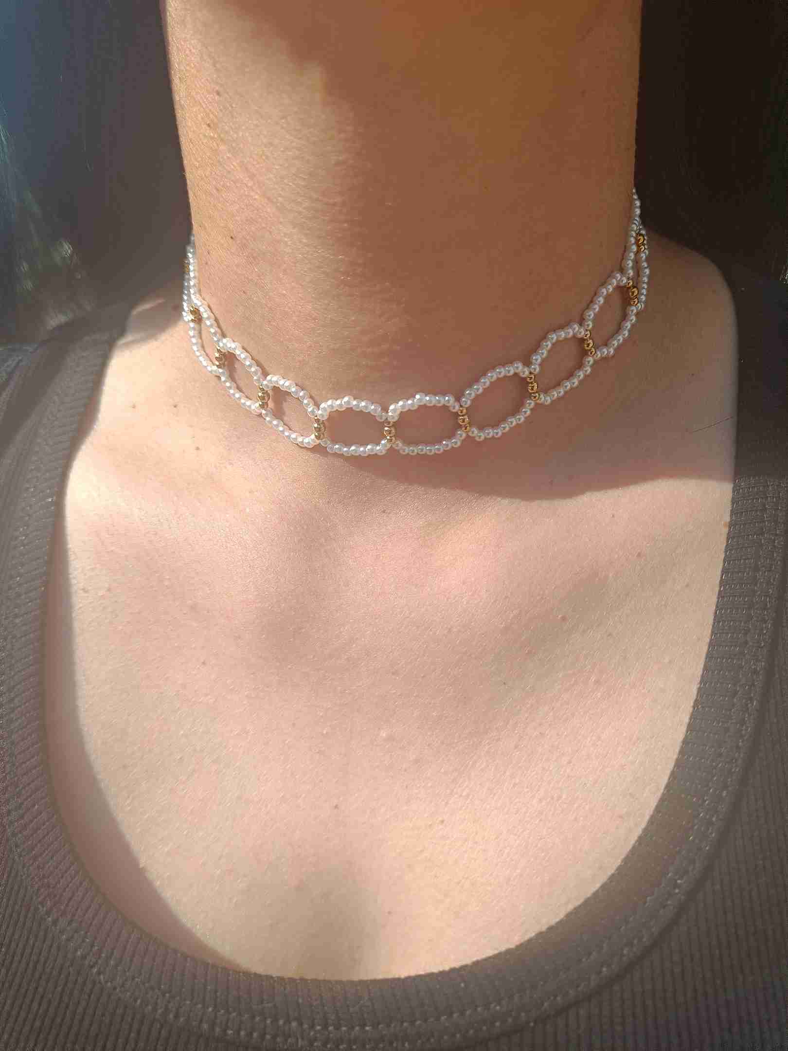 Ένα εκλεπτυσμένο τσόκερ-κολιέ από λευκές και χρυσές χάντρες που σχηματίζουν κυκλικά μοτίβα, σαν μικρούς φωτεινούς ήλιους που αγκαλιάζουν τον λαιμό. Το Ivorelle συνδυάζει τη διαχρονική καθαρότητα του λευκού με τη ζεστή λάμψη του χρυσού, δημιουργώντας ένα κόσμημα που φοριέται εύκολα αλλά ξεχωρίζει διακριτικά.