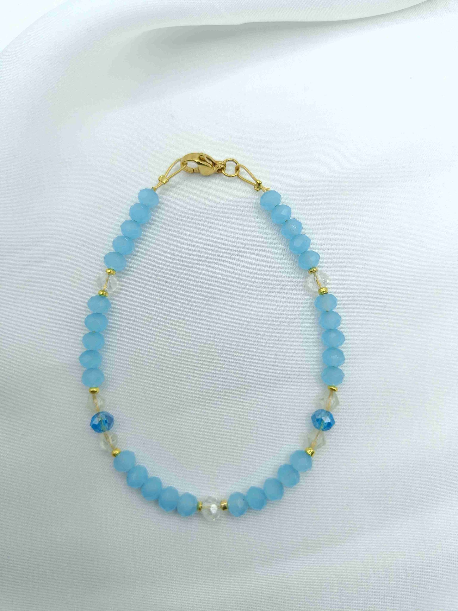 Εμπνευσμένο από τα τιρκουάζ νερά της Αμοργού, αυτό το βραχιόλι με τιρκουάζ και διάφανες χάντρες αποπνέει δροσιά, καλοκαιρινή ανεμελιά και αυθεντικότητα.