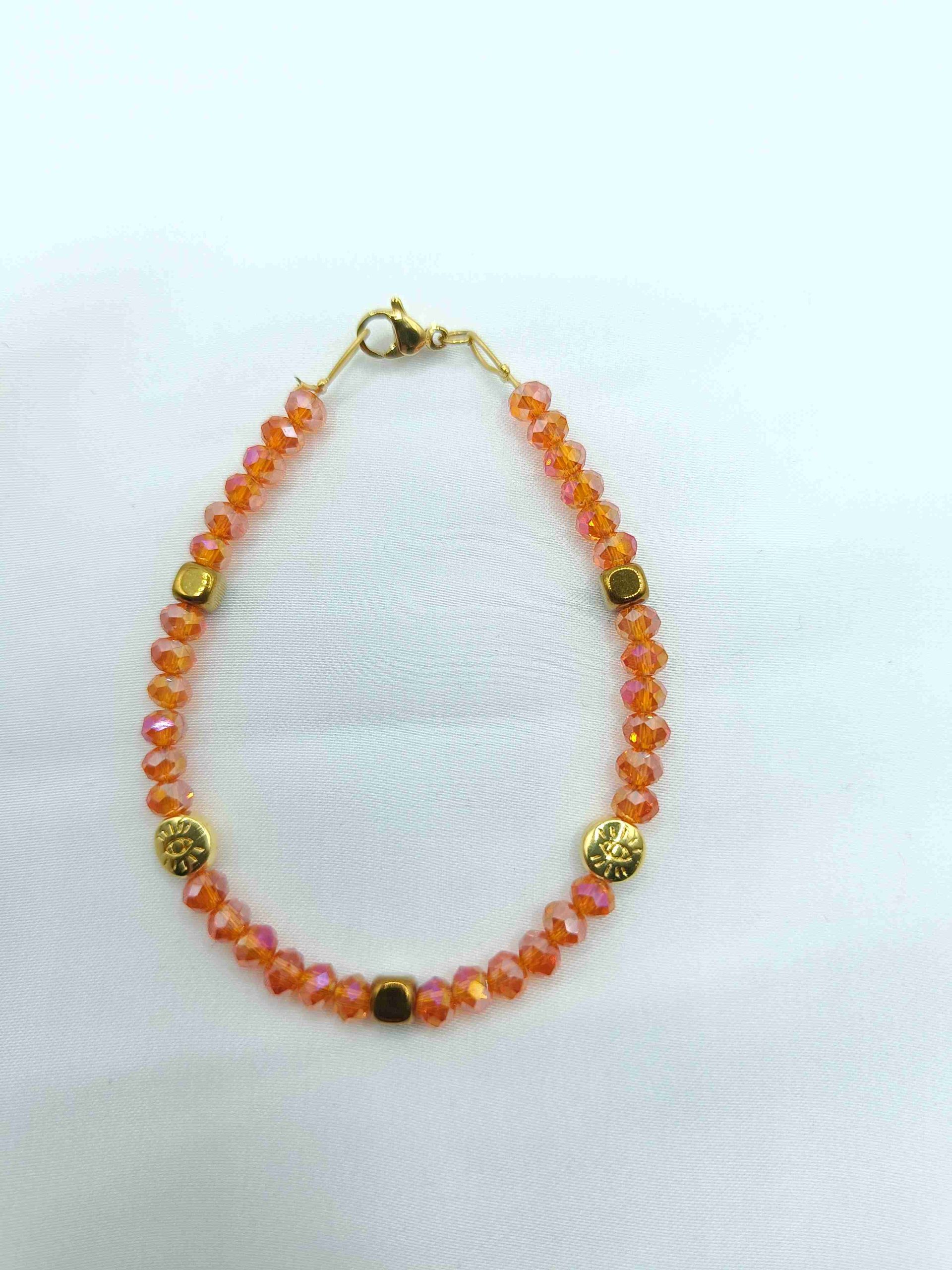 Ζεστές πορτοκαλί χάντρες, ματάκια και λαμπερός επιχρυσωμένος αιματίτης δημιουργούν ένα αισιόδοξο, καλοκαιρινό βραχιόλι που ακτινοβολεί θετική ενέργεια.