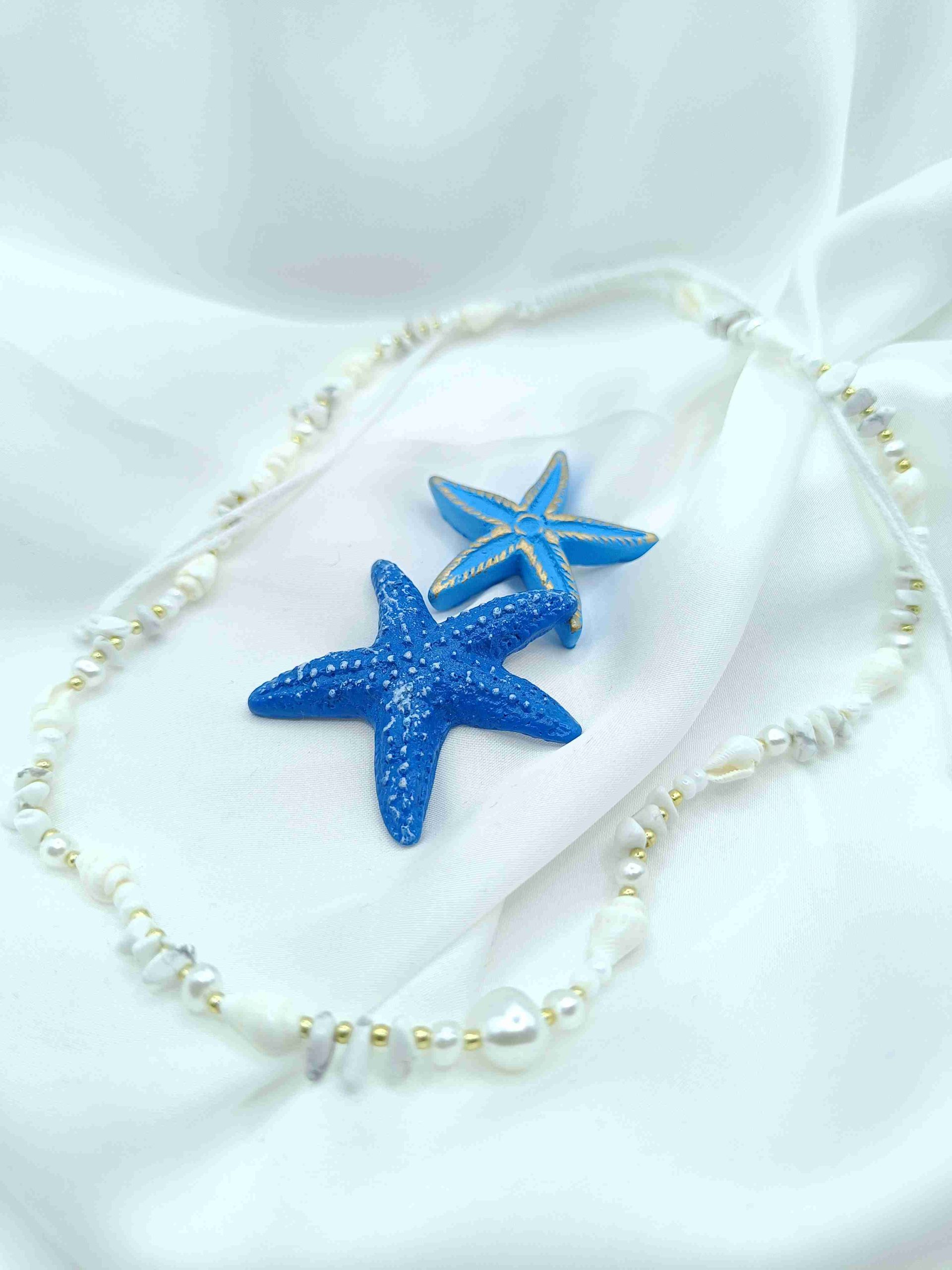 Μια ήρεμη, φυσική σύνθεση από λευκά κοχύλια, πέρλες και χρυσές λεπτομέρειες, που ακτινοβολεί διακριτική κομψότητα. Το Kyma White αποπνέει καθαρότητα και απλότητα, ιδανικό για ηλιόλουστες εμφανίσεις με minimal διάθεση.