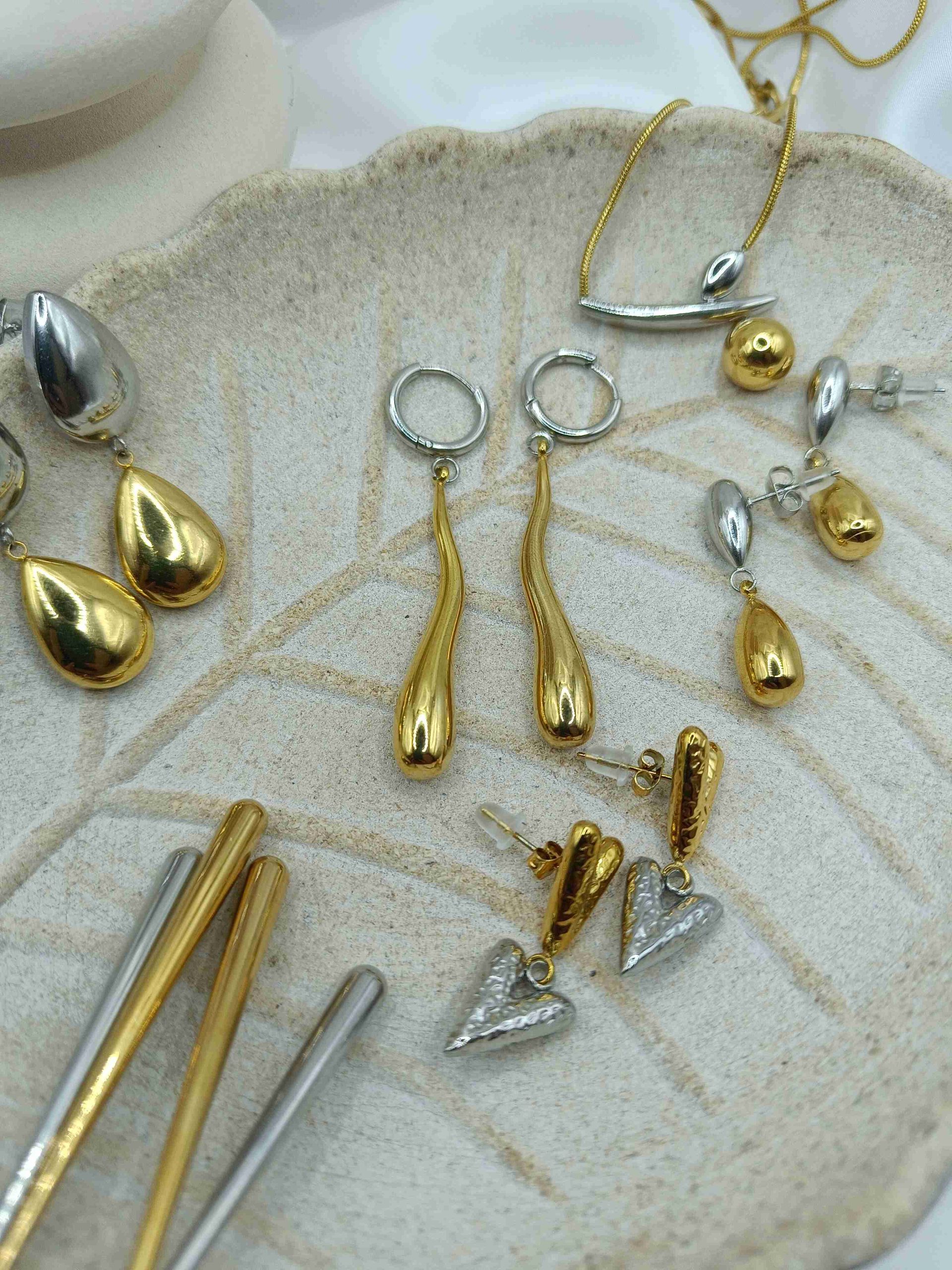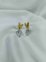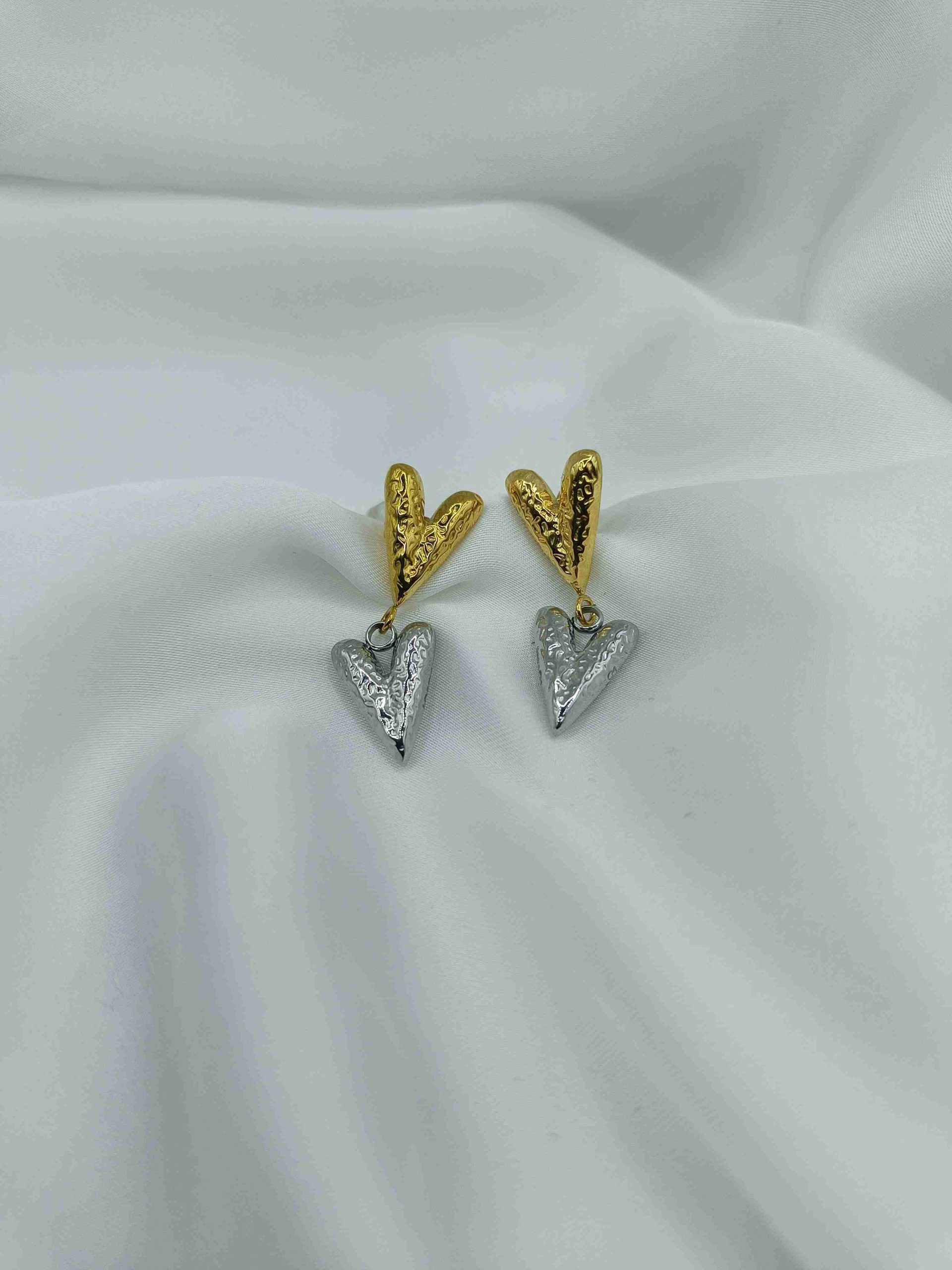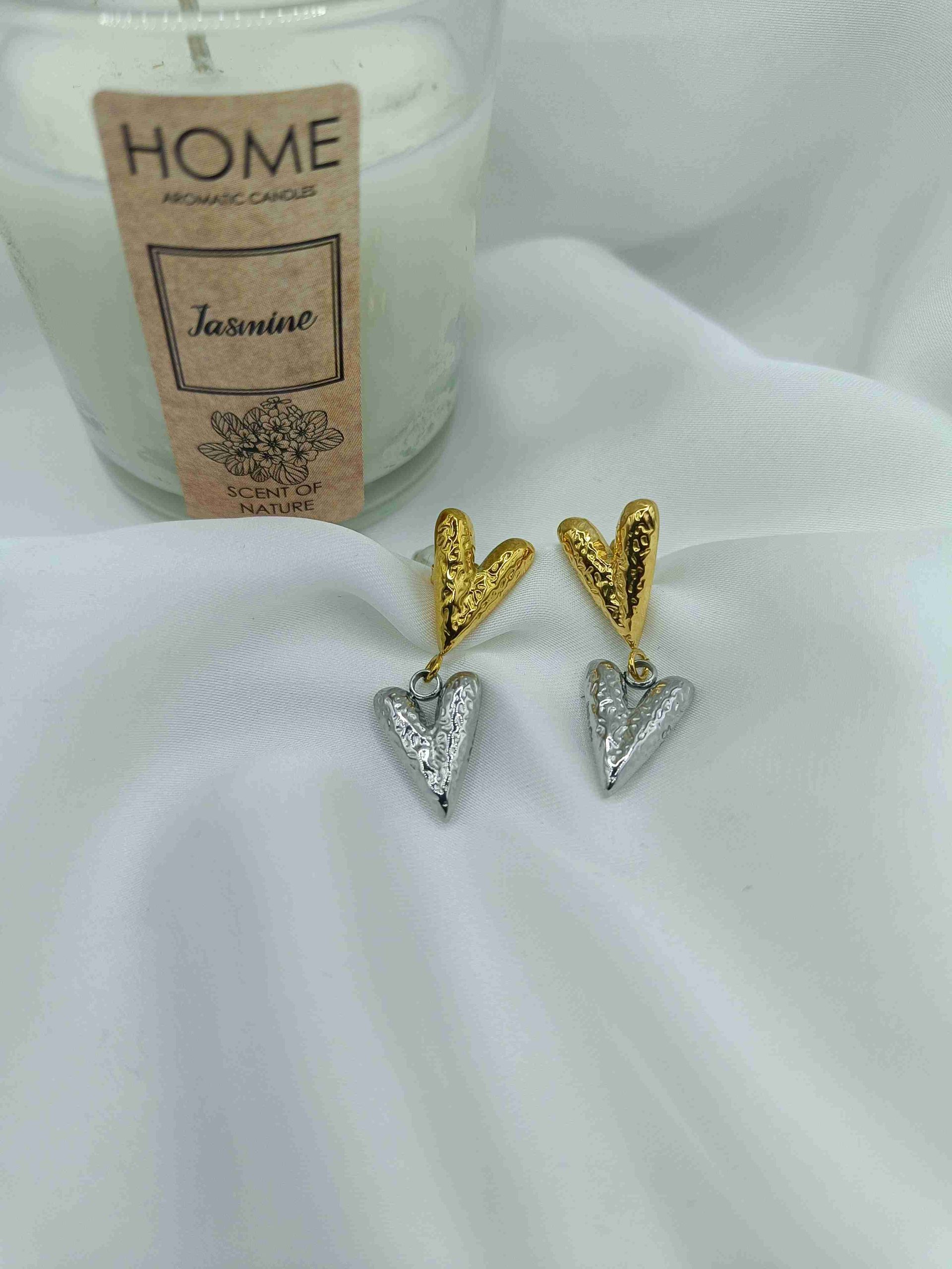 Κομψά ατσαλινα σκουλαρίκια σε χρυσό και ασημί χρώμα, με μια σφυριλατη χρυσή καρδιά στο επάνω μέρος και μια ασημί σφυριλατη καρδιά στο κάτω μέρος. Ο μοναδικός συνδυασμός των δύο καρδιών προσφέρει έναν ισχυρό ρομαντικό χαρακτήρα με διακριτική κομψότητα. Ιδανικά για να προσθέσουν μία ιδιαίτερη λάμψη και ρομαντισμό στην εμφάνισή σας.