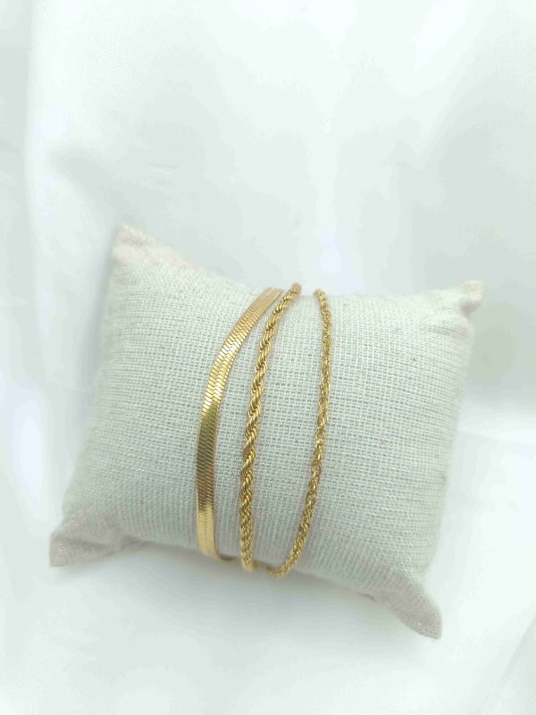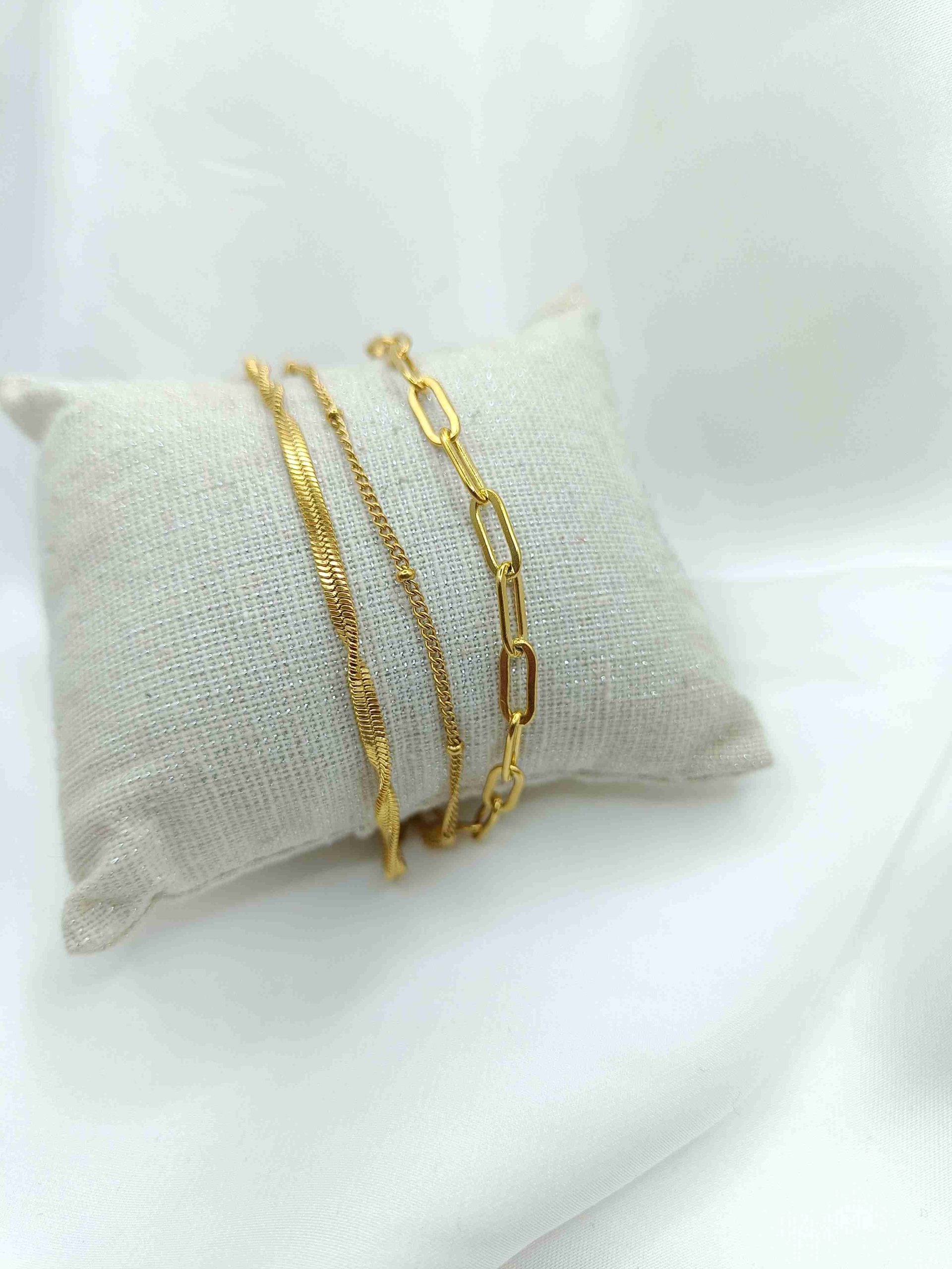Ένα μοντέρνο βραχιόλι από ανοξείδωτο ατσάλι σε χρυσό χρώμα, που συνδυάζει τρεις διαφορετικές αλυσίδες σε έναν κομψό σχεδιασμό. Η πρώτη είναι πλακέ-στριφτή, η δεύτερη μια κλασική αλυσίδα με μπιλάκια, και η τρίτη αποτελείται από ιδιαίτερους κρίκους.