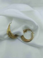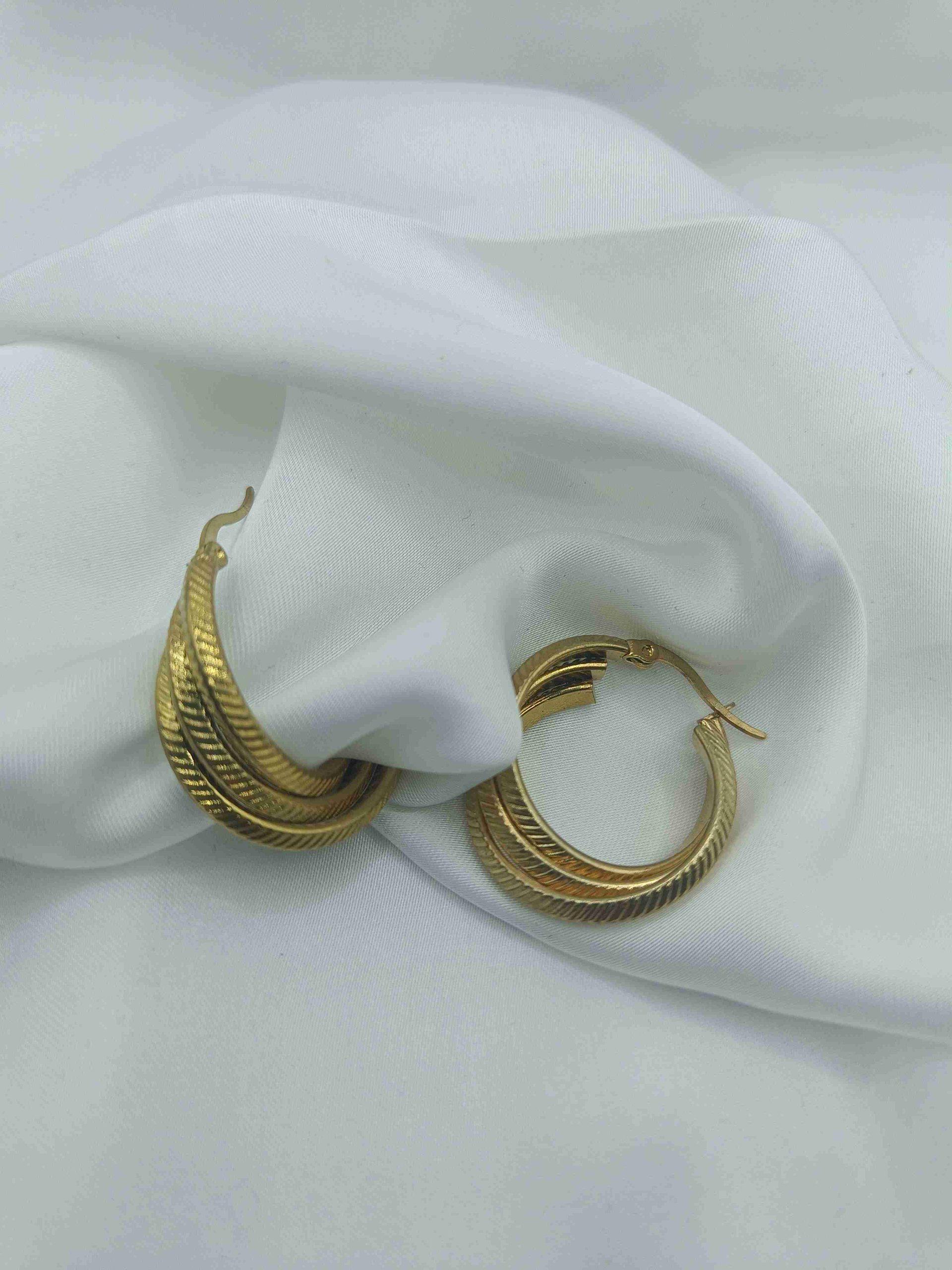 Κρίκοι μεσαίου μεγέθους από ανοξείδωτο ατσάλι με χρυσή λάμψη και ανάγλυφη υφή που δημιουργεί ένα δυναμικό, σχεδόν γλυπτικό εφέ. Ιδανικοί για να αναδείξουν κάθε εμφάνιση, από πρωινό look μέχρι βραδινή έξοδο. Μπορούν να φορεθούν μόνα τους ή να συνδυαστούν με άλλα κοσμήματα της συλλογής μας για ένα ολοκληρωμένο, κομψό layering.