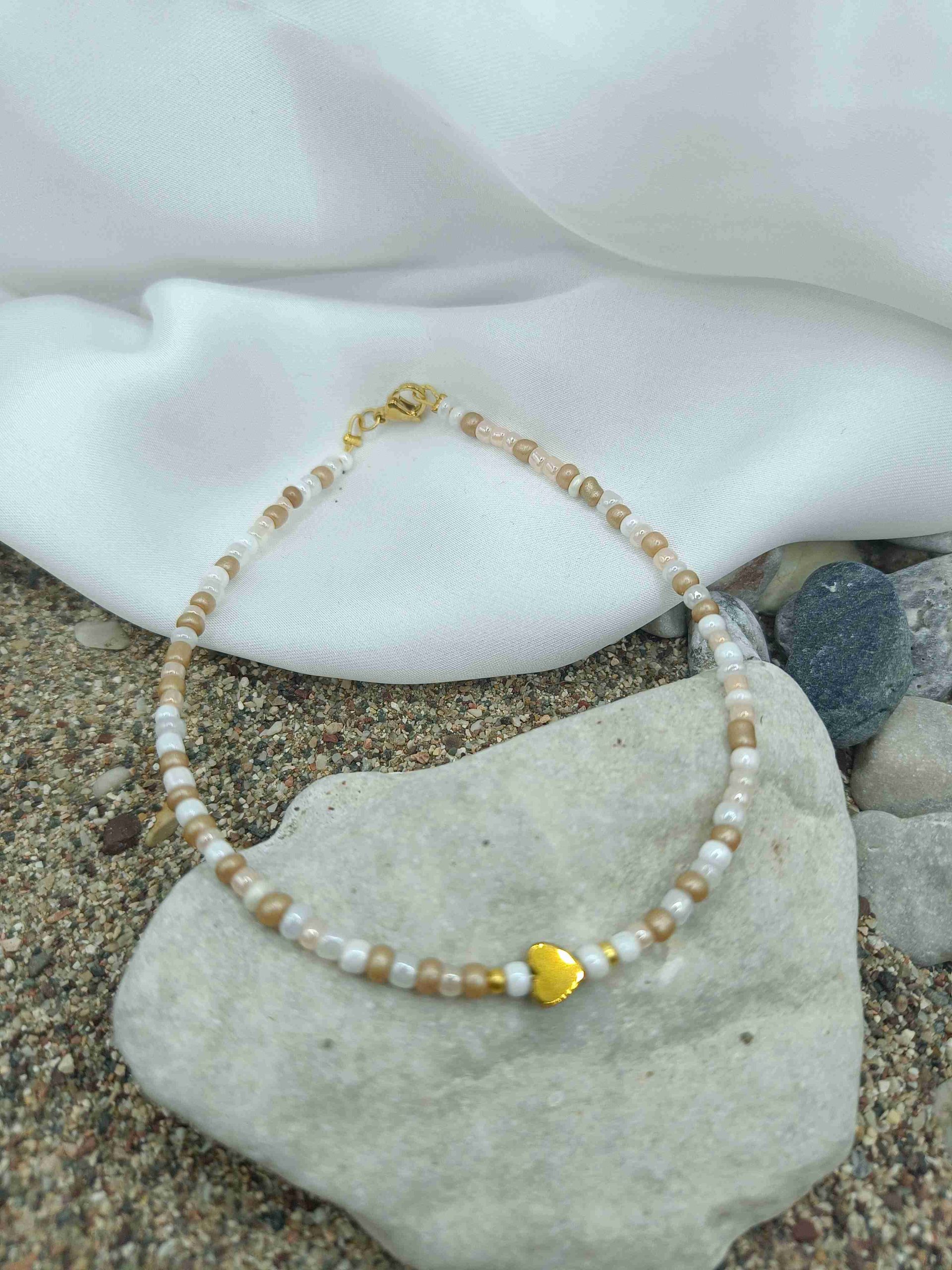 Διακριτικό και ευέλικτο, με nude χάντρες και μια μικρή καρδούλα από επιχρυσωμένο αιματίτη για μια φυσική κομψότητα που ξεχωρίζει.