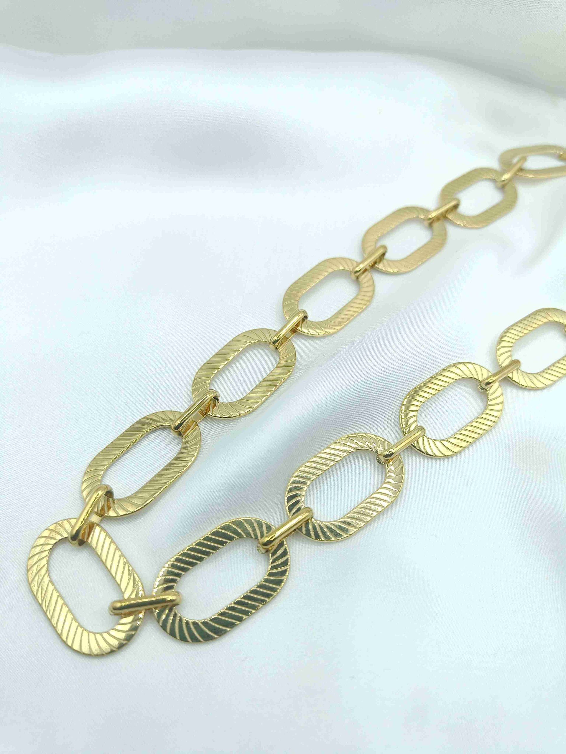 Από ανοξείδωτο ατσάλι σε χρυσό χρώμα, το Luz είναι ένα statement κολιέ που συνδυάζει τη δυναμική παρουσία με τη διακριτική λάμψη. Οι ανάγλυφοι κρίκοι του αντανακλούν το φως σε κάθε κίνηση, δημιουργώντας ένα παιχνίδι λάμψης και υφής που δεν περνά απαρατήρητο.