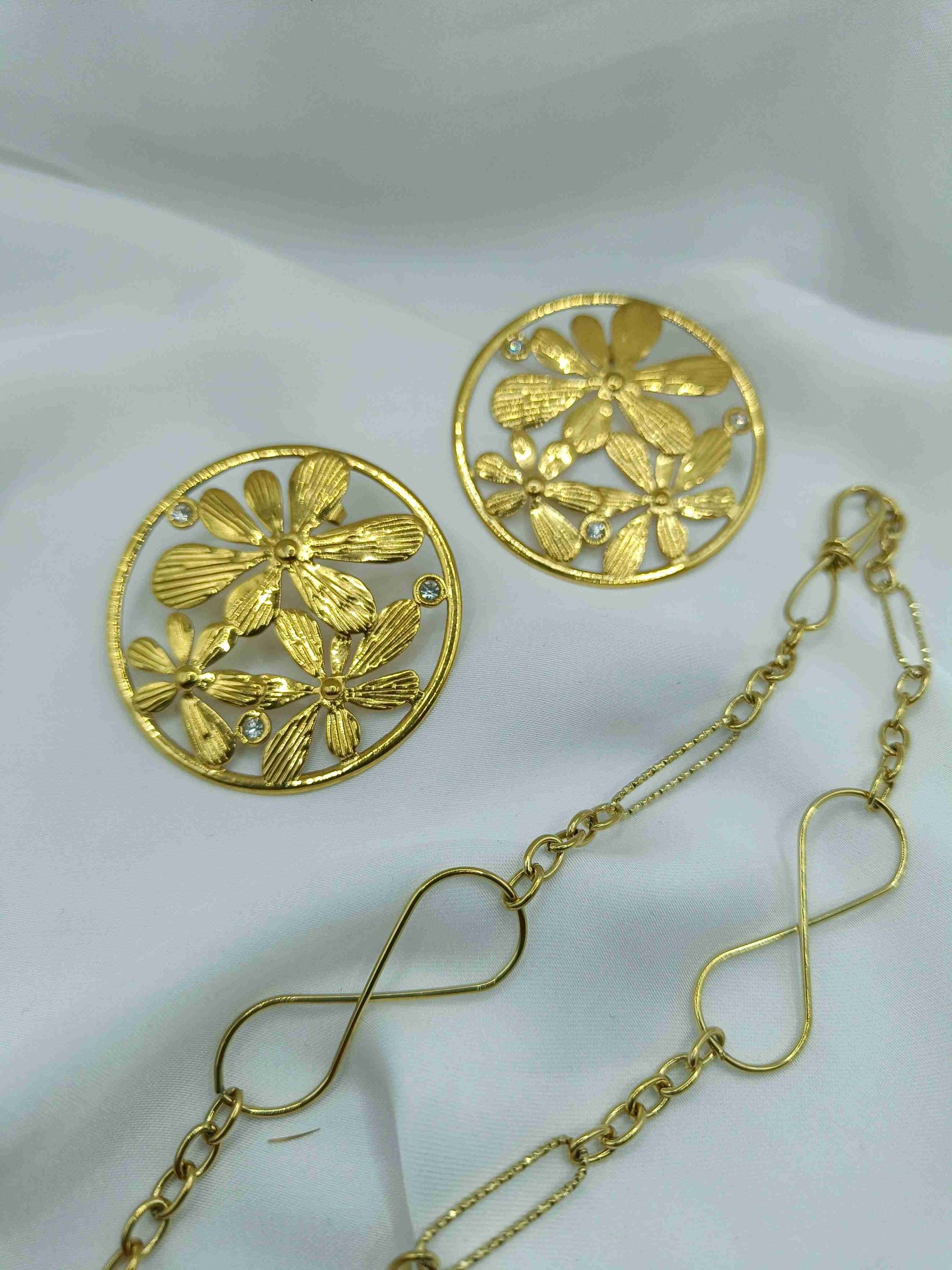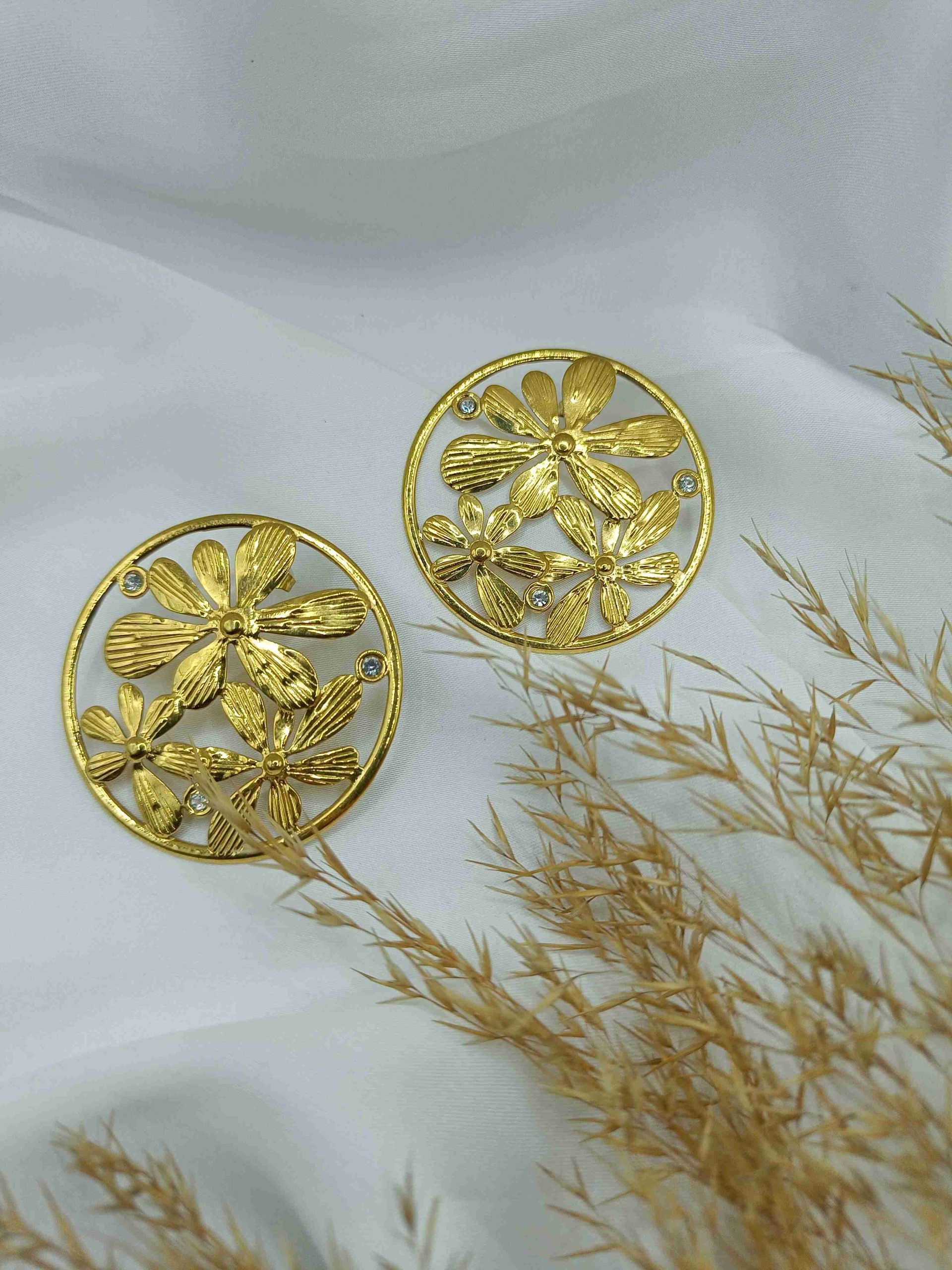 Τα σκουλαρίκια Margie αποτυπώνουν τη διαχρονική ομορφιά της μαργαρίτας, συμβολίζοντας αγνότητα, χαρά και ανεμελιά. Με στρογγυλό σχήμα και λεπτομέρειες που θυμίζουν ανθισμένα λουλούδια και τη λάμψη τριών στρογγυλών στρας, χαρίζουν ρομαντική και κομψή πινελιά σε κάθε εμφάνιση. Κατασκευασμένα από ανθεκτικό ατσάλι σε χρυσό χρώμα, είναι ιδανικά για λαμπερές εμφανίσεις.