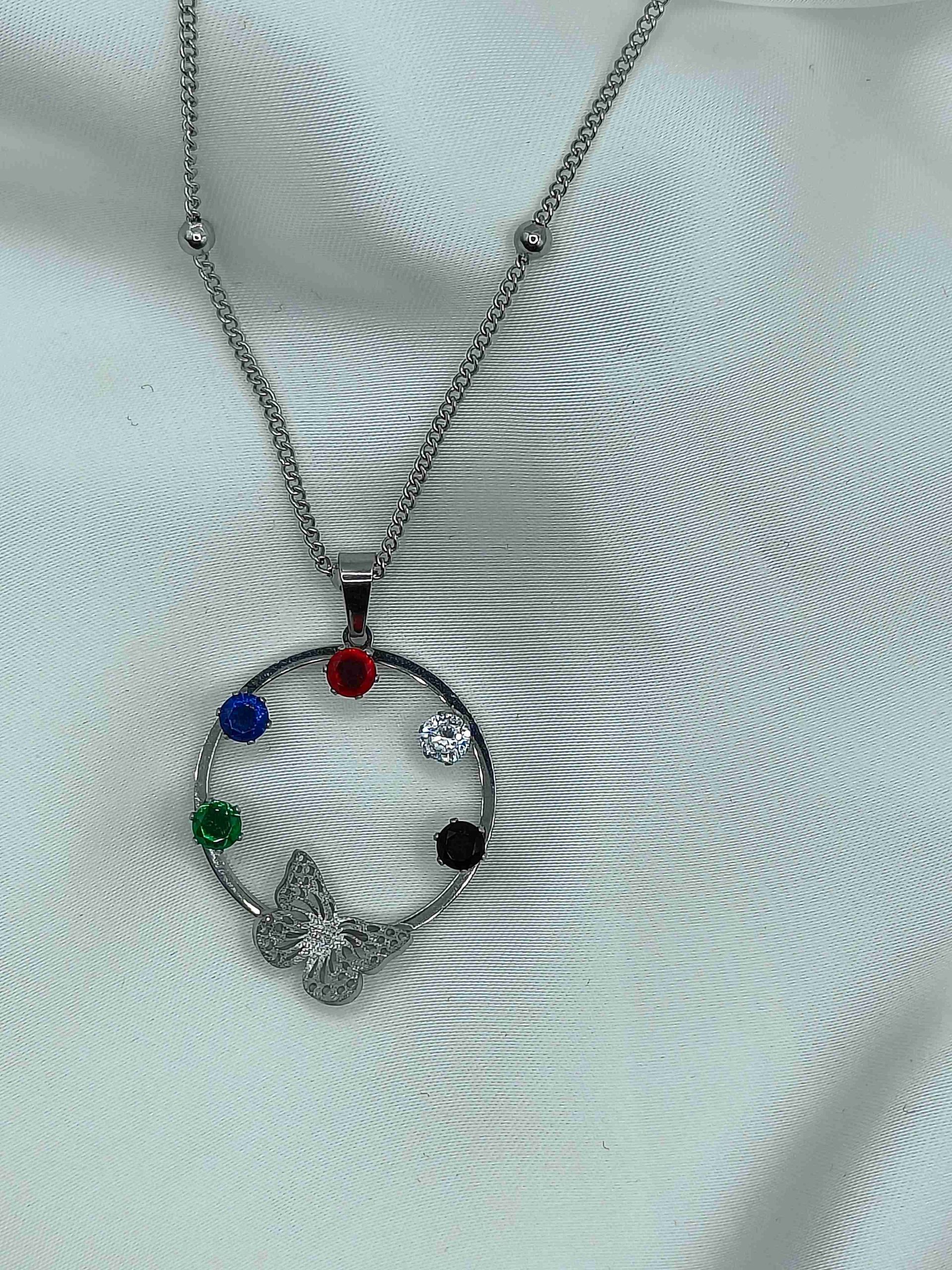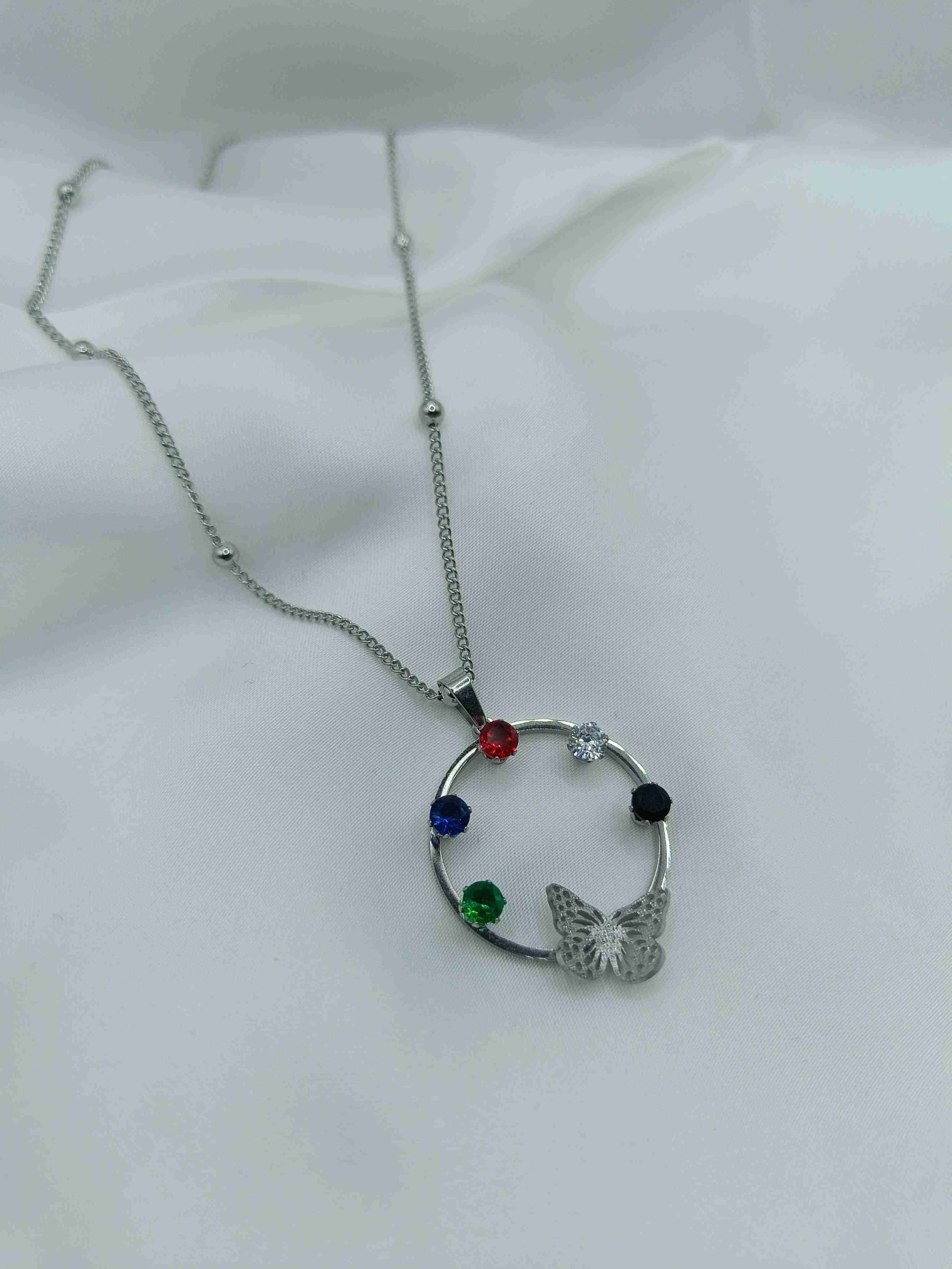 Ένα μαγευτικό κολιέ με πολύχρωμα στρας και λεπτεπίλεπτες πεταλούδες, που αποπνέει φρεσκάδα και κομψότητα. Η ιδιαίτερη αλυσίδα του, διακοσμημένη με μπίλιες, προσθέτει μια μοναδική πινελιά στο σχέδιο, κάνοντάς το ιδανικό για layering ή για να φορεθεί μόνο του ως statement piece.