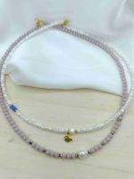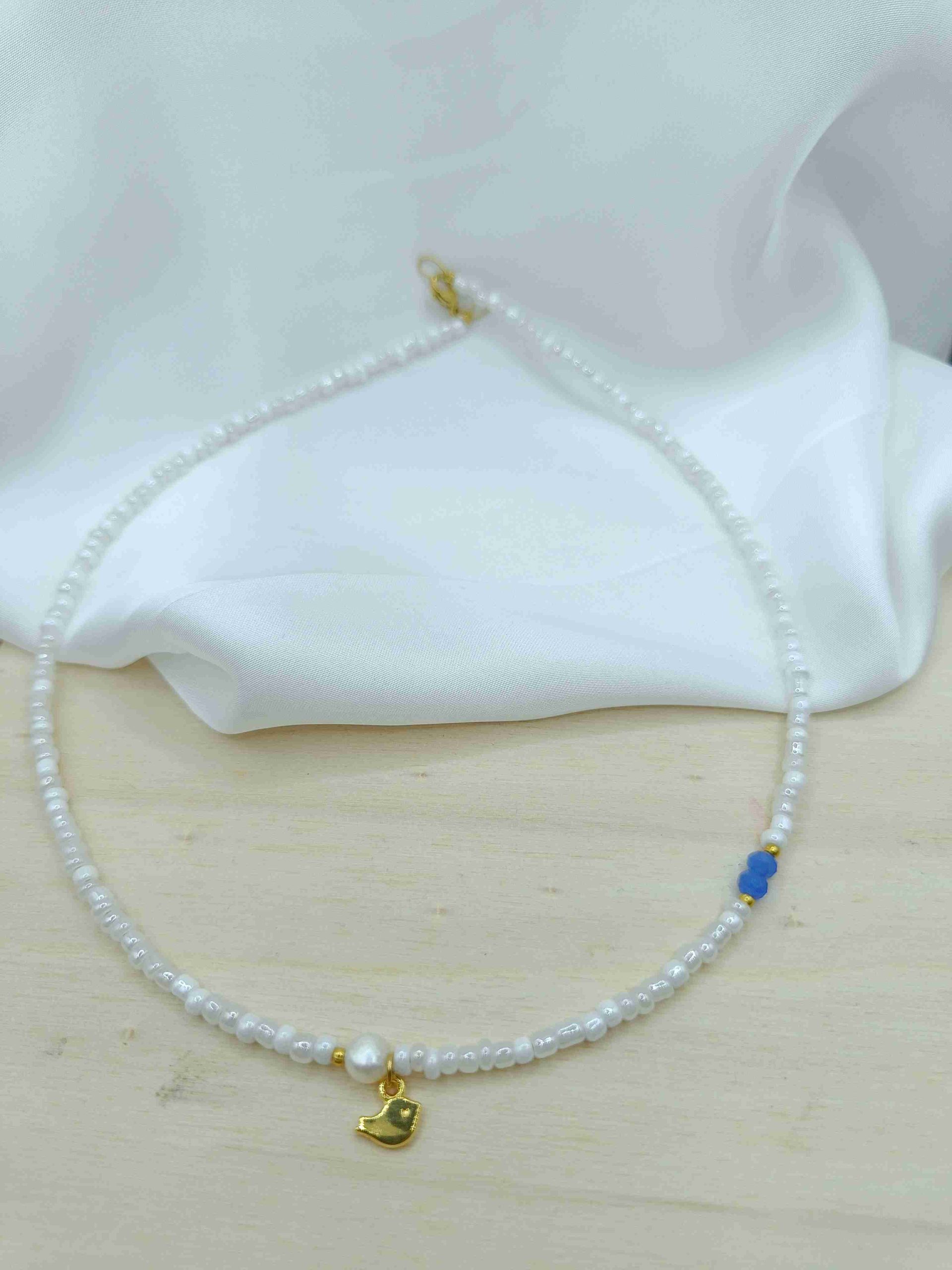 Καθαρό και αέρινο, το Miravie White συνδυάζει λευκές χάντρες με δύο γαλάζιες πινελιές στο πλάι — σαν ανάσα ουρανού μέσα στη μέρα. Στο κέντρο, ένα μικρό χρυσό πουλάκι αιωρείται απαλά, σύμβολο ελευθερίας, ελπίδας και χαράς.