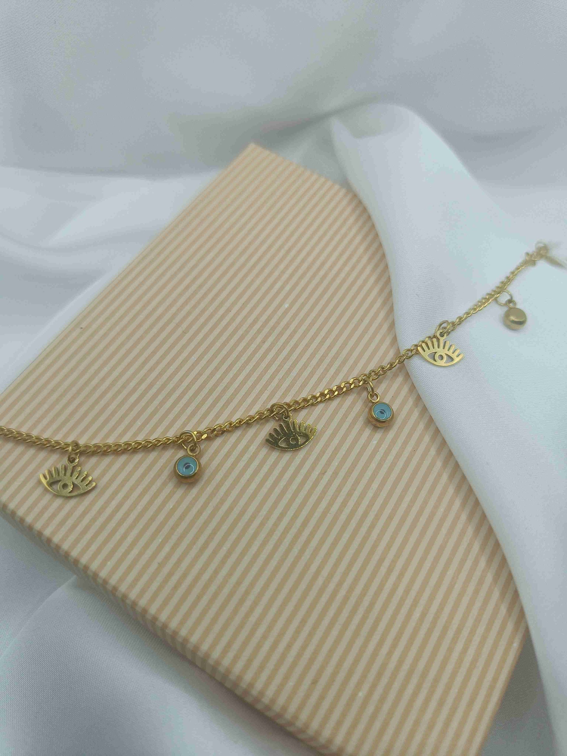 Χρυσό βραχιόλι από ανοξείδωτο ατσάλι με μεταλλικά κρεμαστά ματάκια και πολύχρωμα στρογγυλά ματάκια σε μορφή χαντρών, που προσθέτουν χειροποίητη αισθητική και παιχνιδιάρικη αύρα.