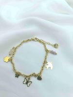 Το Myrina Charm είναι ένα βραχιόλι από ανοξείδωτο ατσάλι σε χρυσό χρώμα, γεμάτο συμβολισμούς και κομψή ανεμελιά. Οι λιλά και μπεζ χάντρες συνδυάζονται υπέροχα με πέντε μοναδικά κρεμαστά στοιχεία: ένα χελιδόνι που φέρνει ανανέωση, μια καρδιά για αγάπη, ένα αστέρι που συμβολίζει την ελπίδα, μια πεταλούδα για μεταμόρφωση και ένα λουλούδι που ανθίζει όπως εσύ. Ένα κόσμημα που σε ακολουθεί στις μέρες που θέλεις να νιώσεις πιο ανάλαφρη, πιο εσύ.