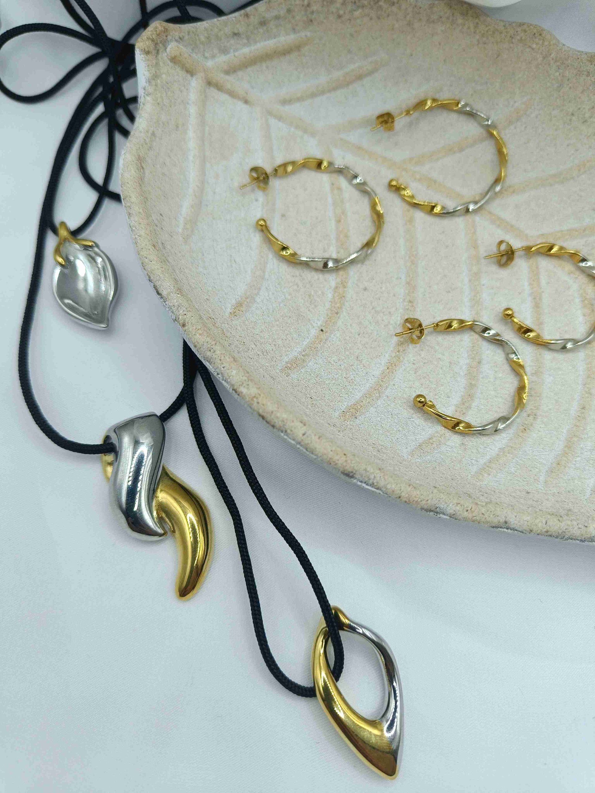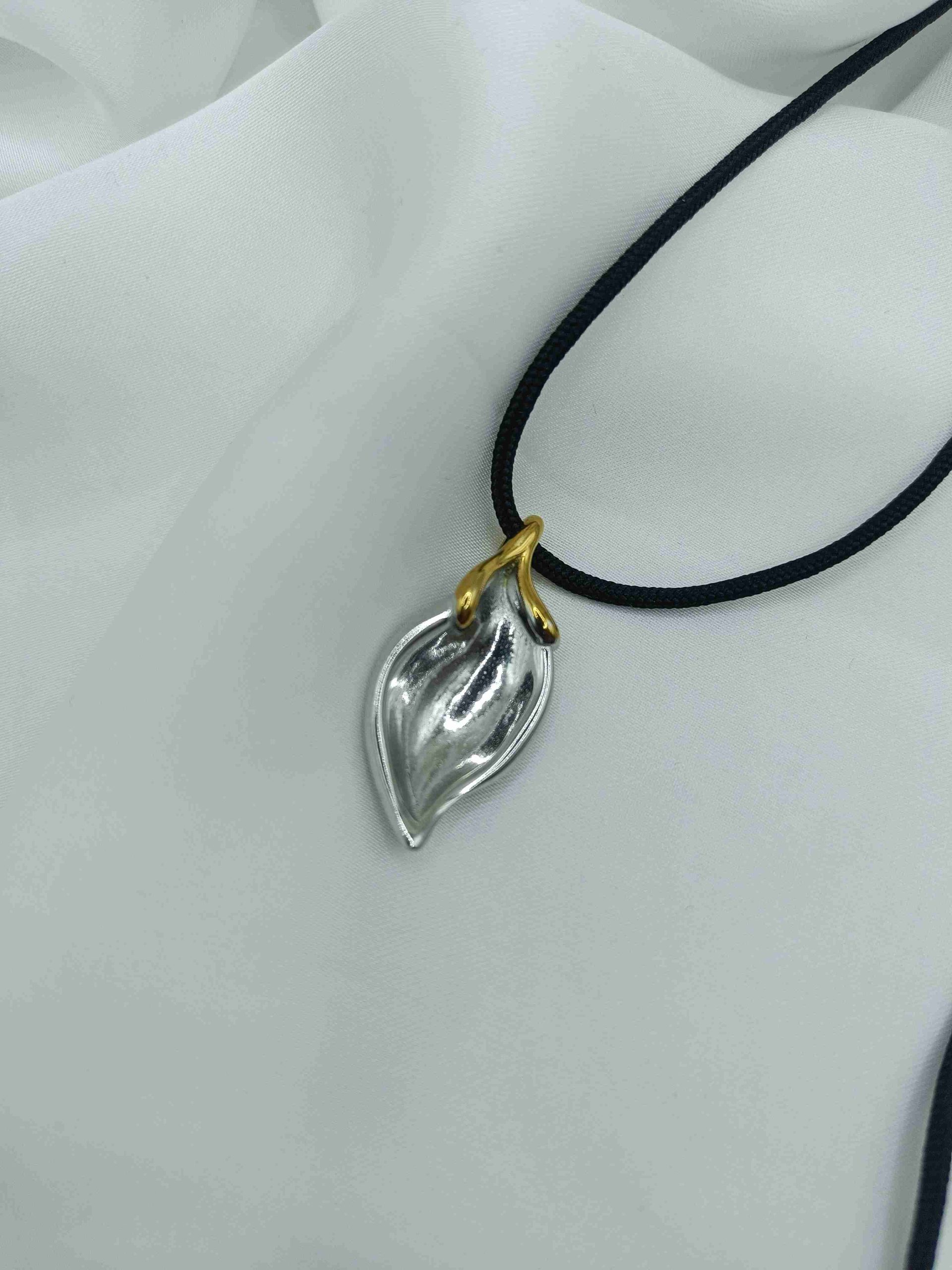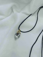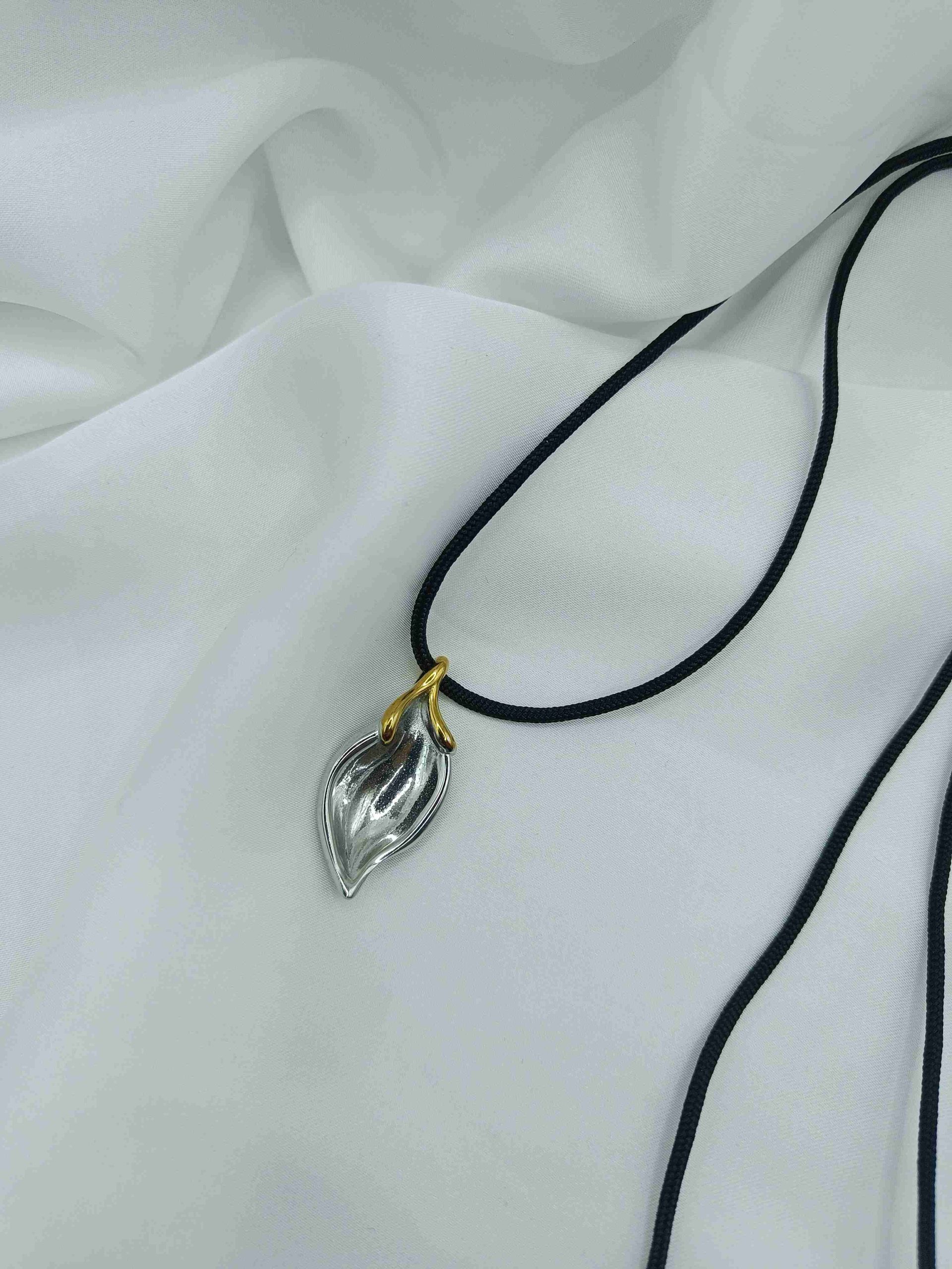 Το Nayora Caelum αποπνέει αίσθηση ελευθερίας και διακριτικής δύναμης. Το μεταλλικό φύλλο σε ασημί χρώμα με χρυσή λεπτομέρεια στην κορυφή αποτυπώνει τη σύνδεση ουρανού και γης — μία υπενθύμιση της φυσικής ομορφιάς που μας περιβάλλει. Δεμένο σε μαύρο κορδόνι, αυτό το κολιέ εκπέμπει μία ήρεμη, αιθέρια κομψότητα.