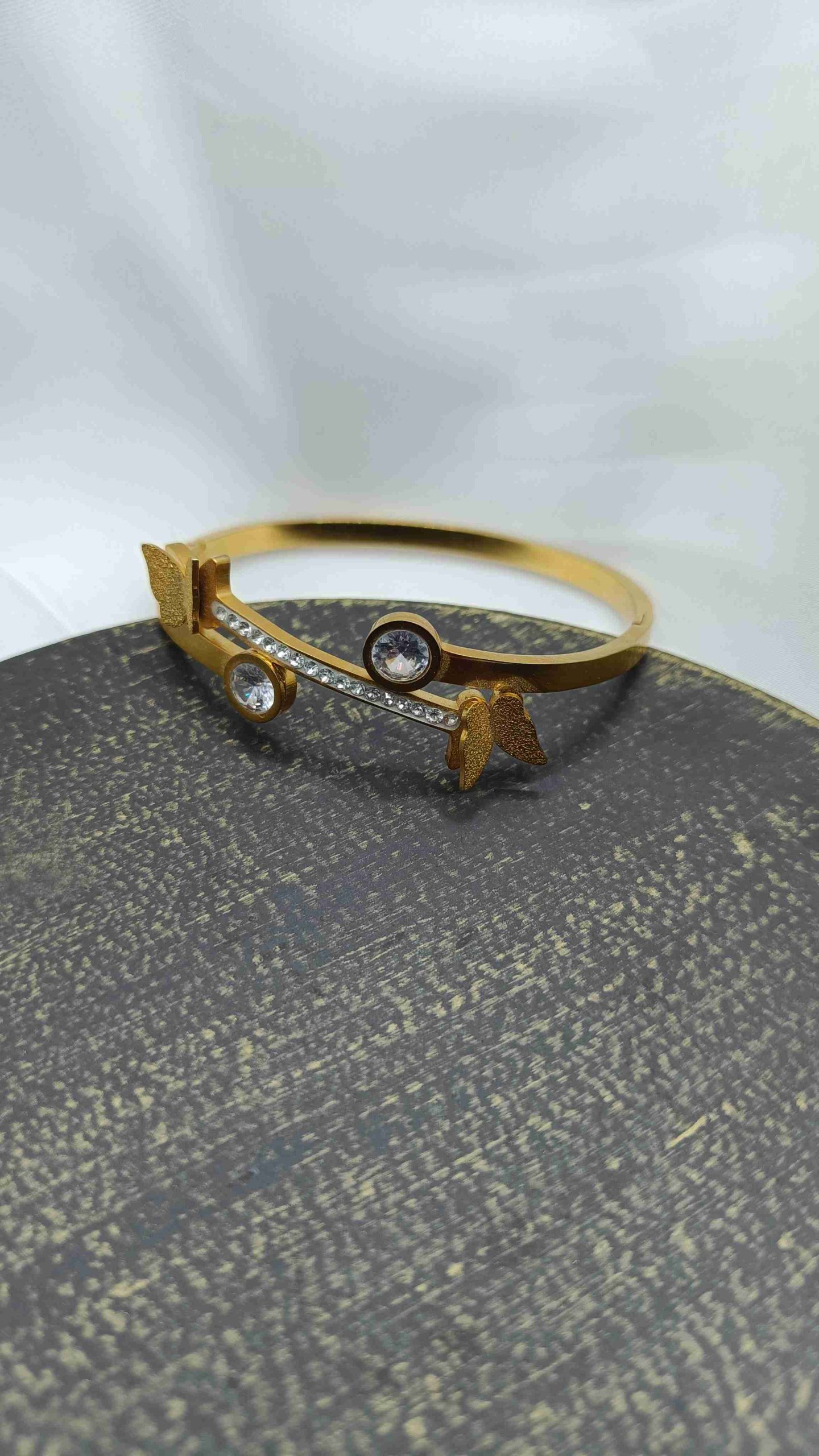 Ένα κομψό και αέρινο ατσάλινο βραχιόλι, διακοσμημένο με μικρά και δύο μεγαλύτερα λαμπερά στρας, που θυμίζουν τις αντανακλάσεις του φωτός στο νερό. Οι ανάγλυφες, sparkly πεταλούδες προσθέτουν μια παιχνιδιάρικη αλλά εκλεπτυσμένη πινελιά, συμβολίζοντας την ελευθερία και τη μεταμόρφωση.